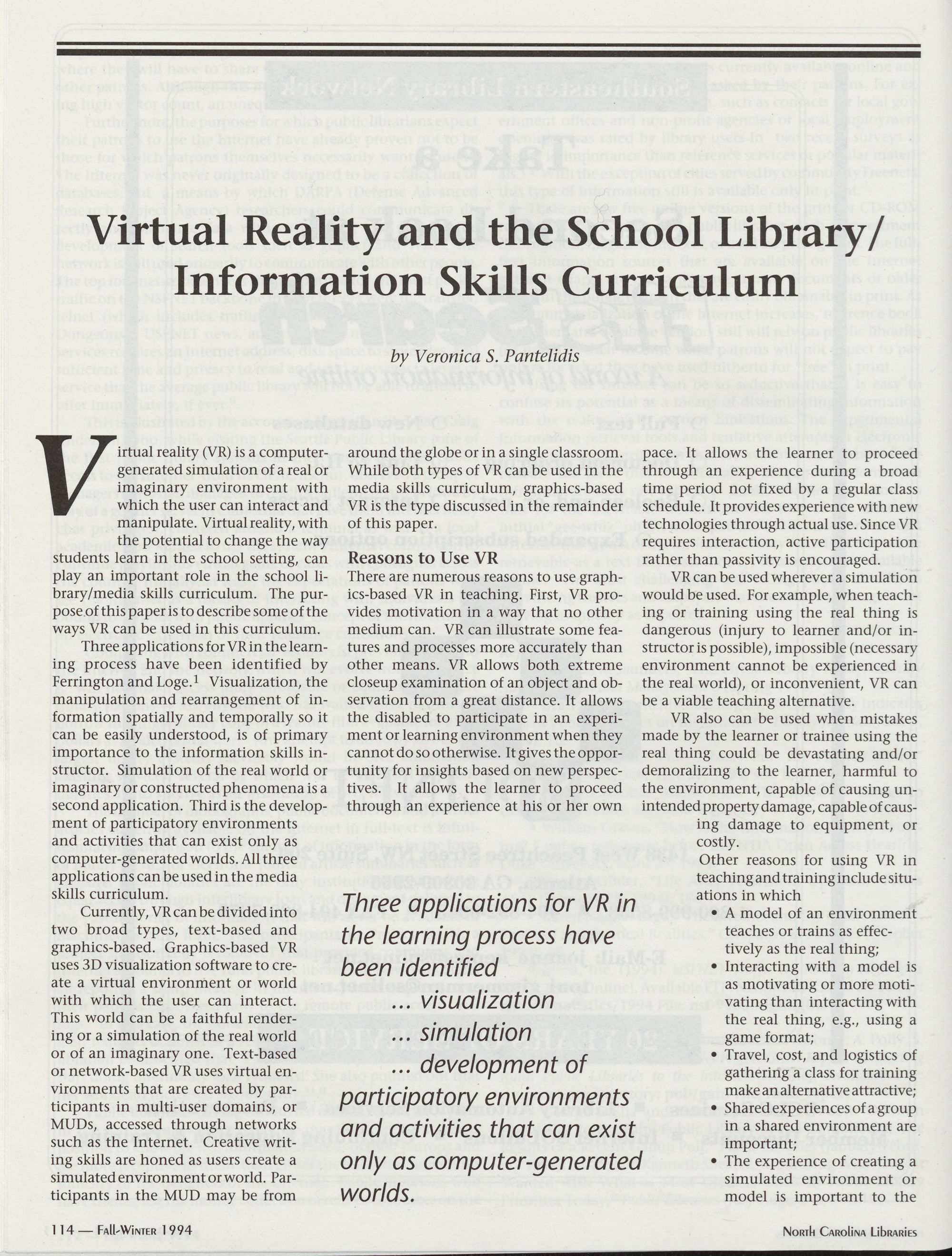a 14 ~Virtual Reality and the School Library/Media Skills Curriculum, Veronica S. Pantelidis