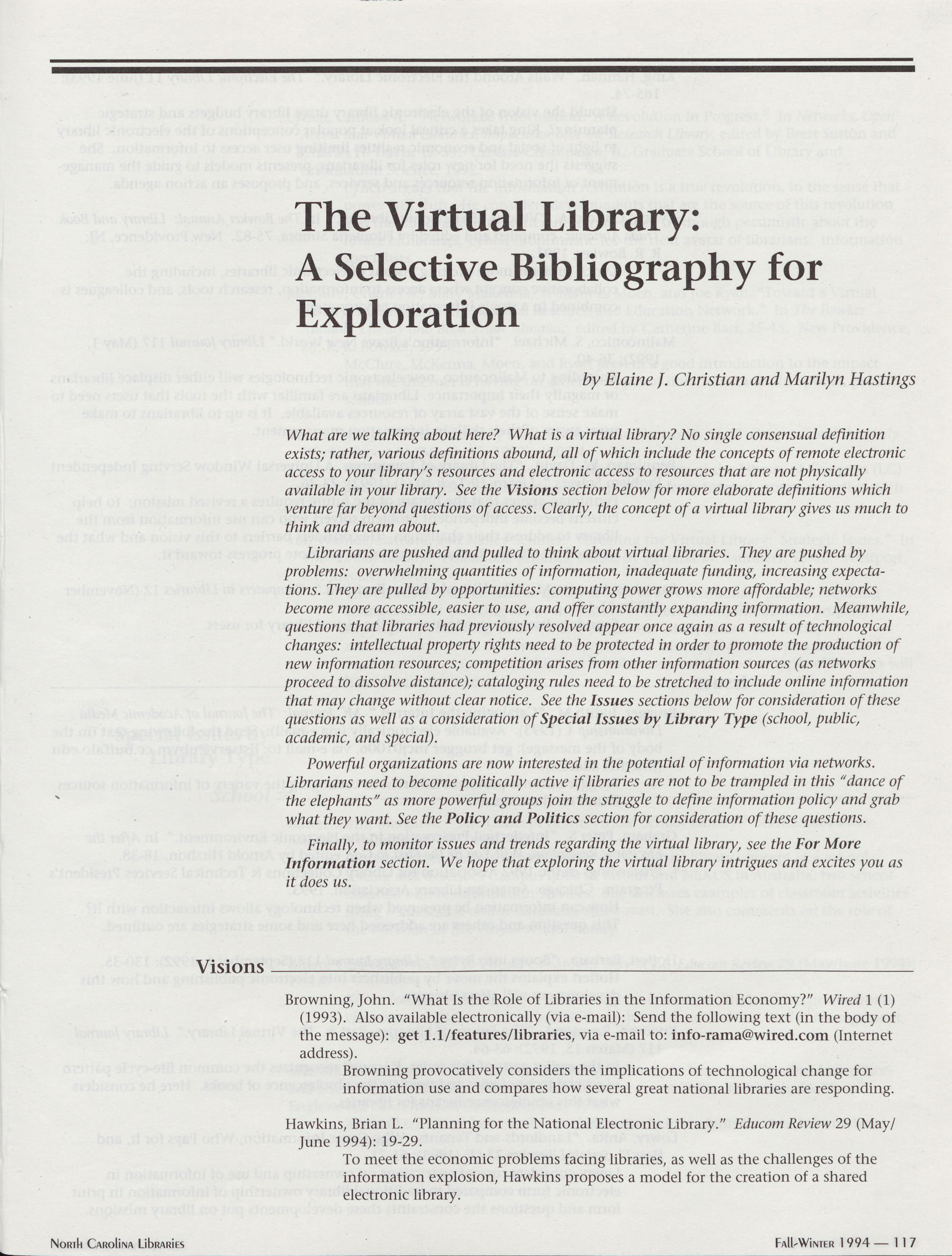 117 The Virtual Library: A Selective Bibliography for Exploration,