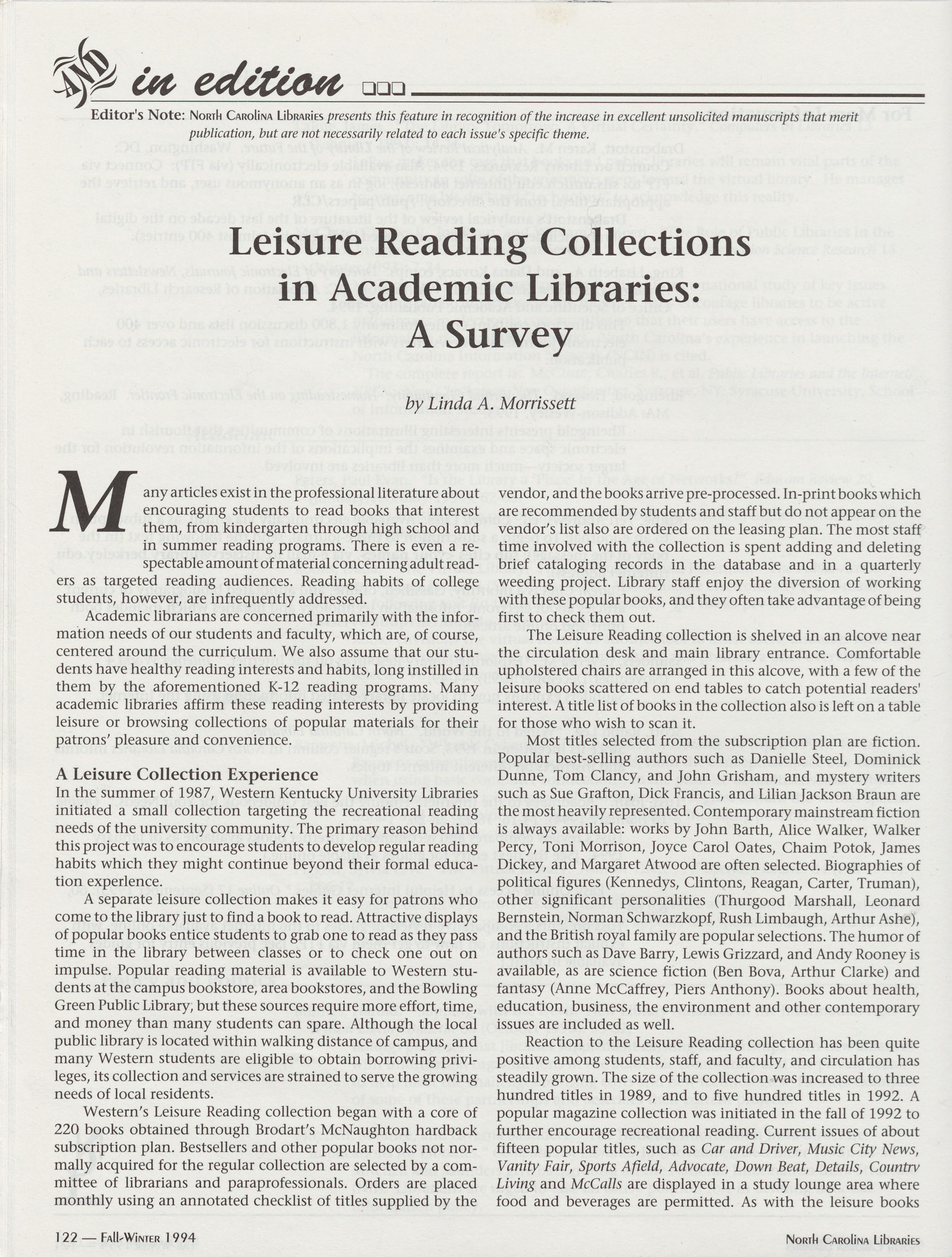 122 & In Edition: Leisure Reading Collections in Academic Libraries, Linda A. Morrissett