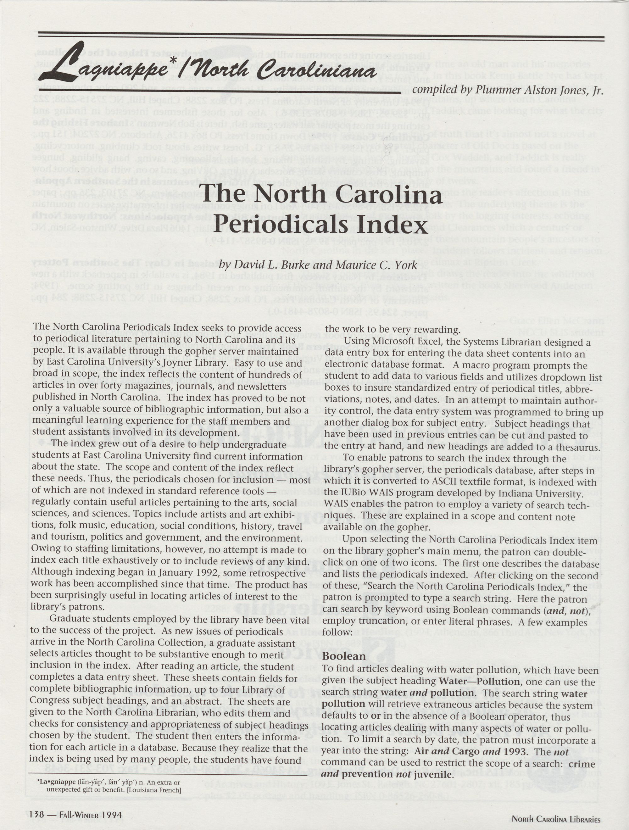 138 Lagniappe: North Carolina Periodicals Index, David L. Burke and Maurice C. York