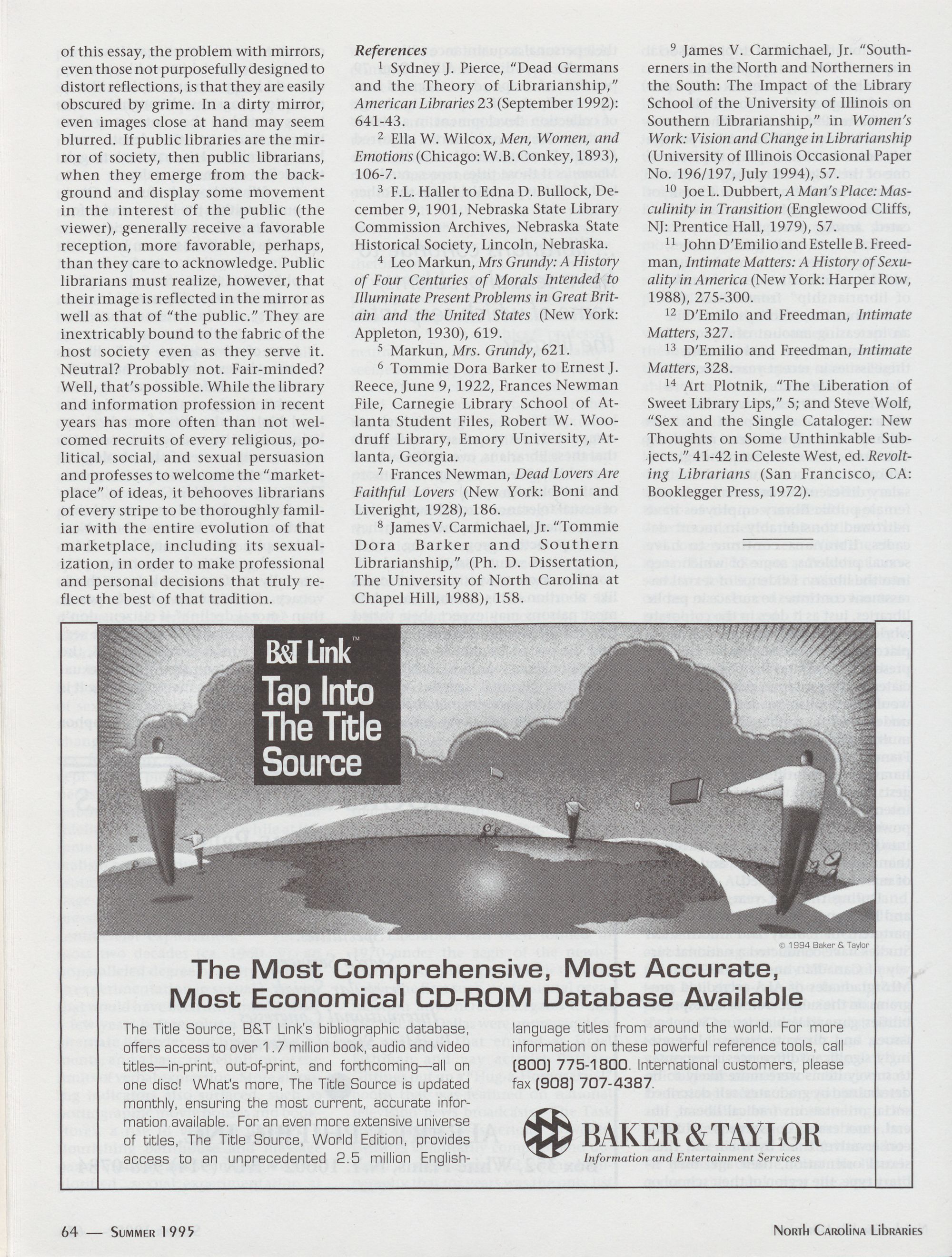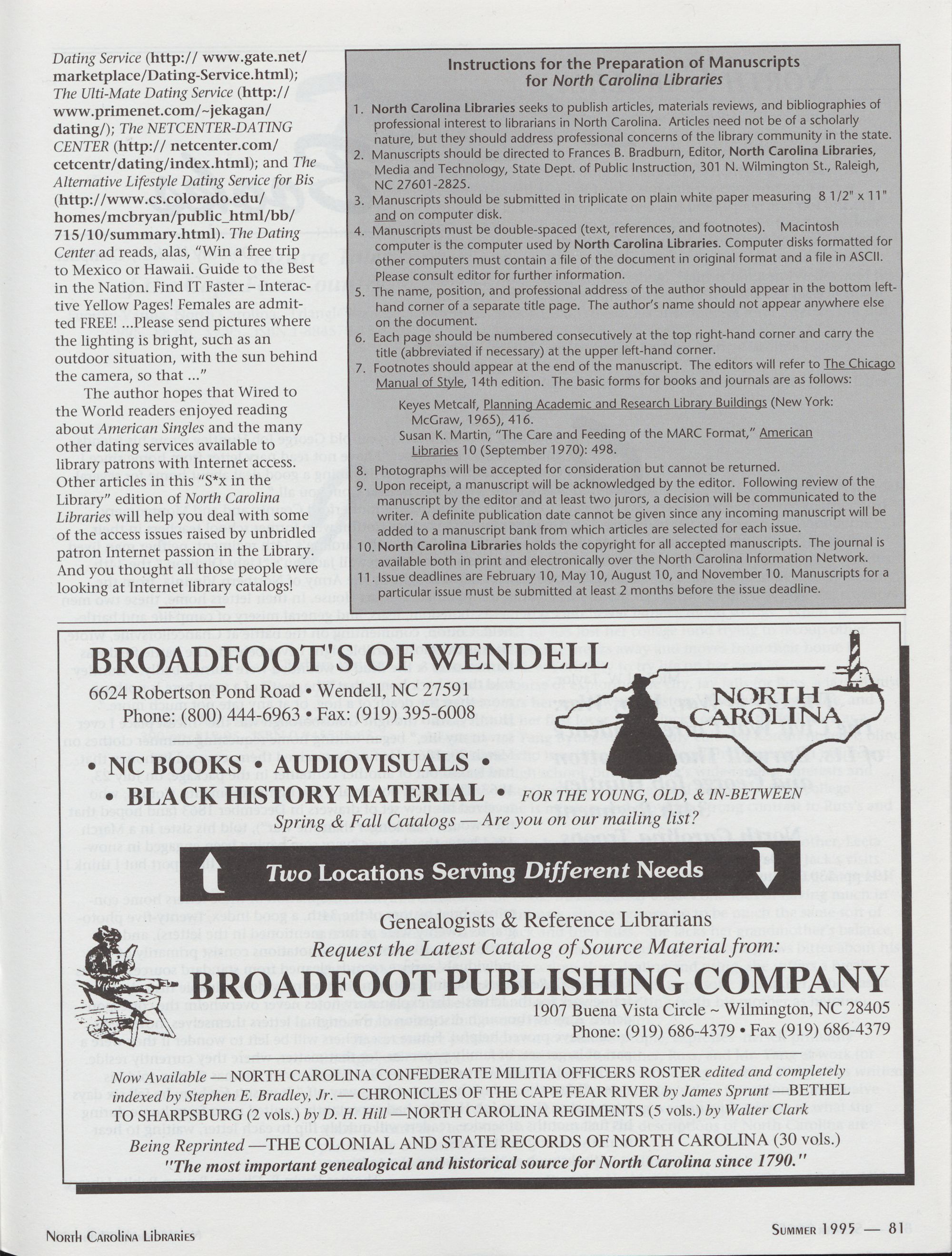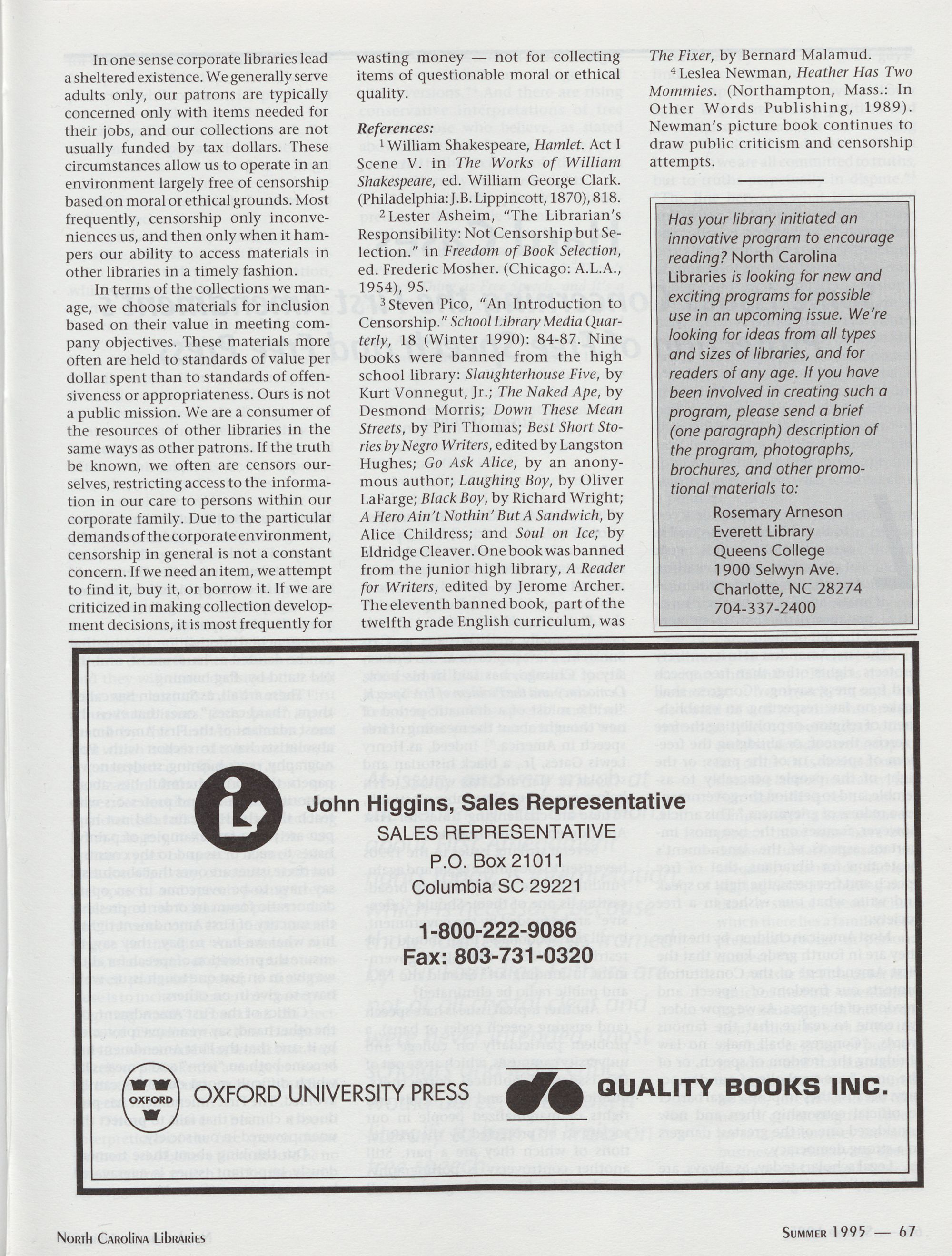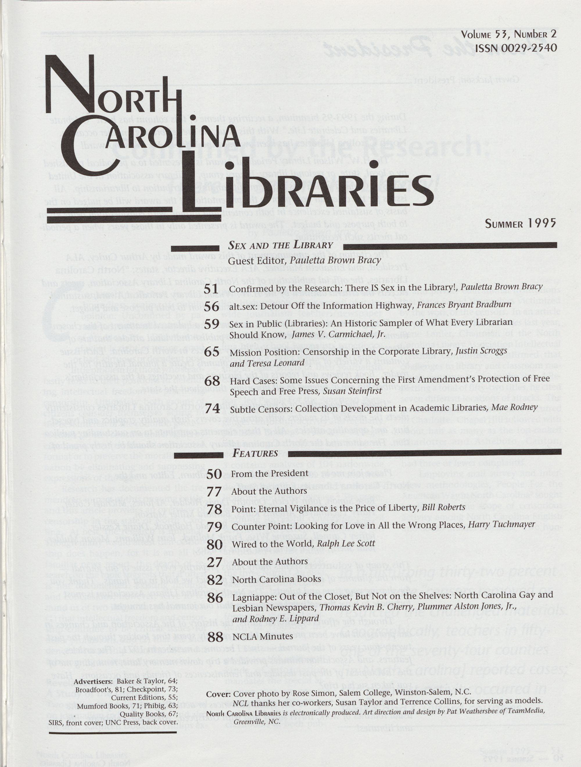 Quality Books, 67; North Carolina Libraries is electronically produced. Art direction and design by Pat Weathersbee of TeamMedia,