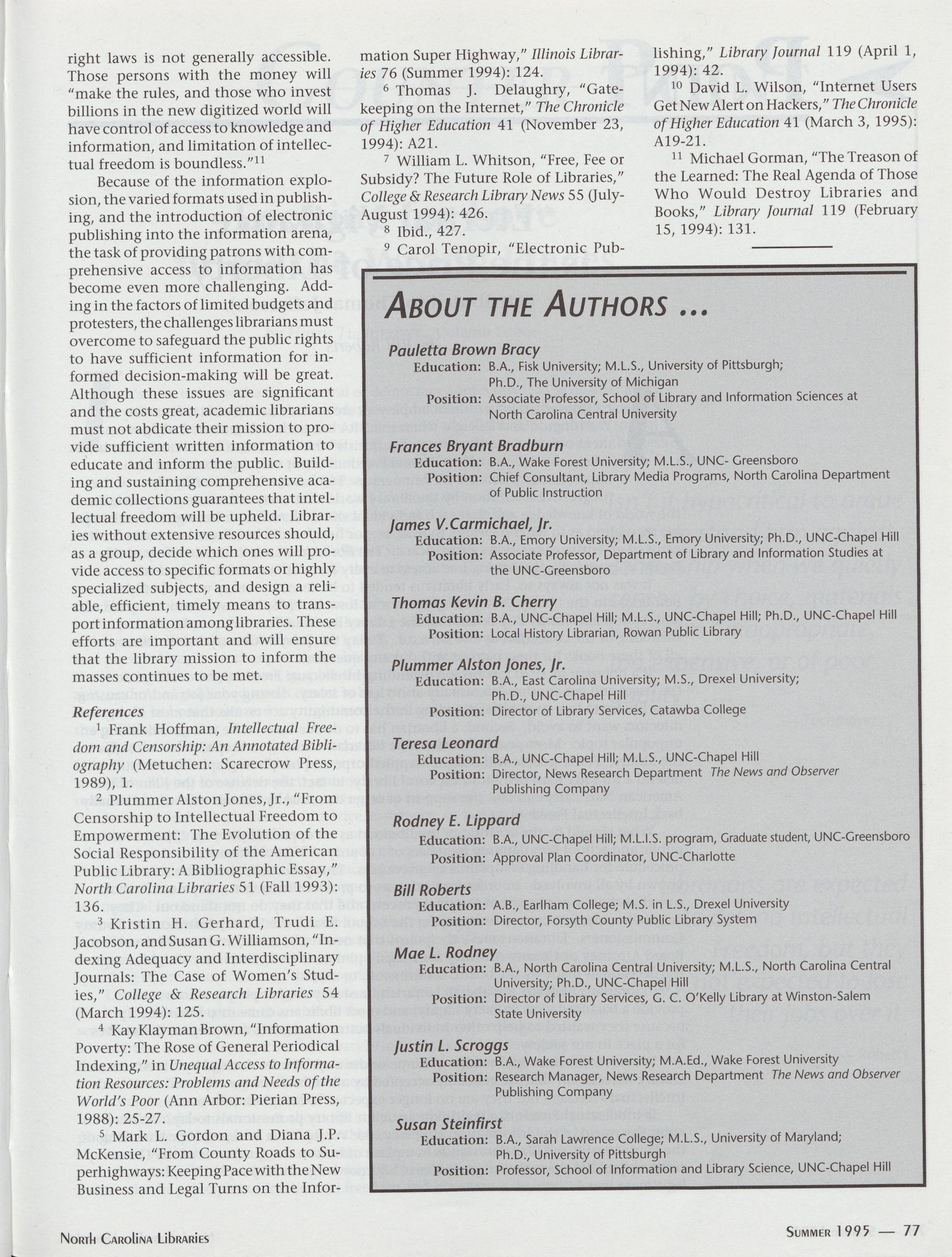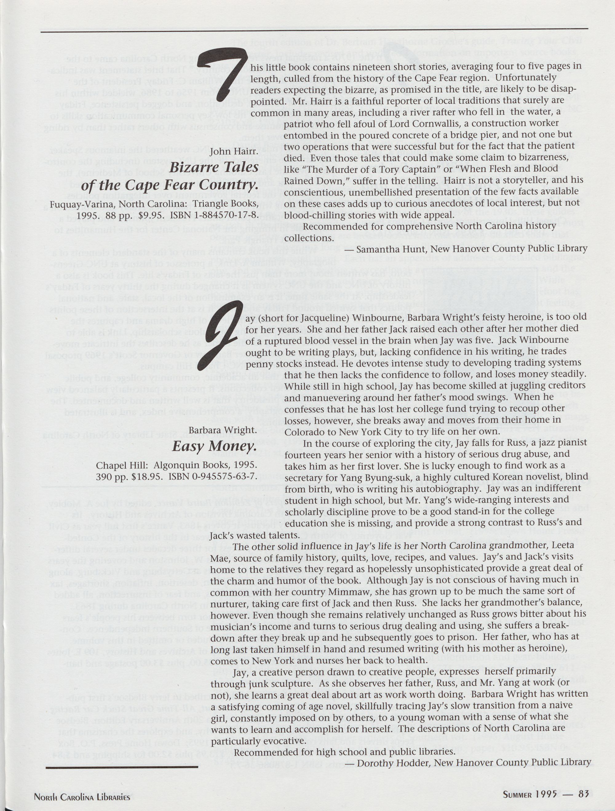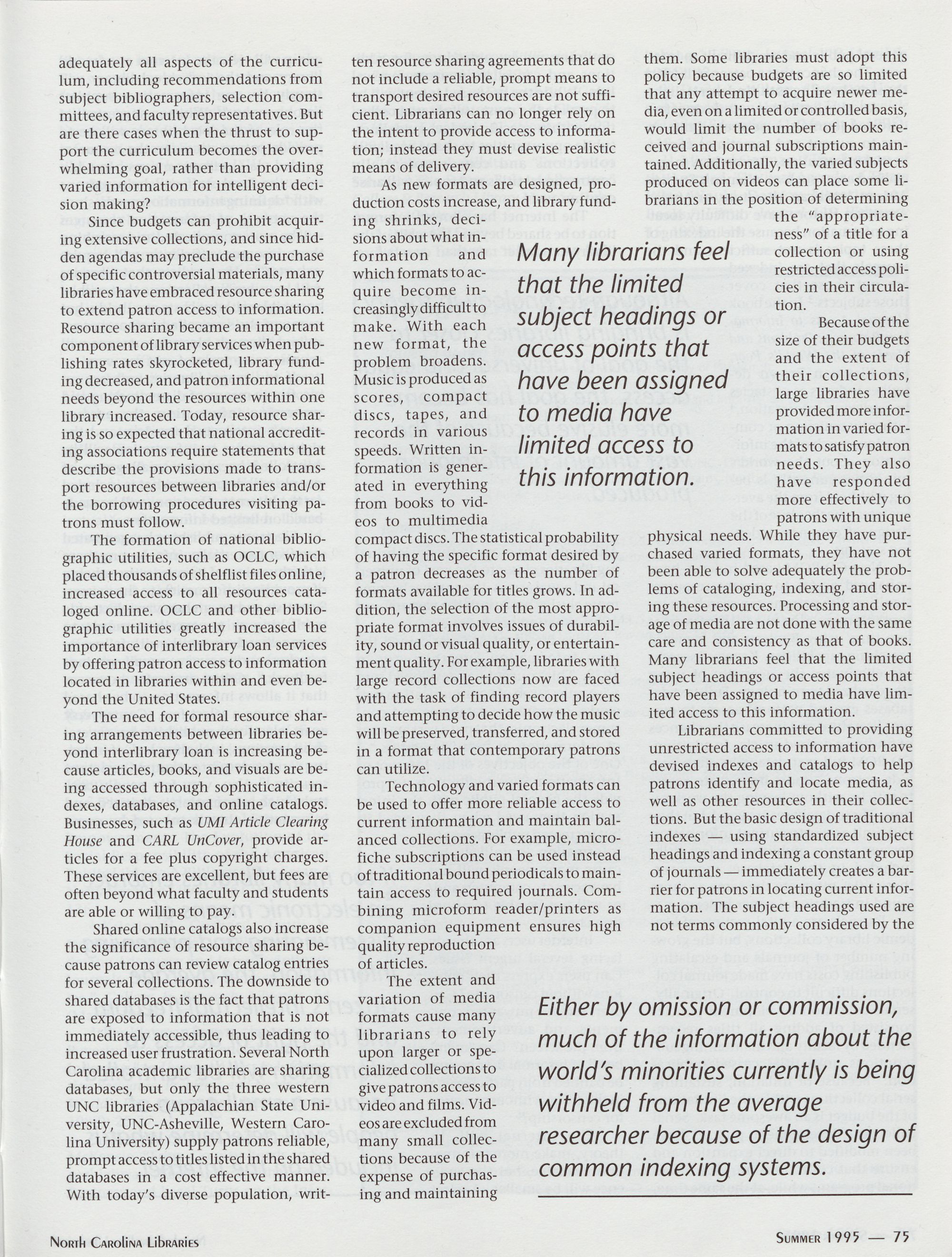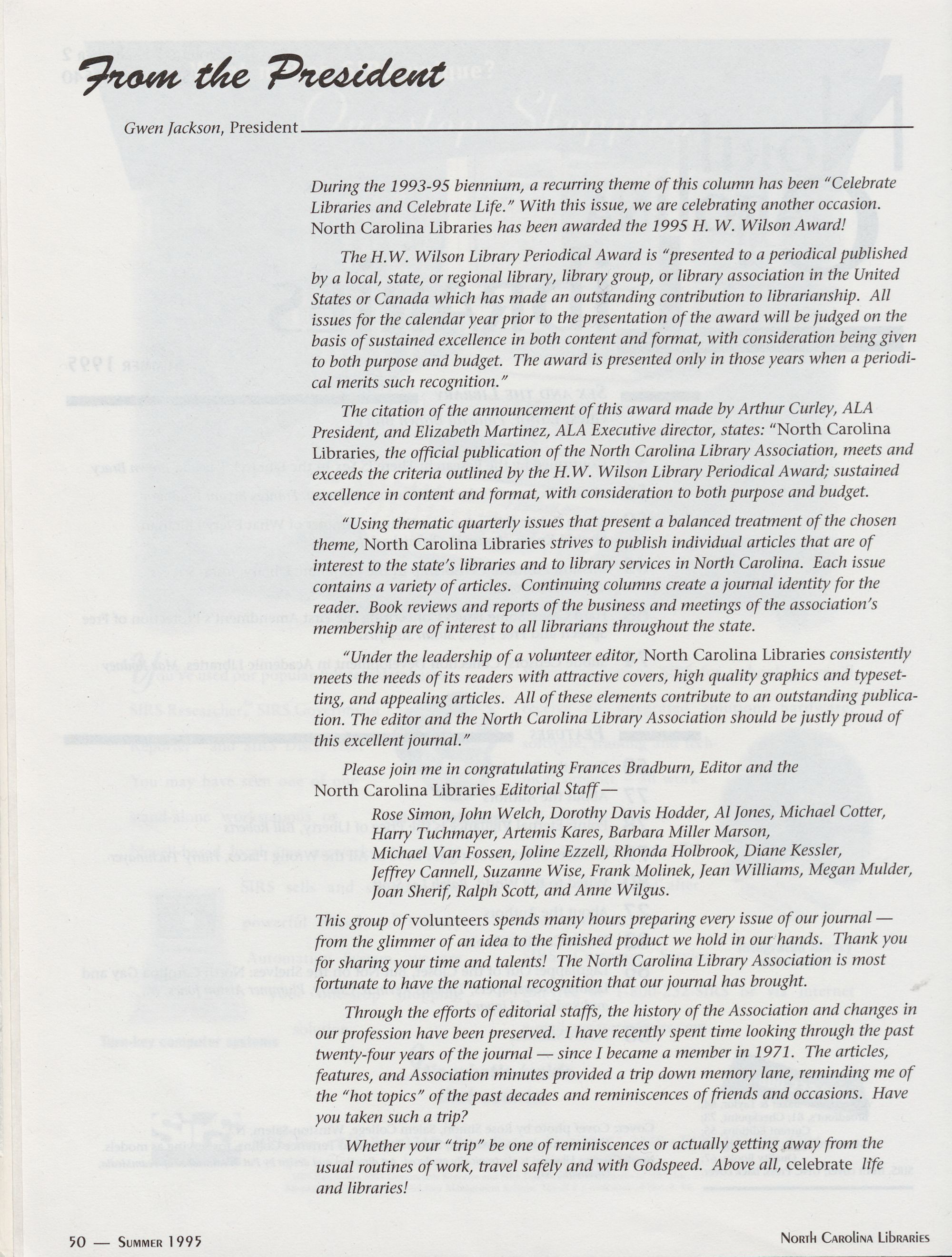 North Carolina Libraries has been awarded the 1995 H. W. Wilson Award!