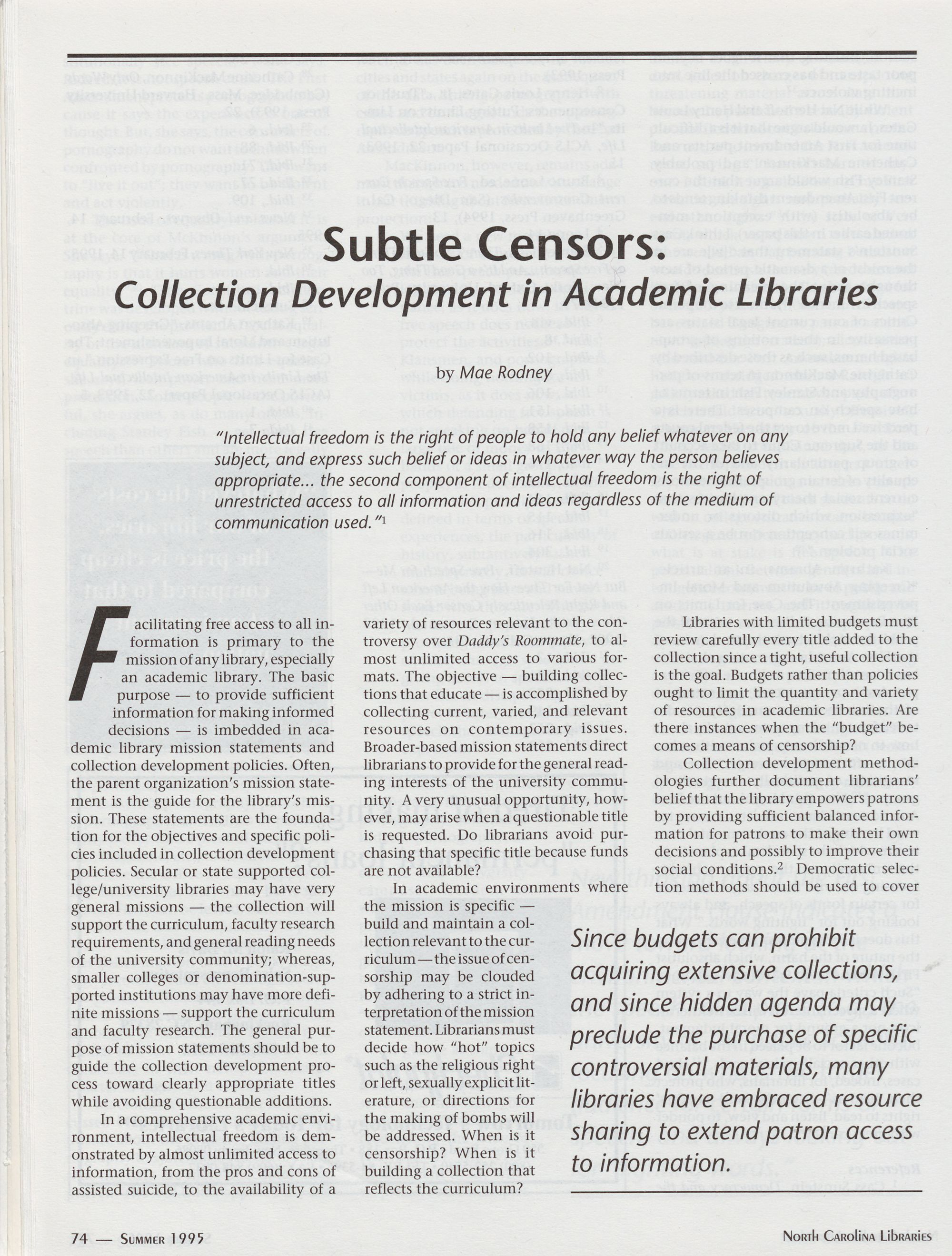 Subtle Censors: Collection Development in Academic Libraries, Mae Rodney