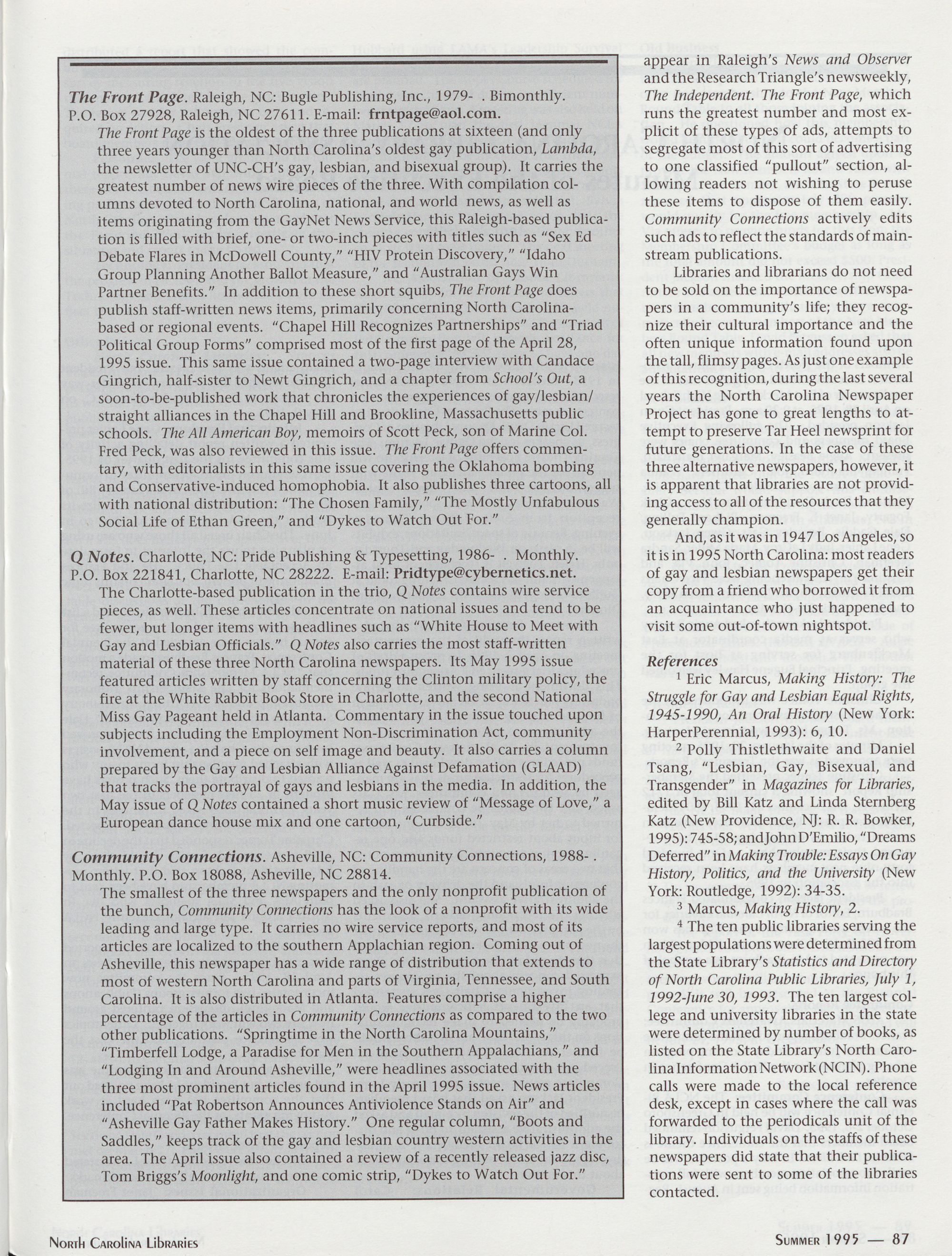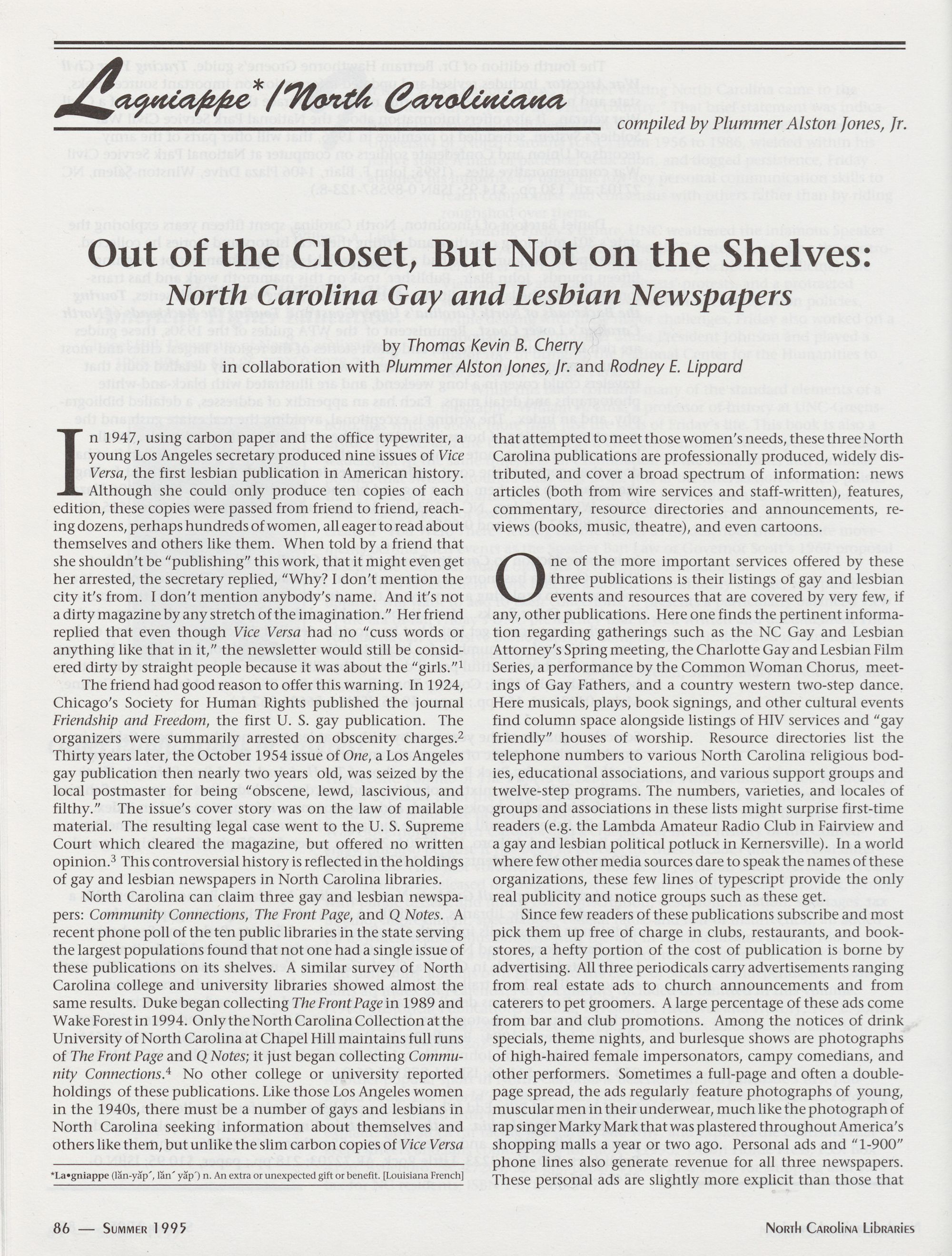 Lagniappe: Out of the Closet, But Not on the Shelves: North Carolina Gay and