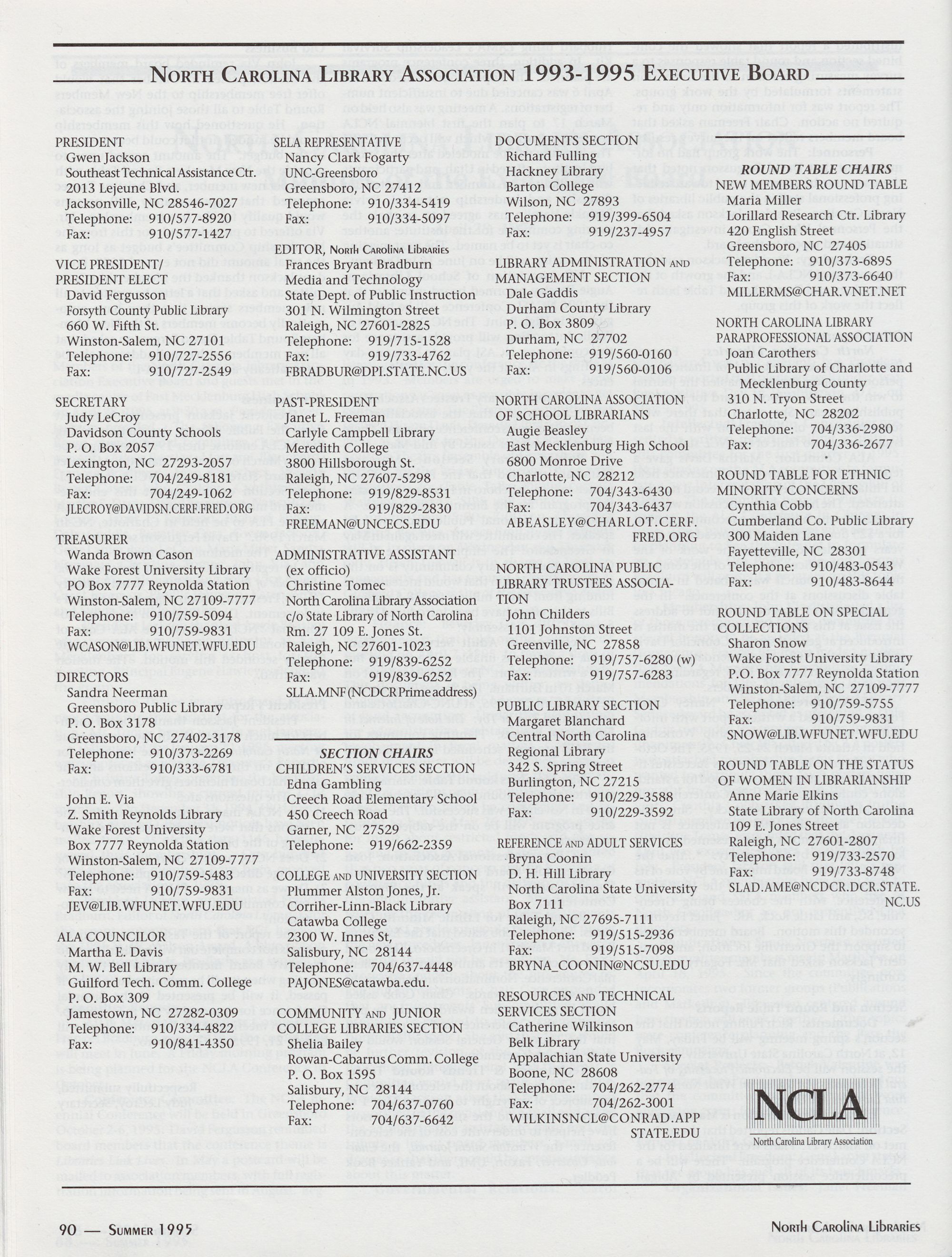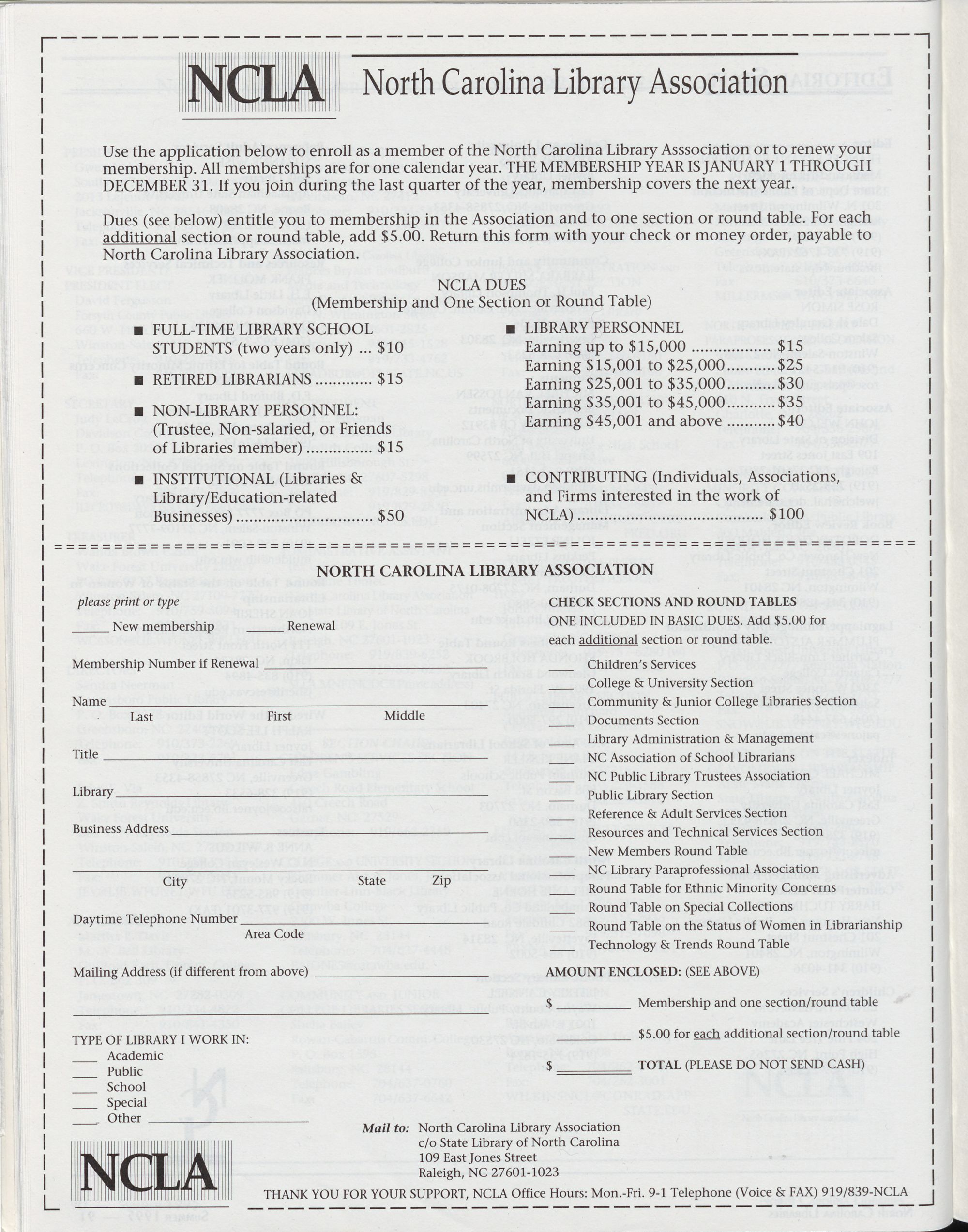 Carolina Library Association. Membership dues include a subscription to North Carolina