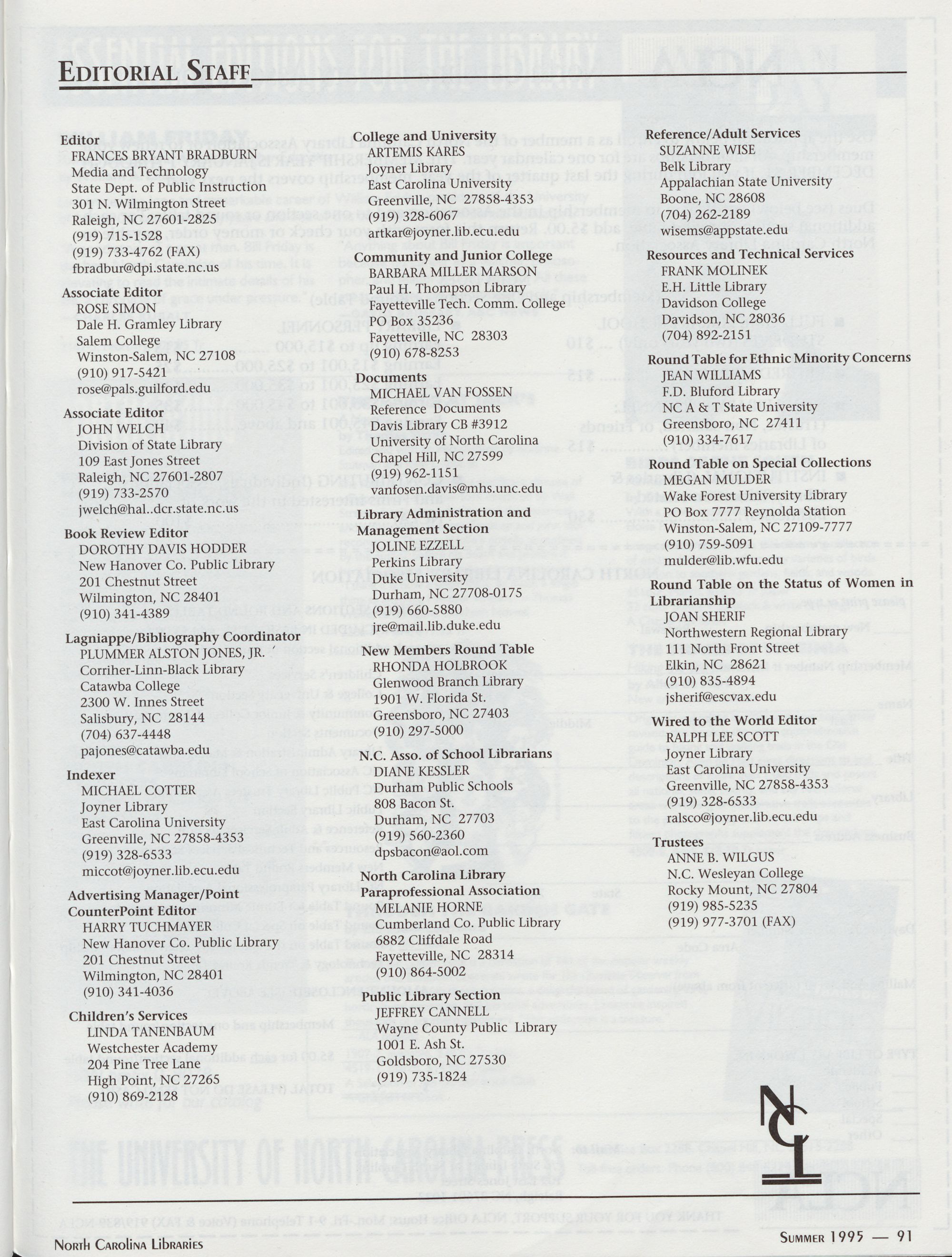 North Carolina Libraries, published four times a year, is the official publication of the North