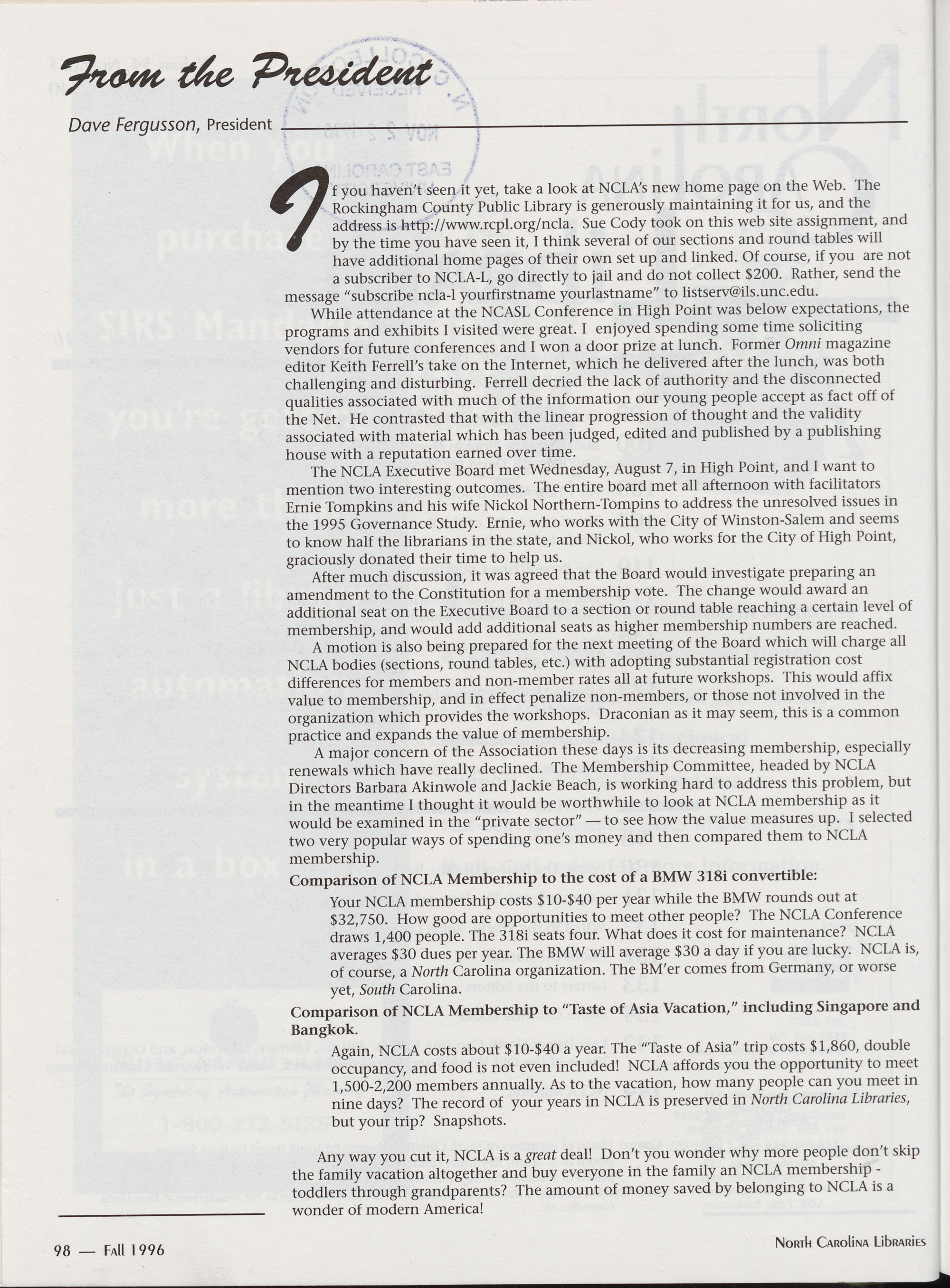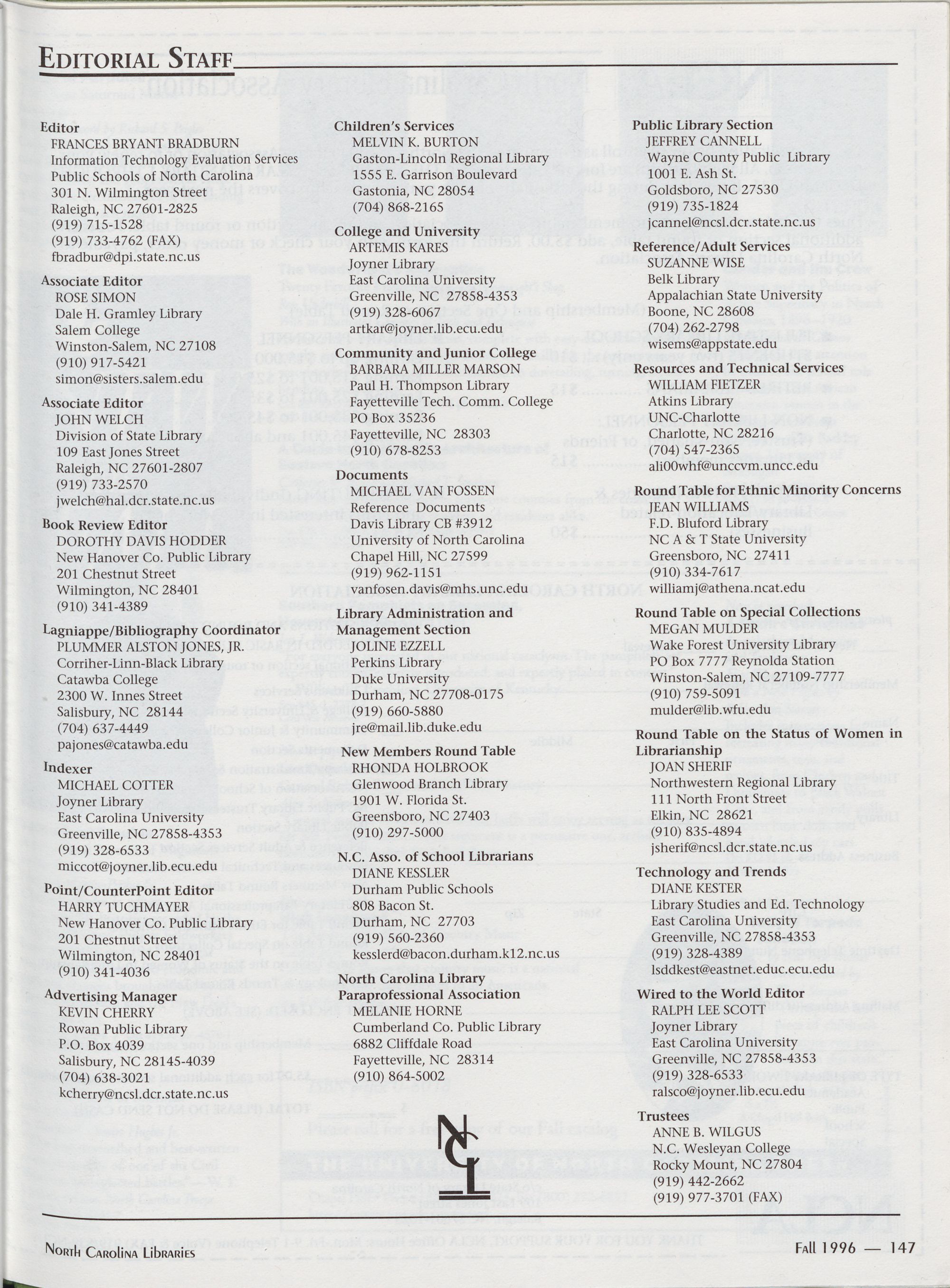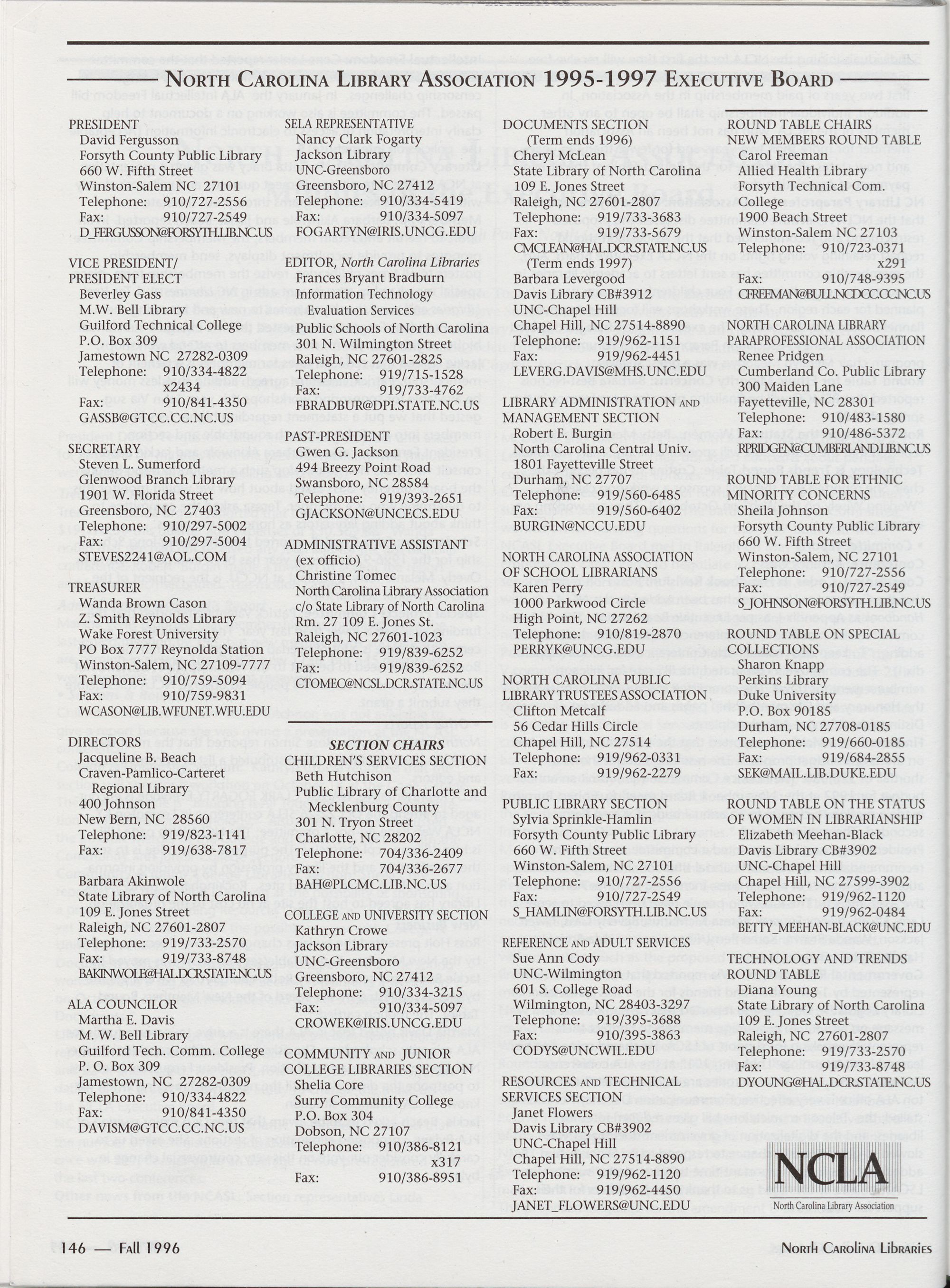Carolina Library Association. Membership dues include a subscription to North Carolina