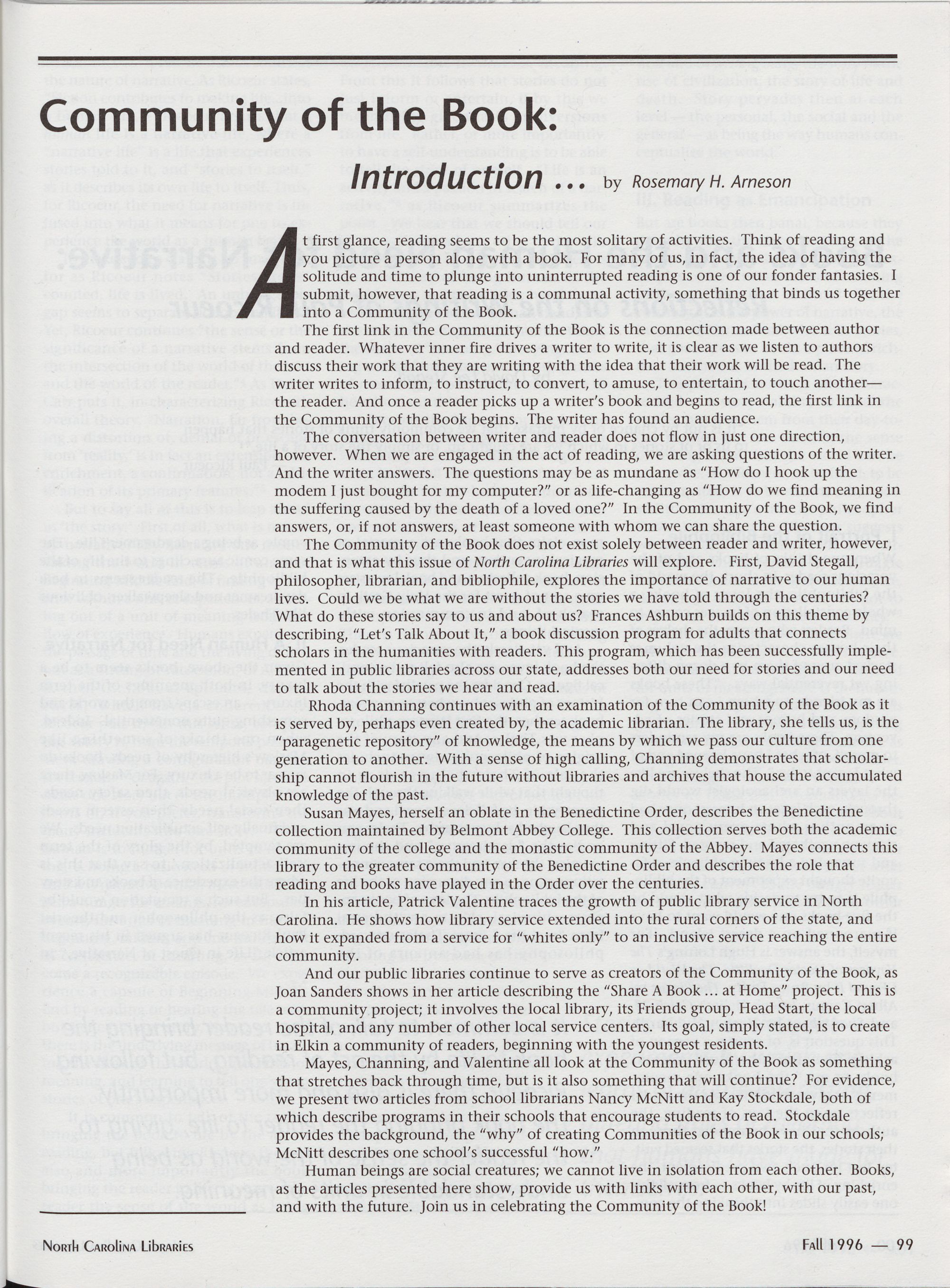 99 Community of the Book: Introduction, Rosemary H. Arneson