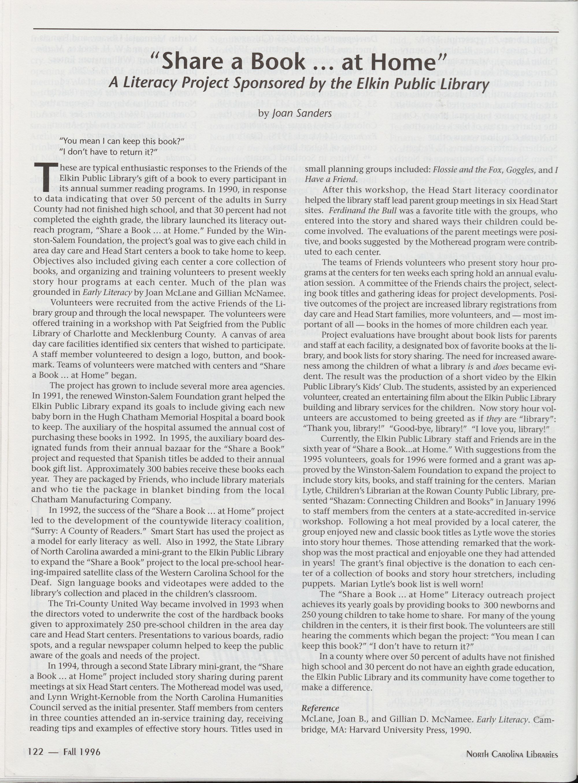 122 oShare a Book ... at Home� A Literacy Project Sponsored by the Elkin Public