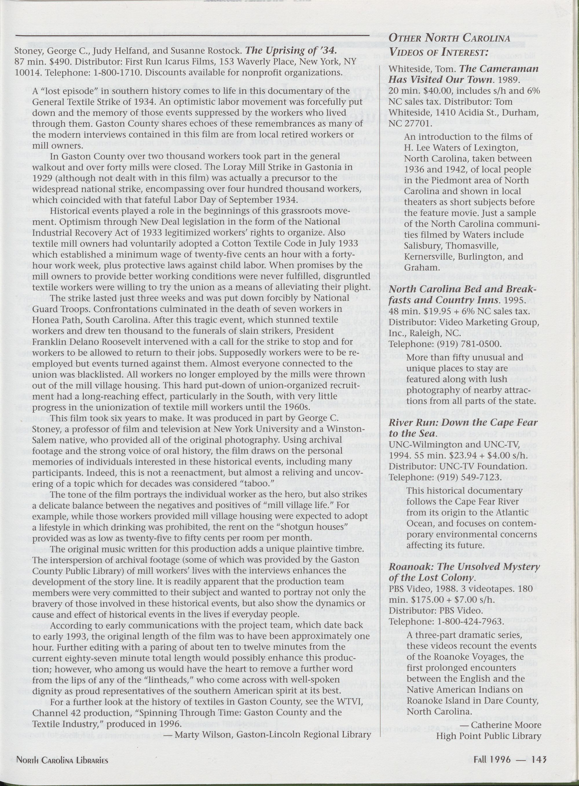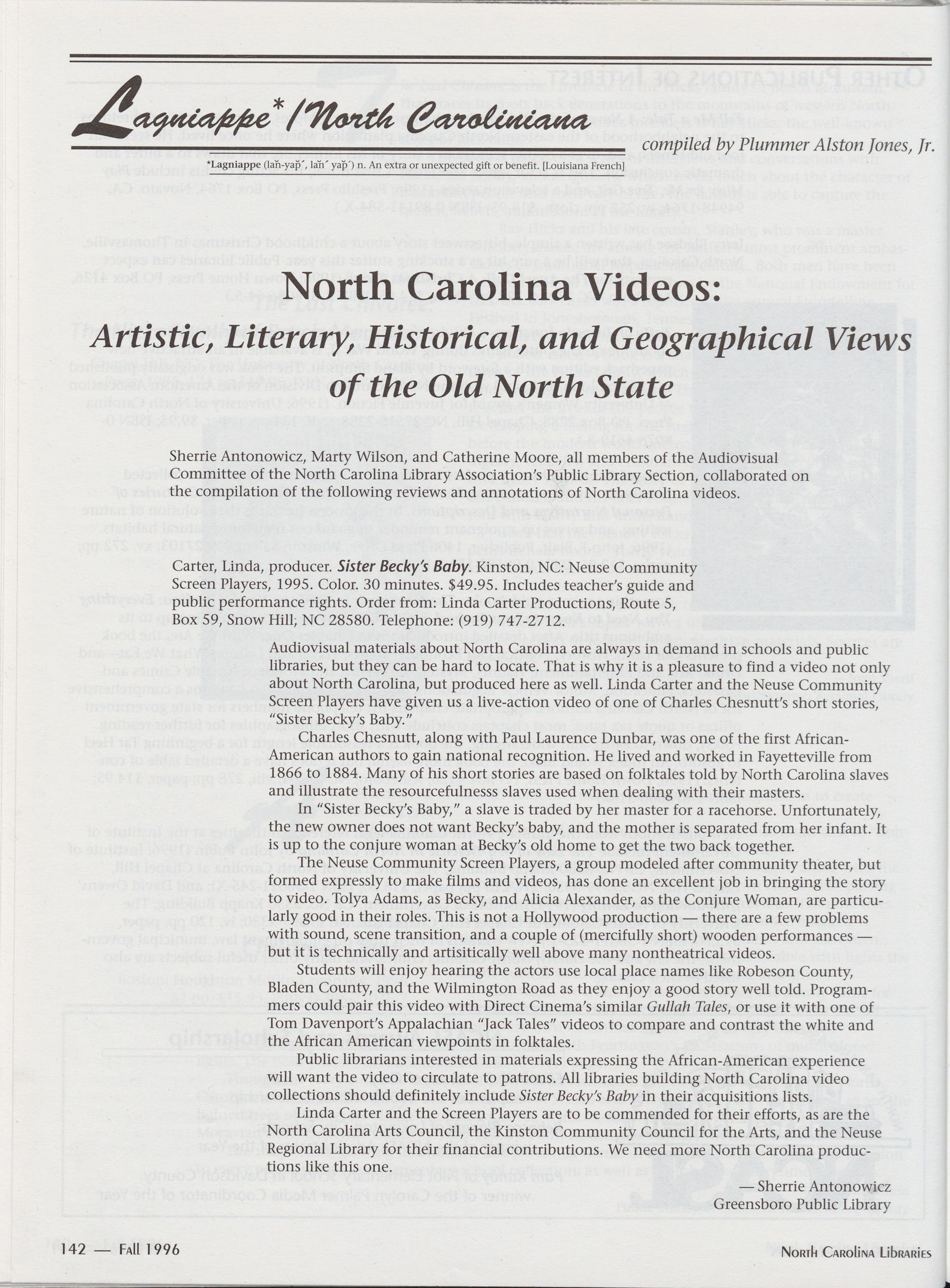 142 Lagniappe: North Carolina Videos: Artistic, Literary, Historical, and Geographical