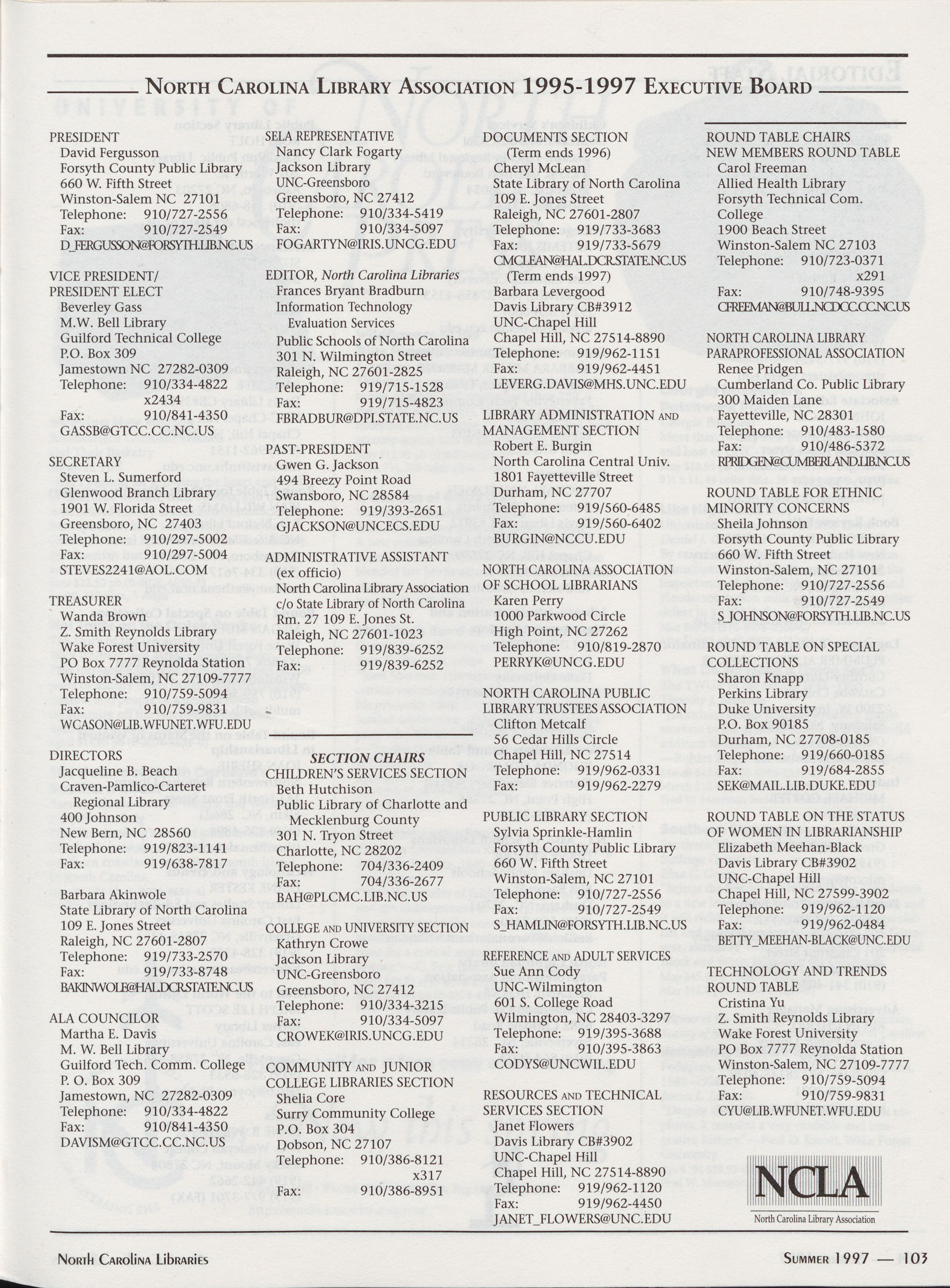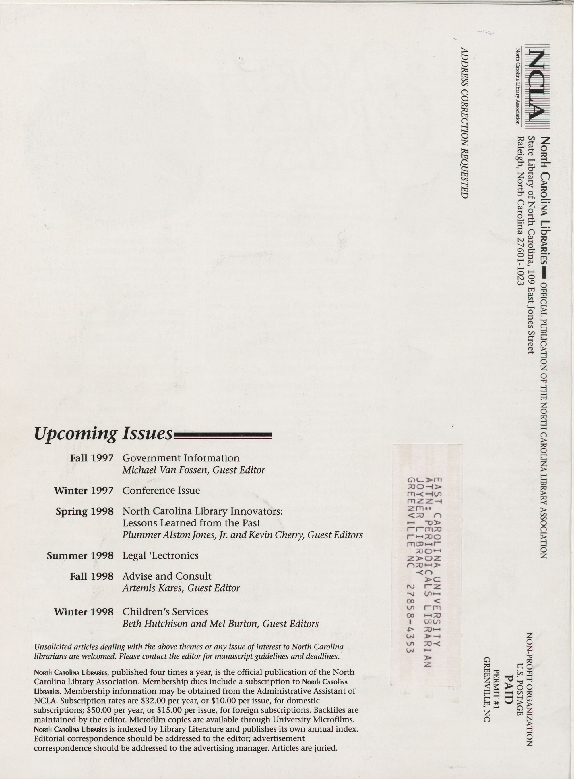 Carolina Library Association. Membership dues include a subscription to North Carolina