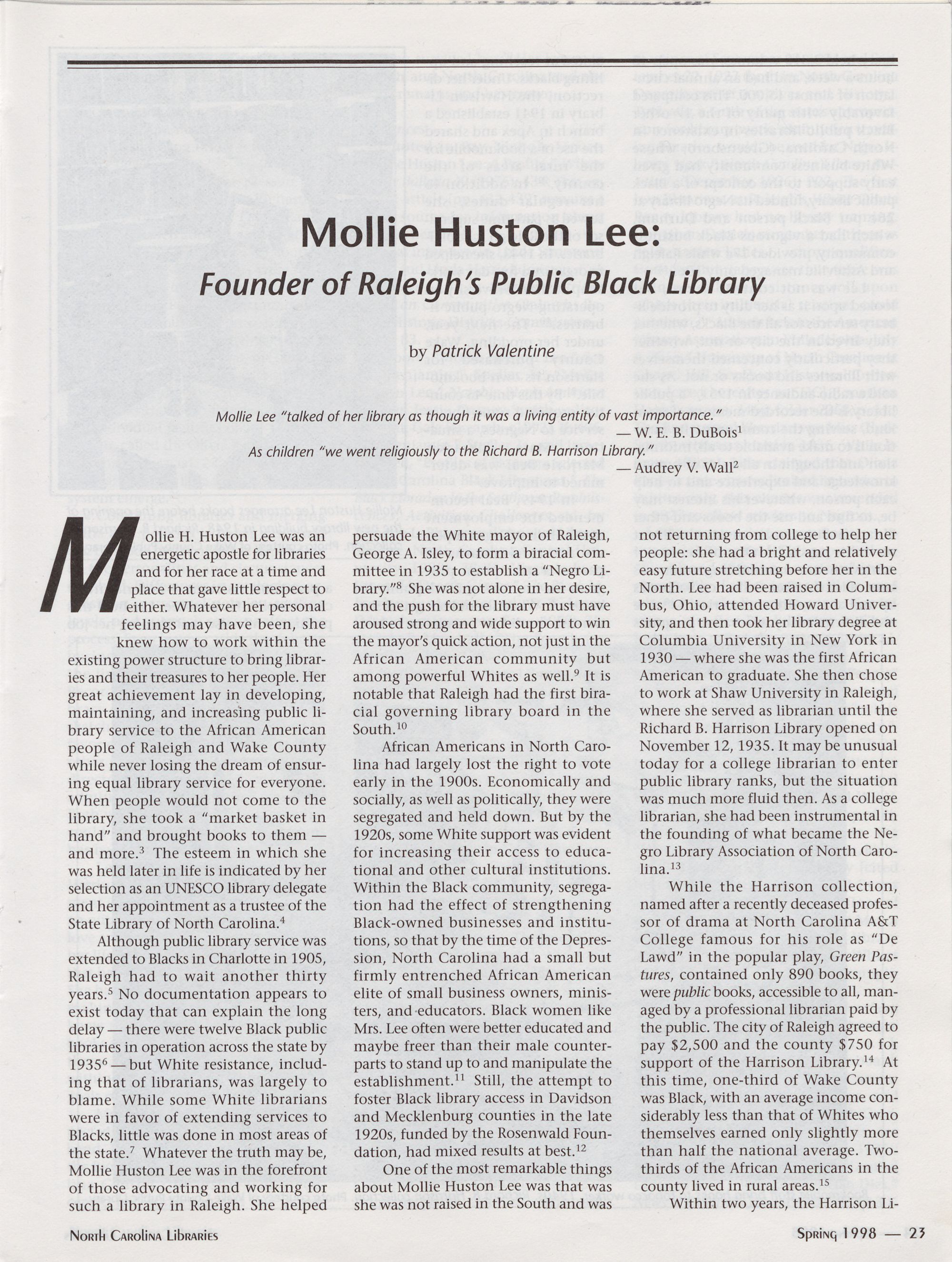 Mollie Huston Lee: Founder of RaleighTs Public Black Library, Patrick Valentine