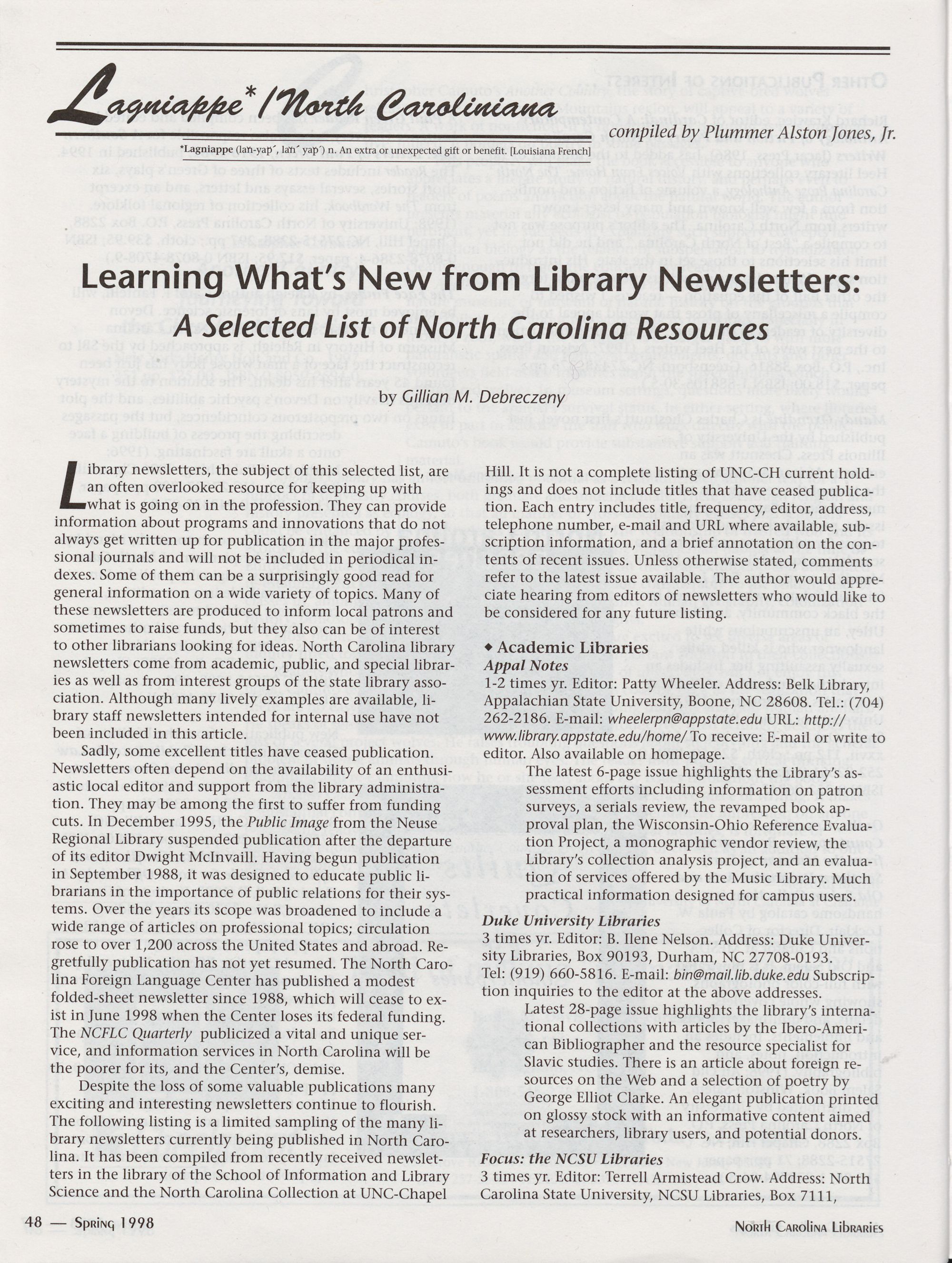 Lagniappe: Learning WhatTs New from Library Newsletters: A Selected List of