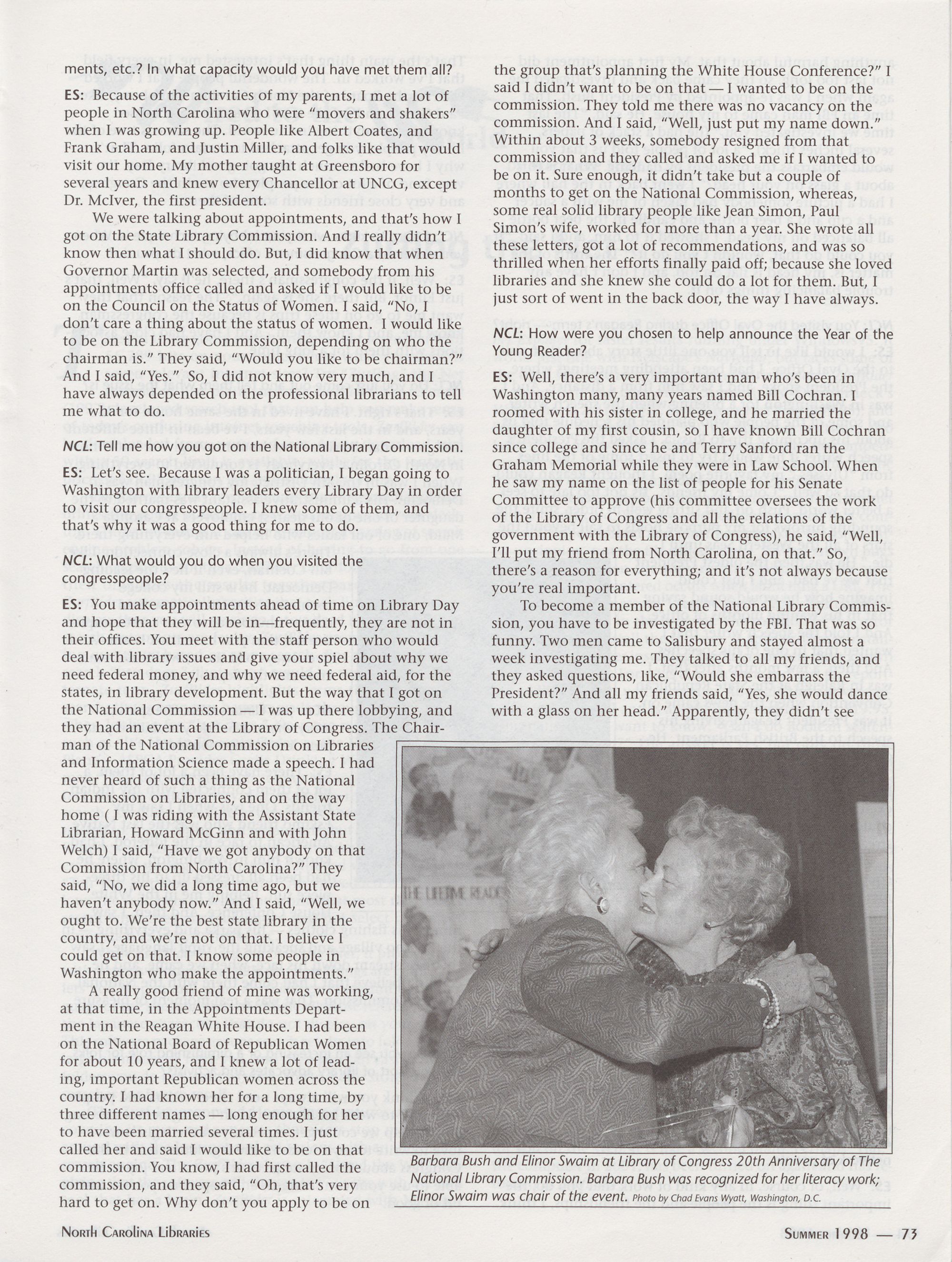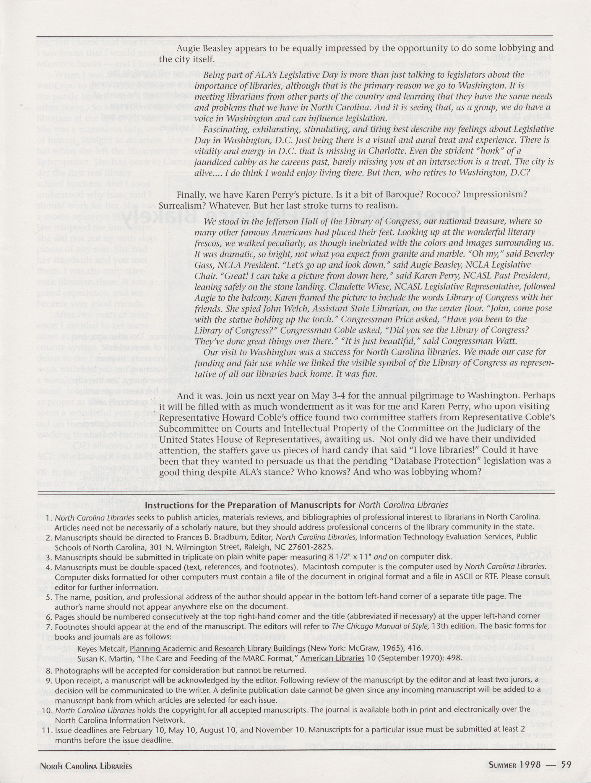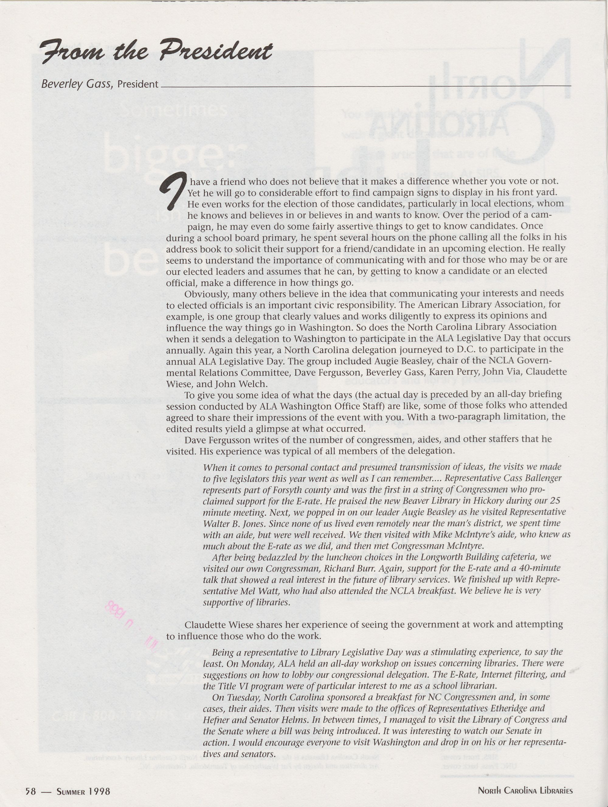 annual ALA Legislative Day. The group included Augie Beasley, chair of the NCLA Govern-