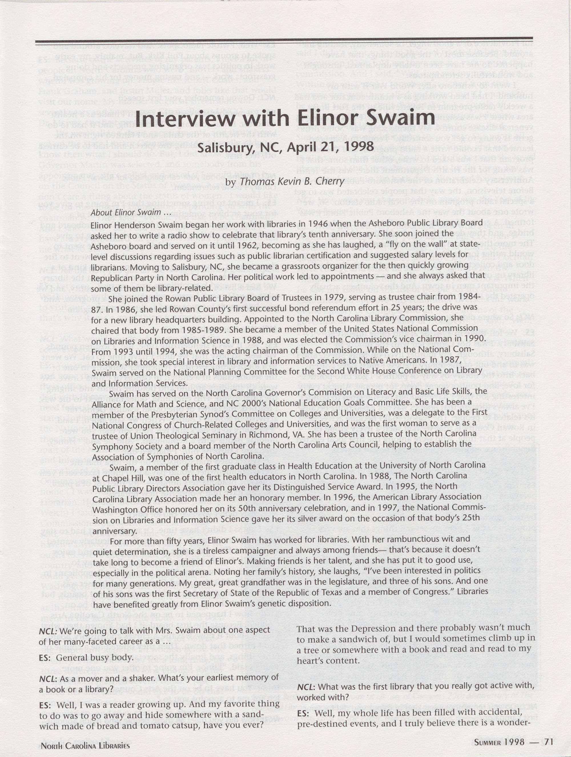 71 Interview with Elinor Swaim, Thomas Kevin B. Cherry
