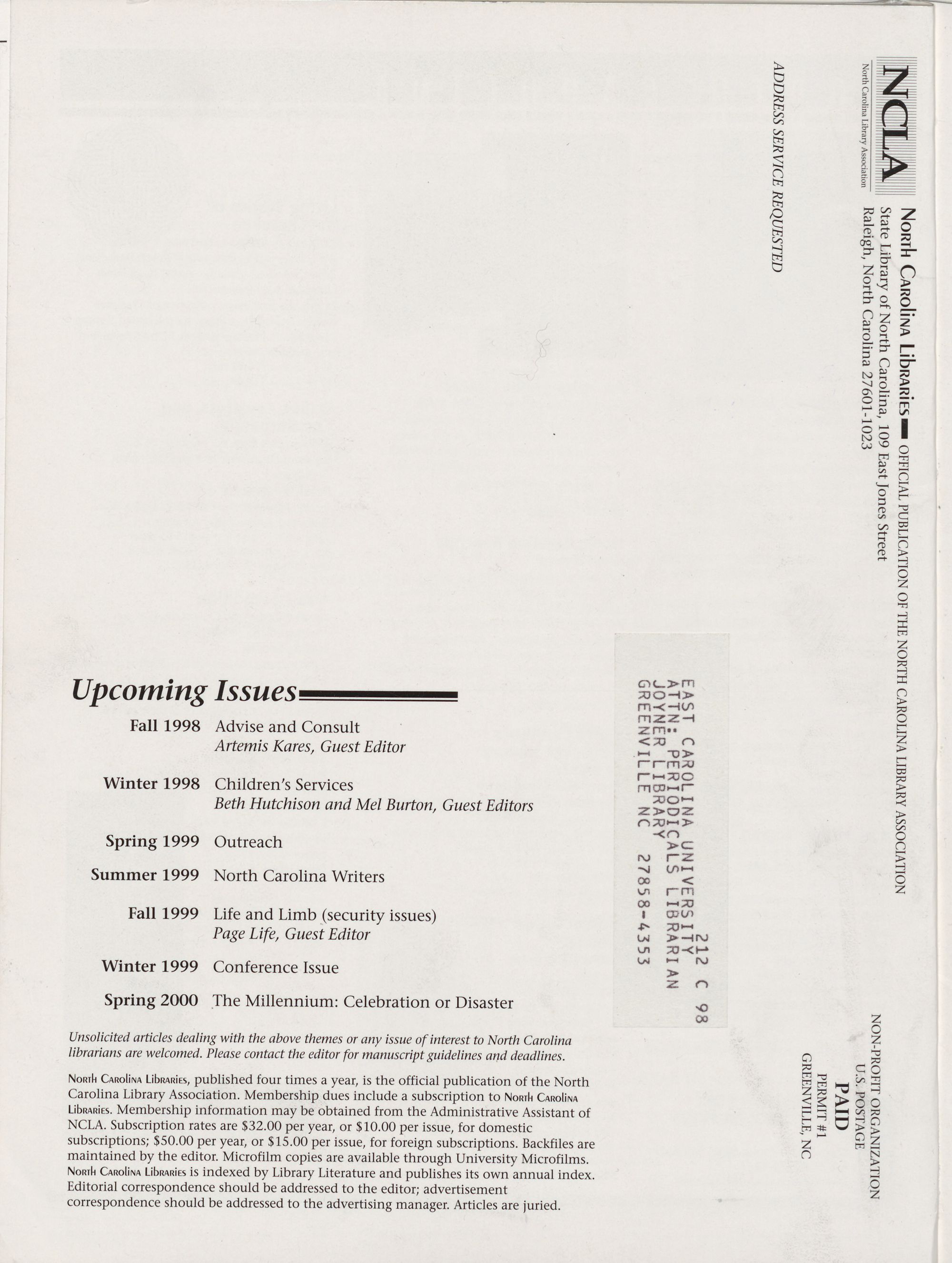 North Carolina Libraries is indexed by Library Literature and publishes its own annual index.