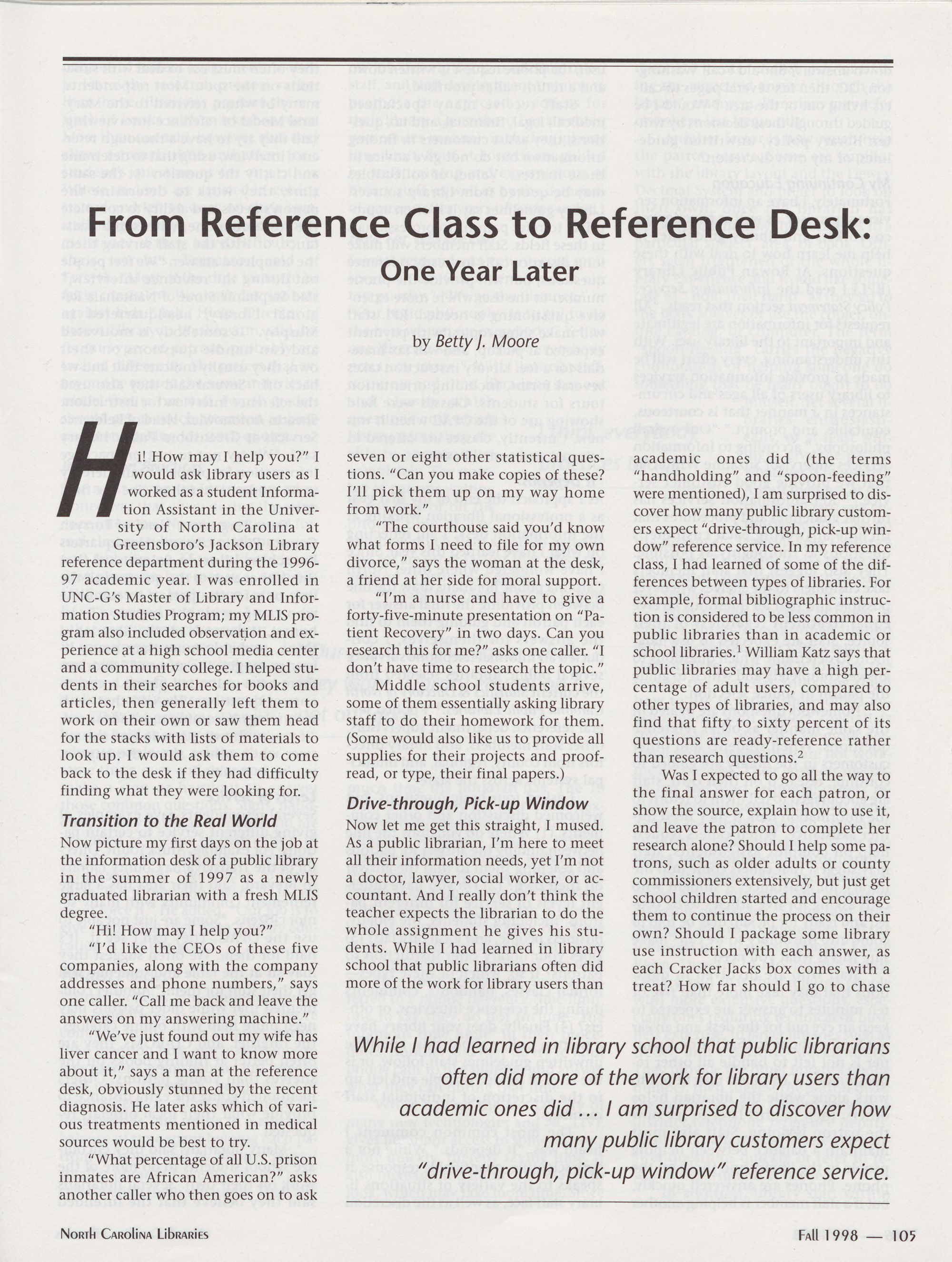 From Reference Class to Reference Desk: One Year Later, Betty J. Moore