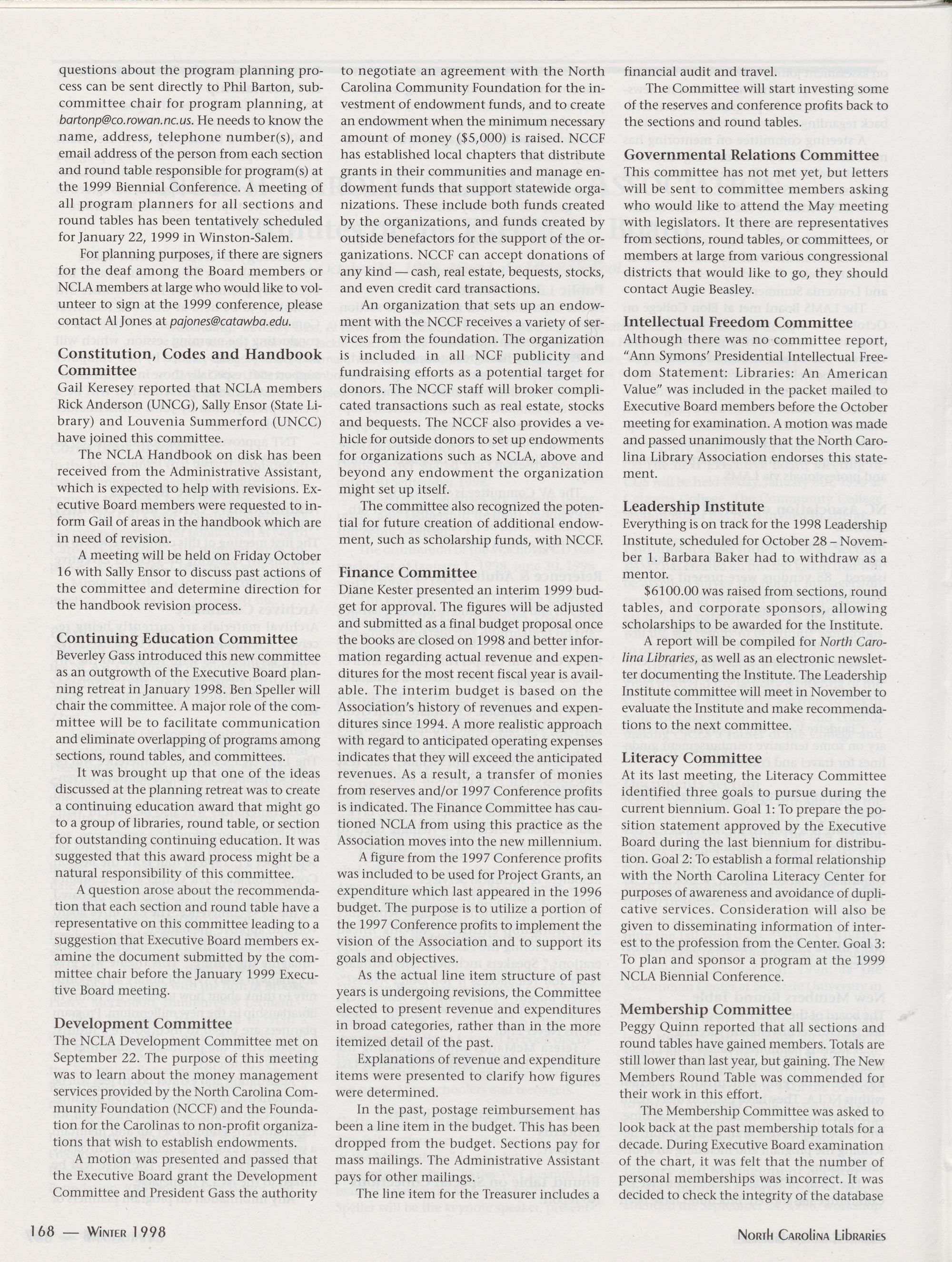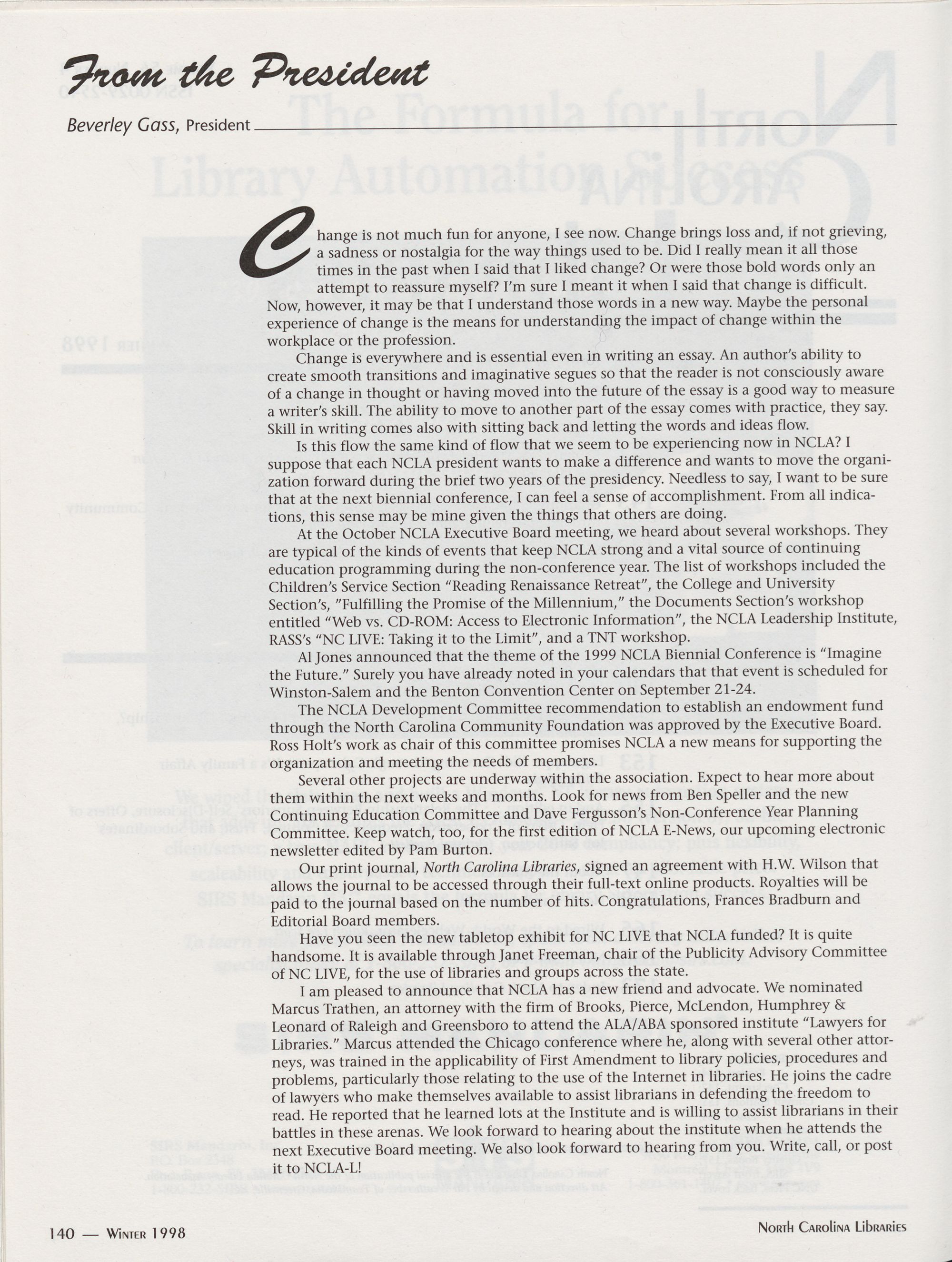 Committee. Keep watch, too, for the first edition of NCLA E-News, our upcoming electronic