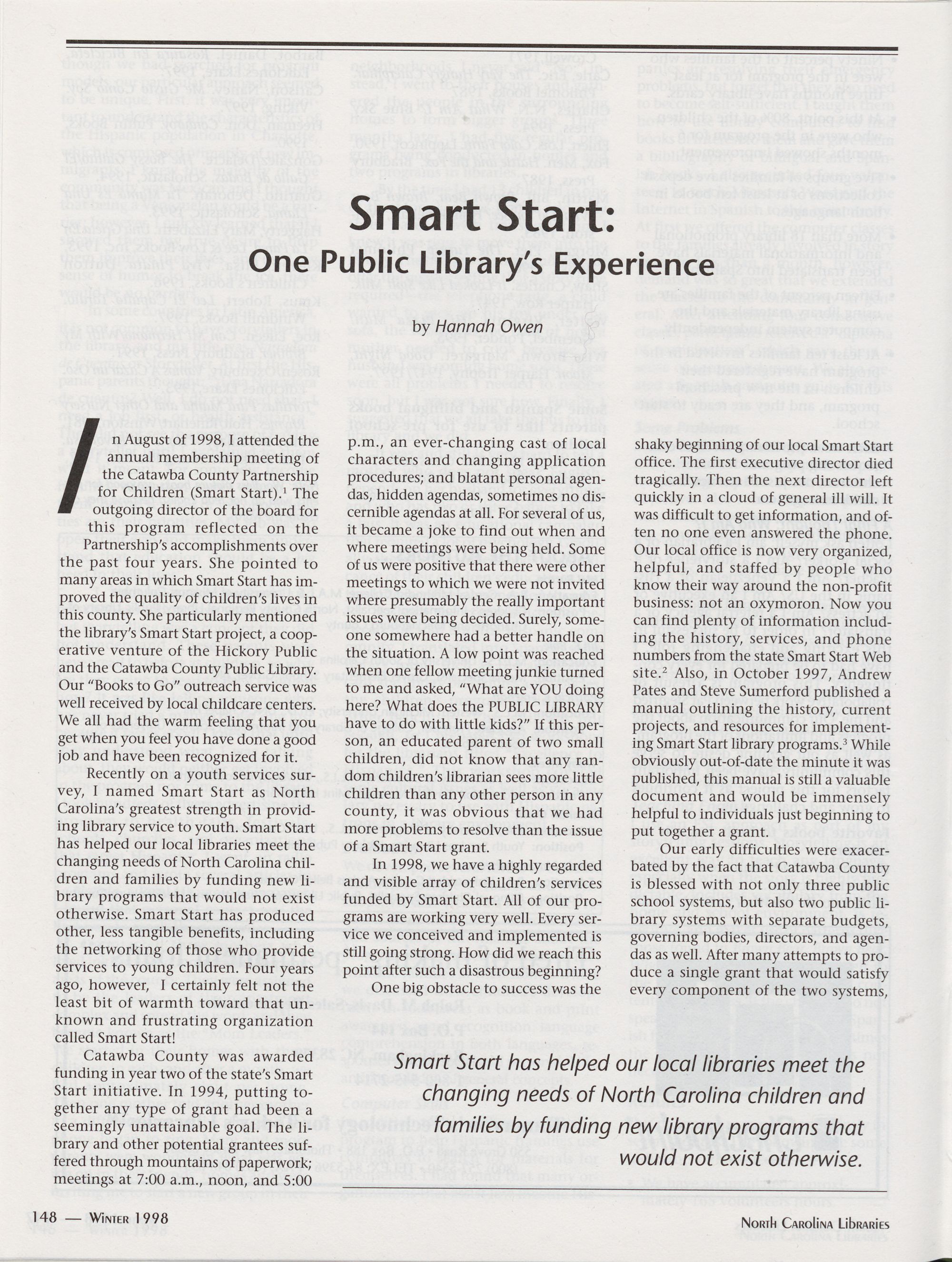 148 | smart Start: One Public LibraryTs Experience, Hannah Owen