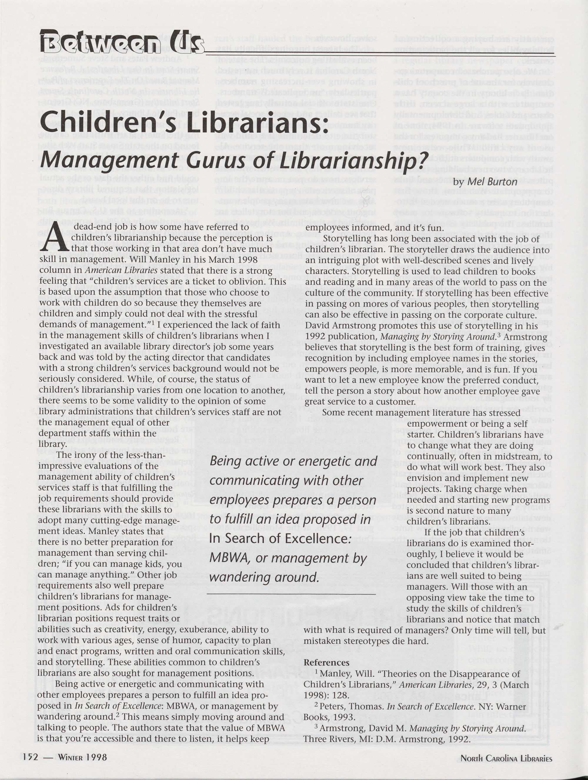 152 Between Us: ChildrenTs Librarians: Management Gurus of Librarianship?,
