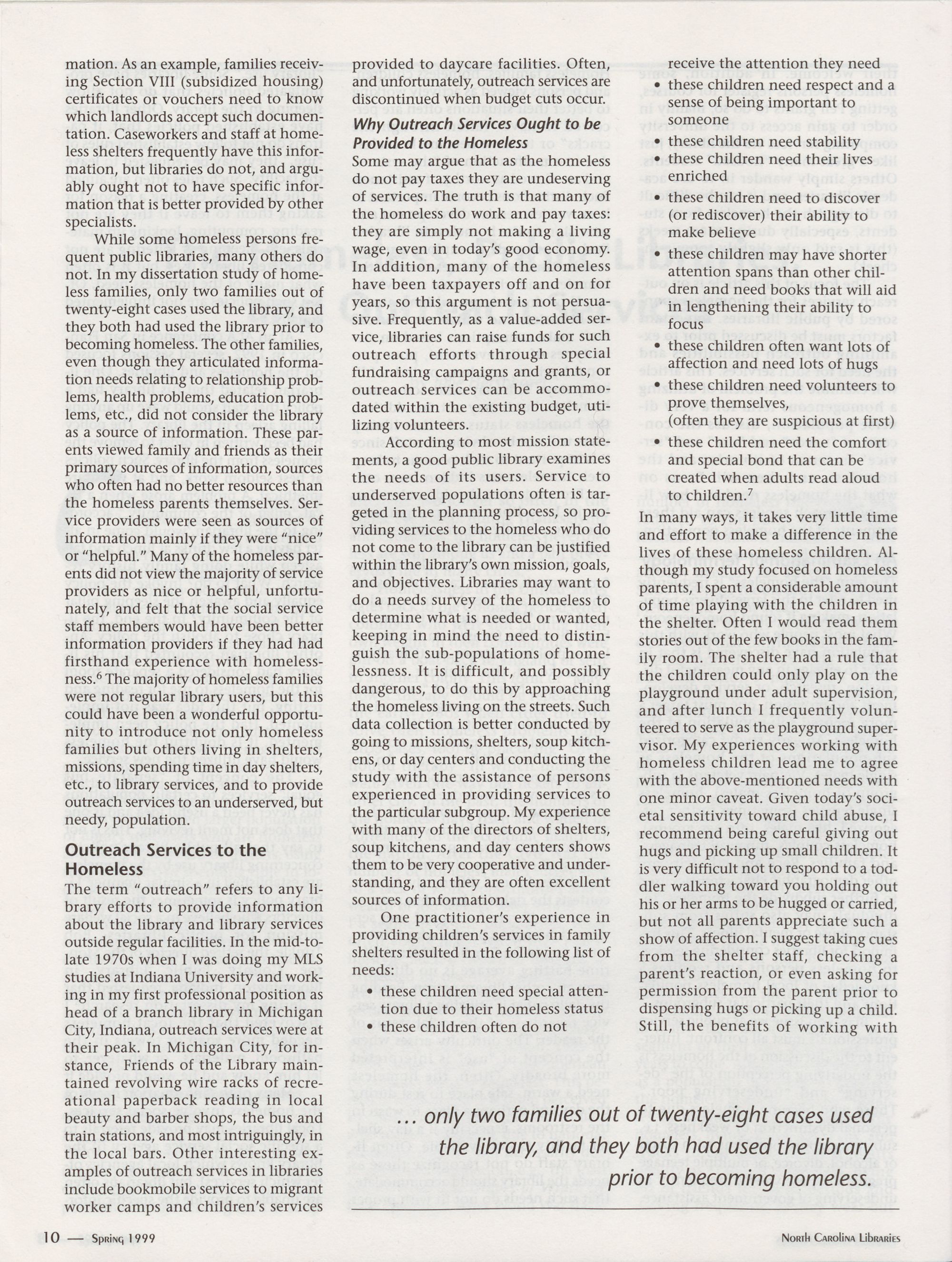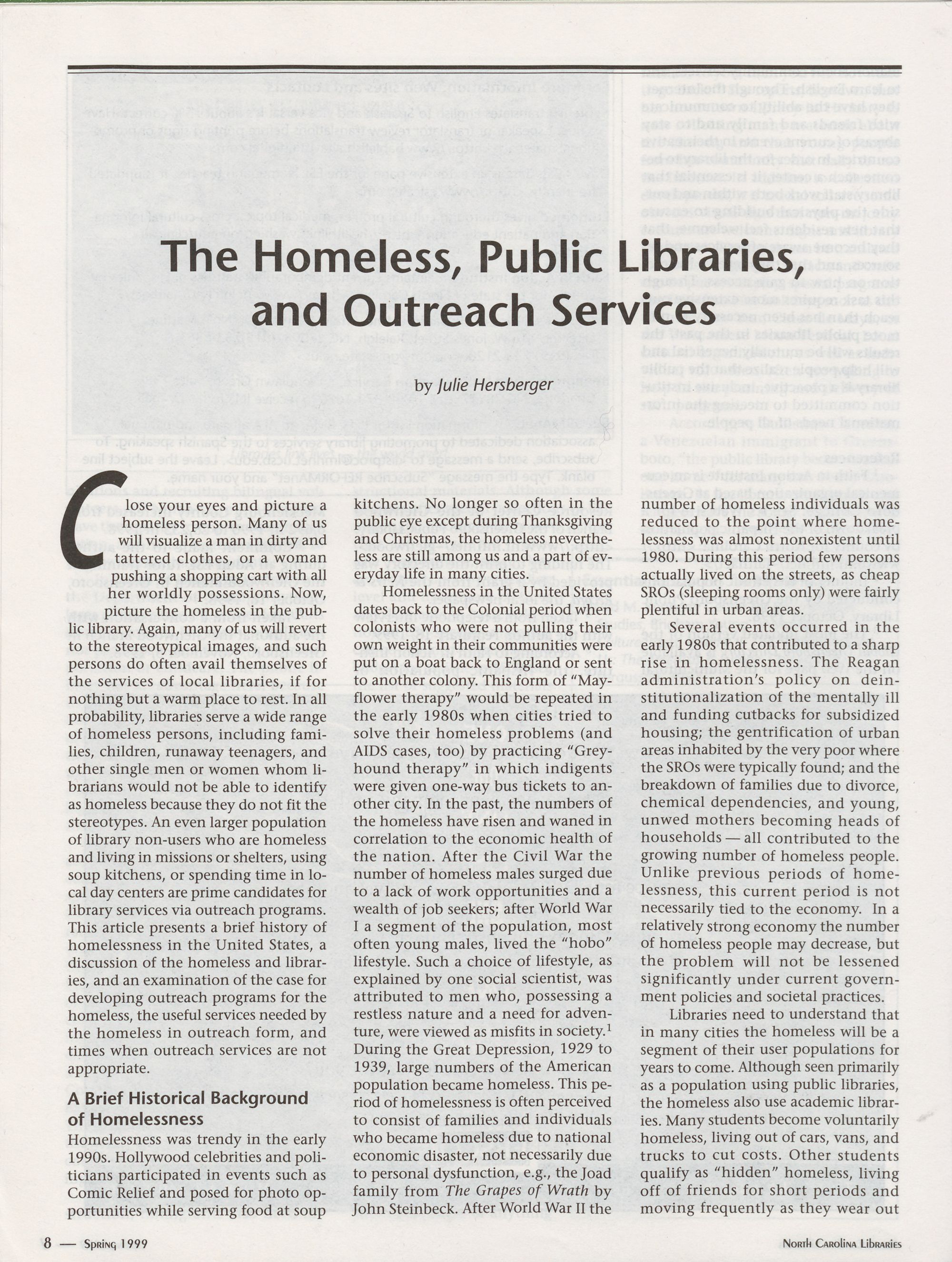 The Homeless, Public Libraries, and Outreach Services, Julie Hersberger