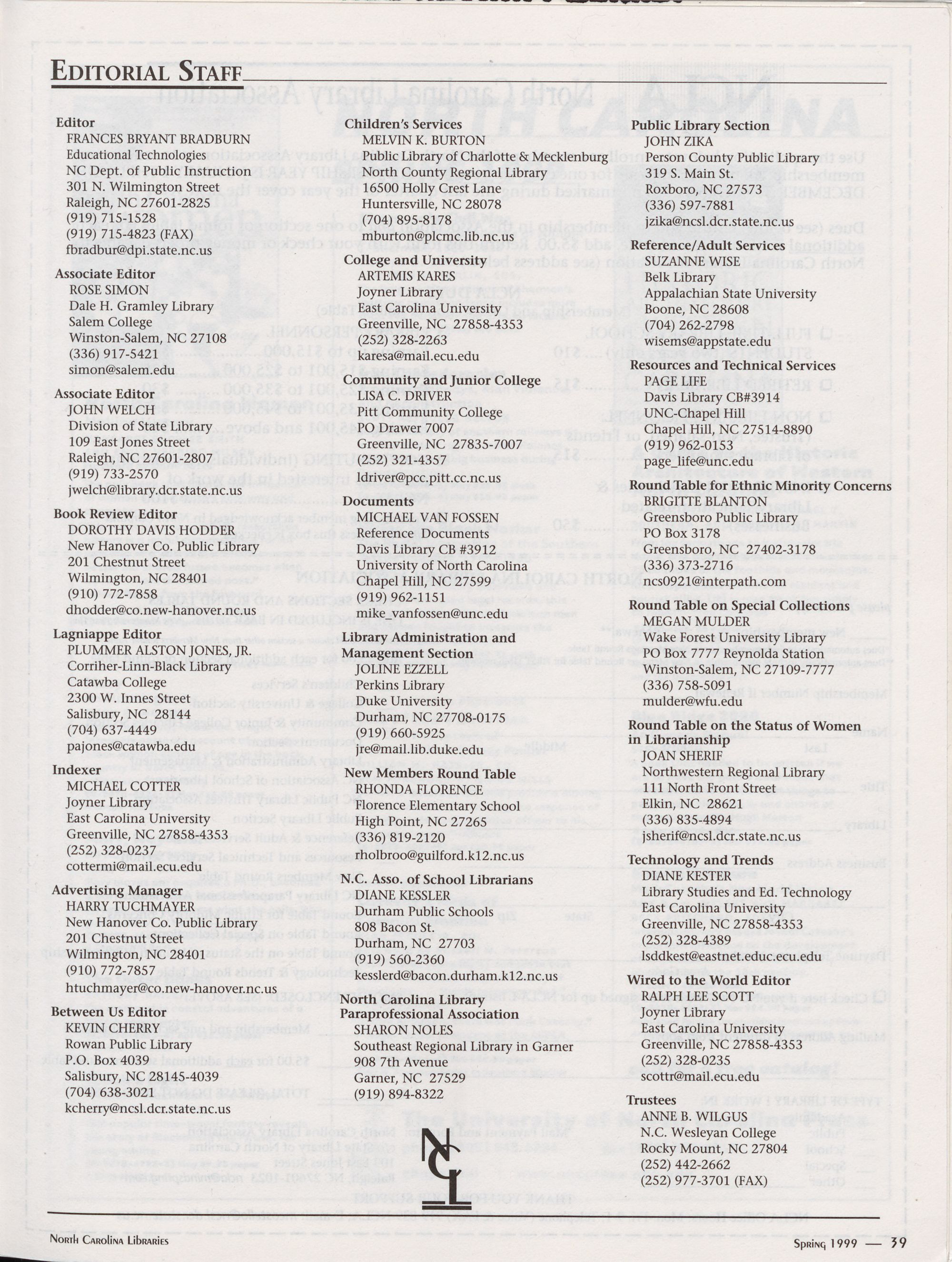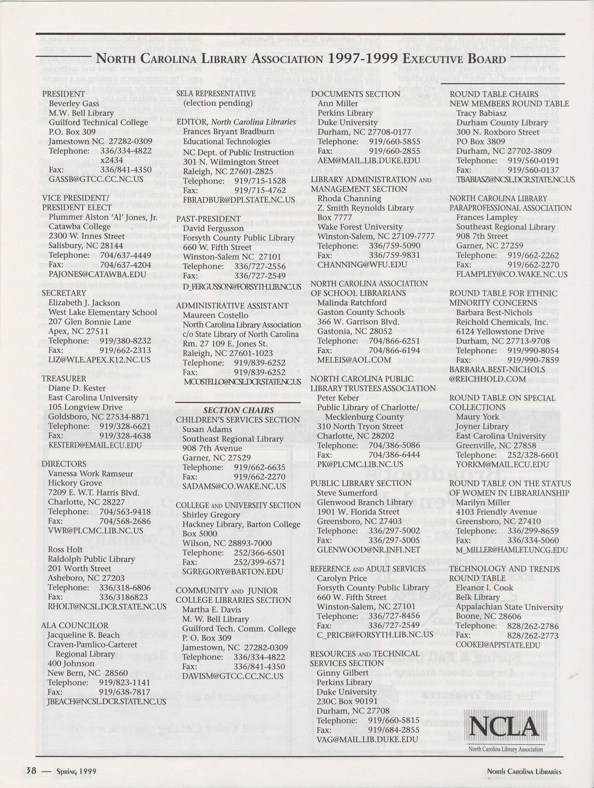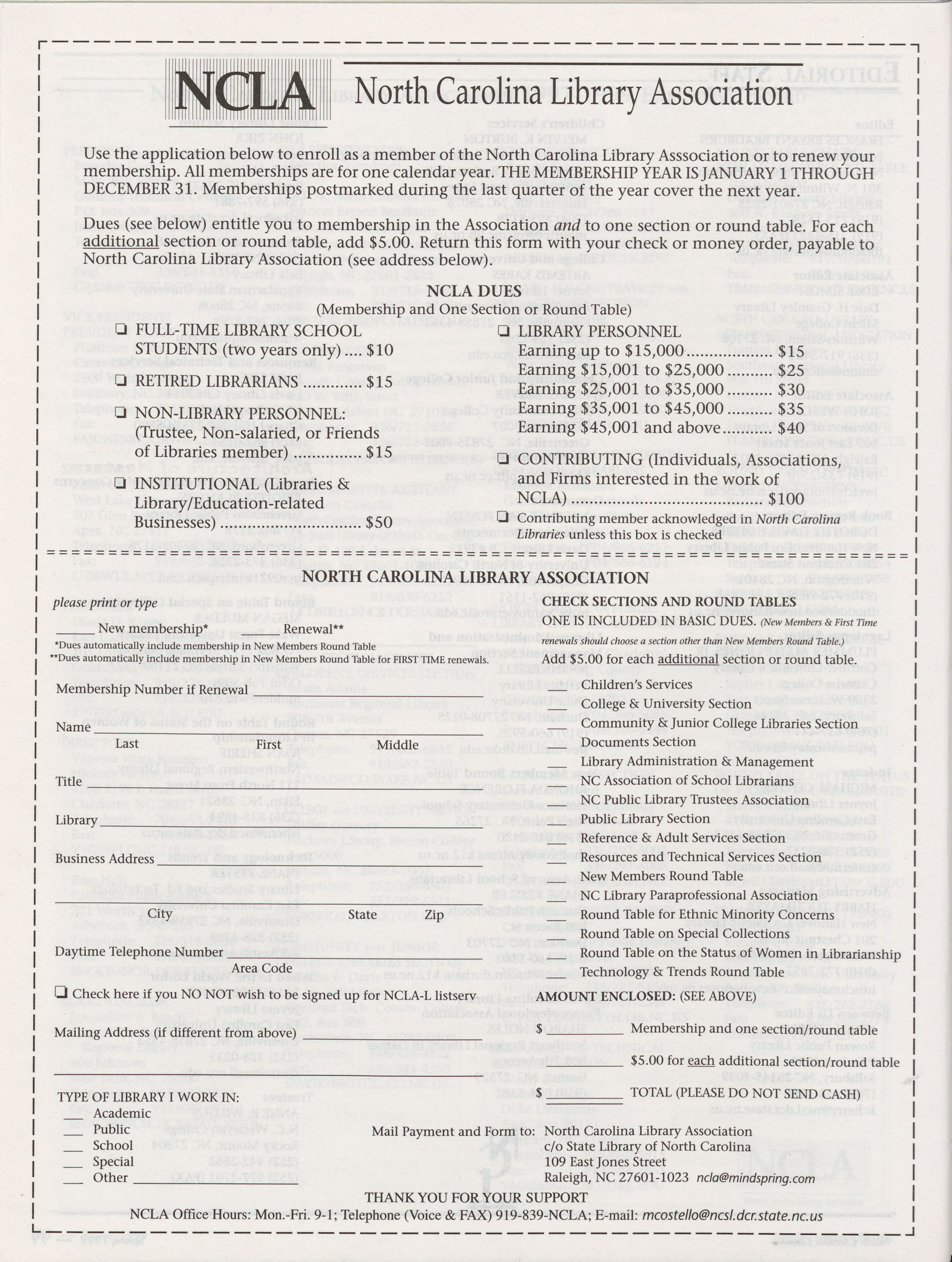 Carolina Library Association. Membership dues include a subscription to North Carolina