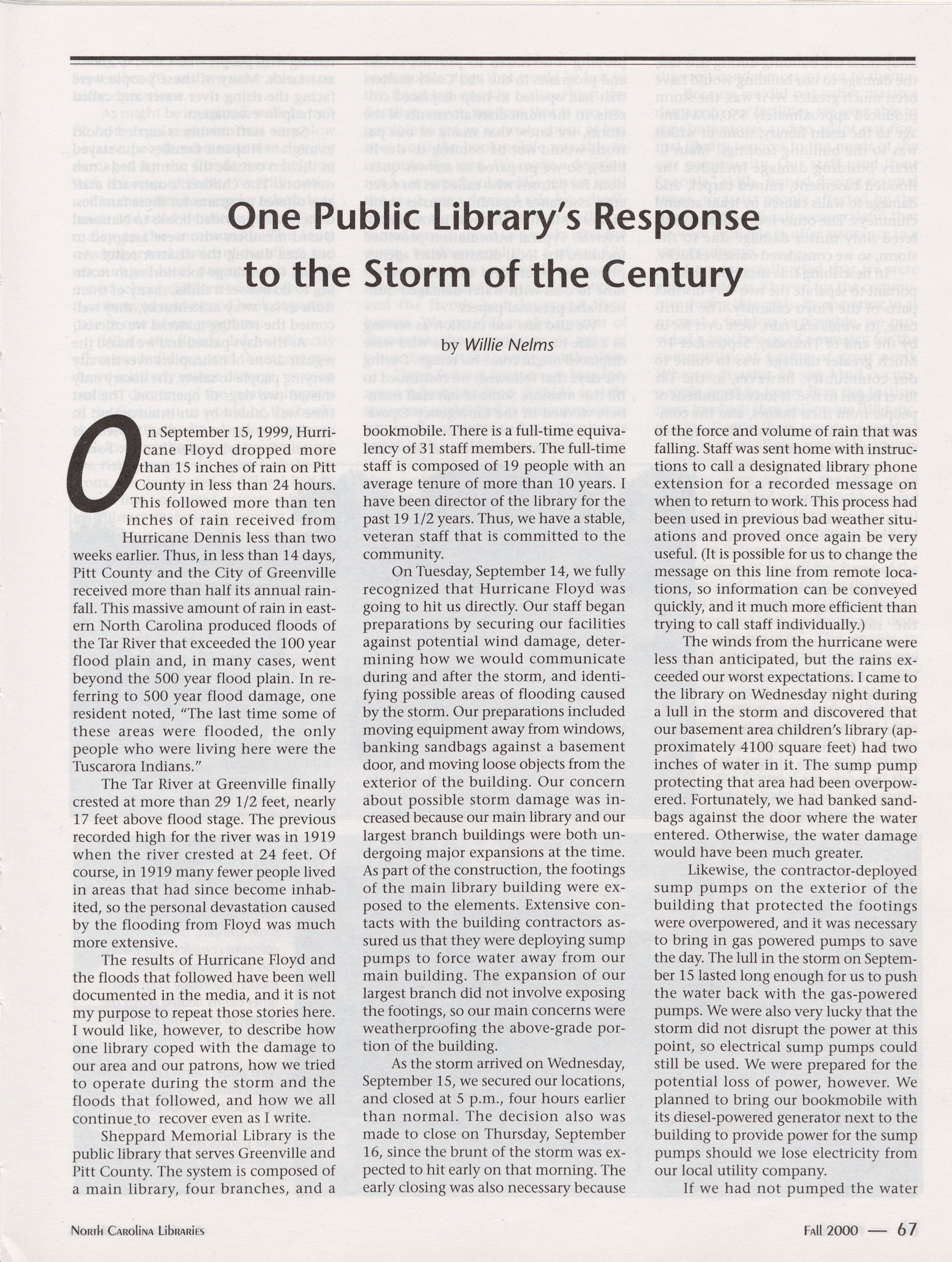 67 One Public LibraryTs Response to the Storm of the Century, Willie Nelms