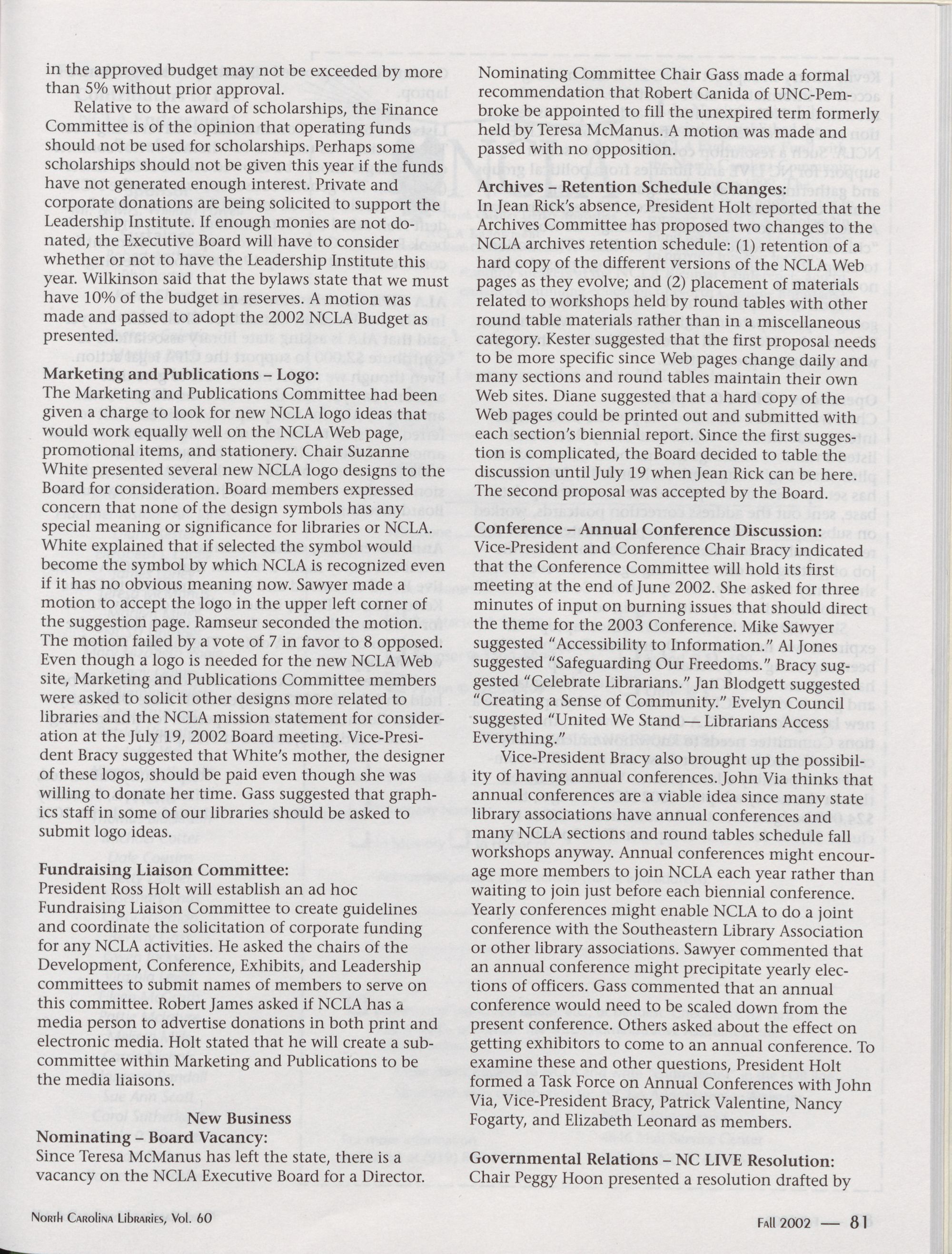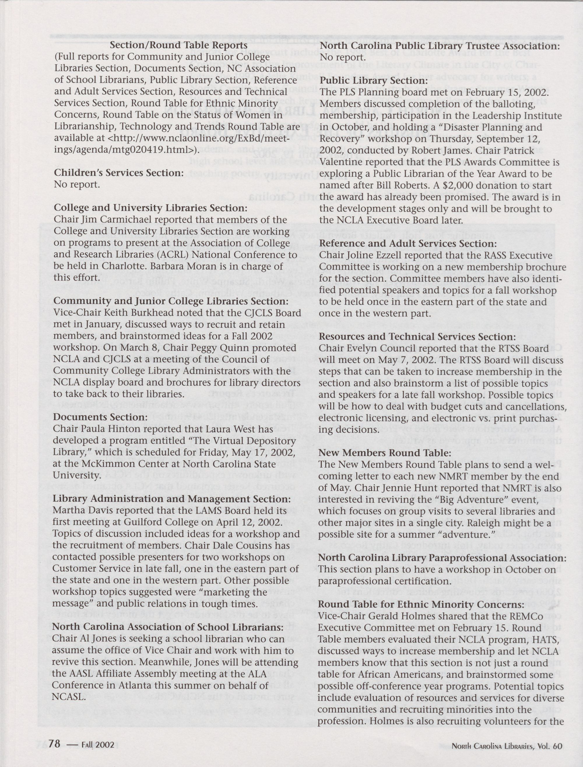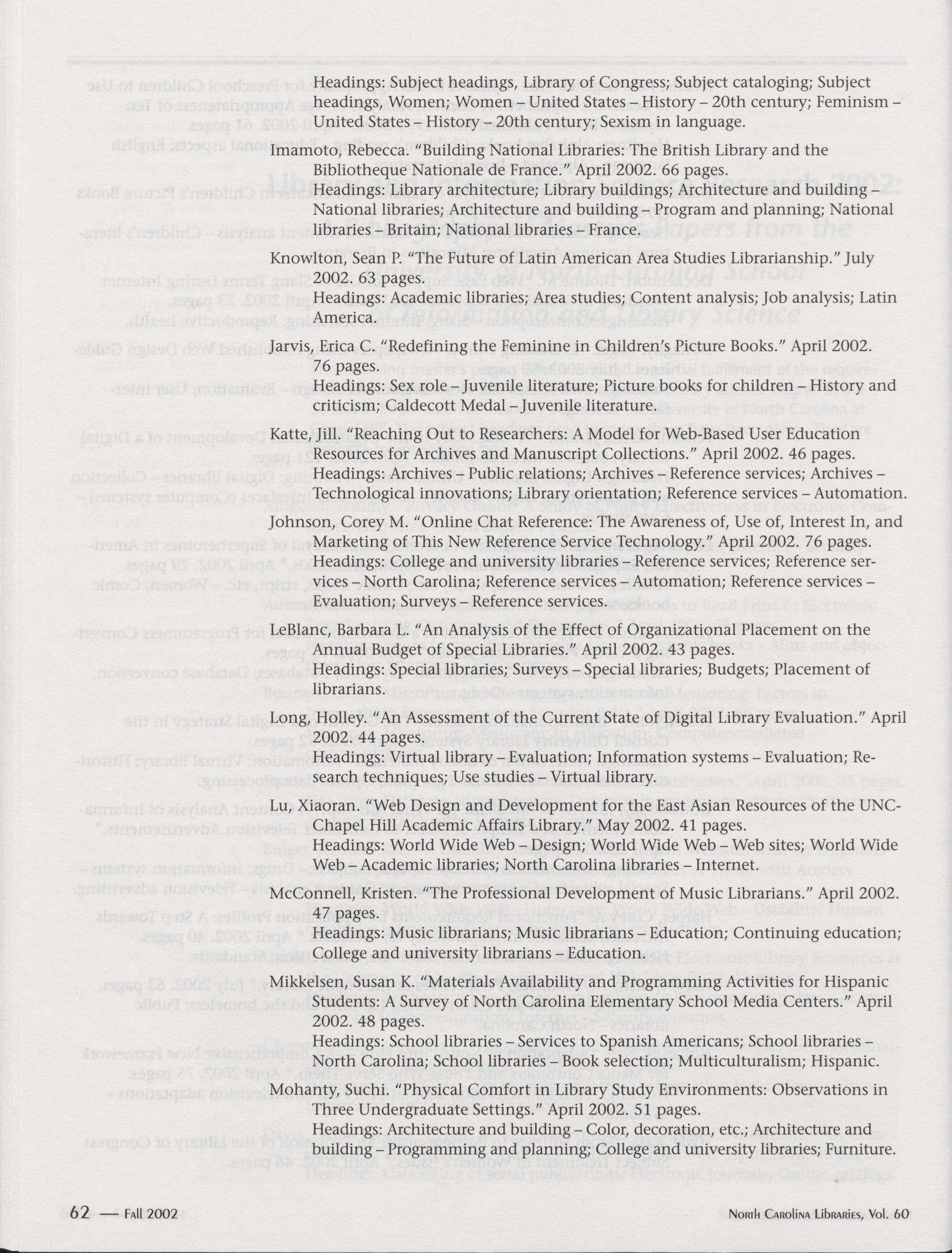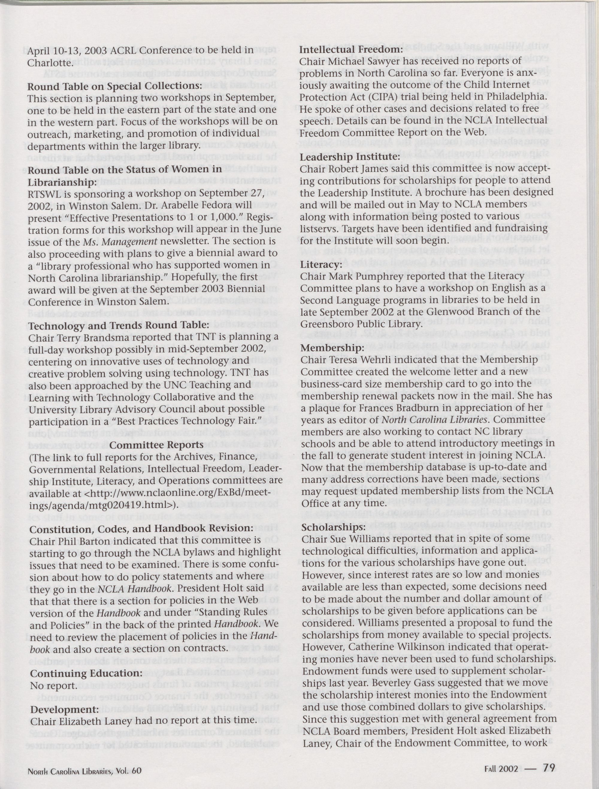 North Carolina Libraries publishes article of interest to librarians in North Carolina and around the world. It is the official publication of the North Carolina Library Association and as such publishes the Official Minutes of the Executive Board and conference proceedings.