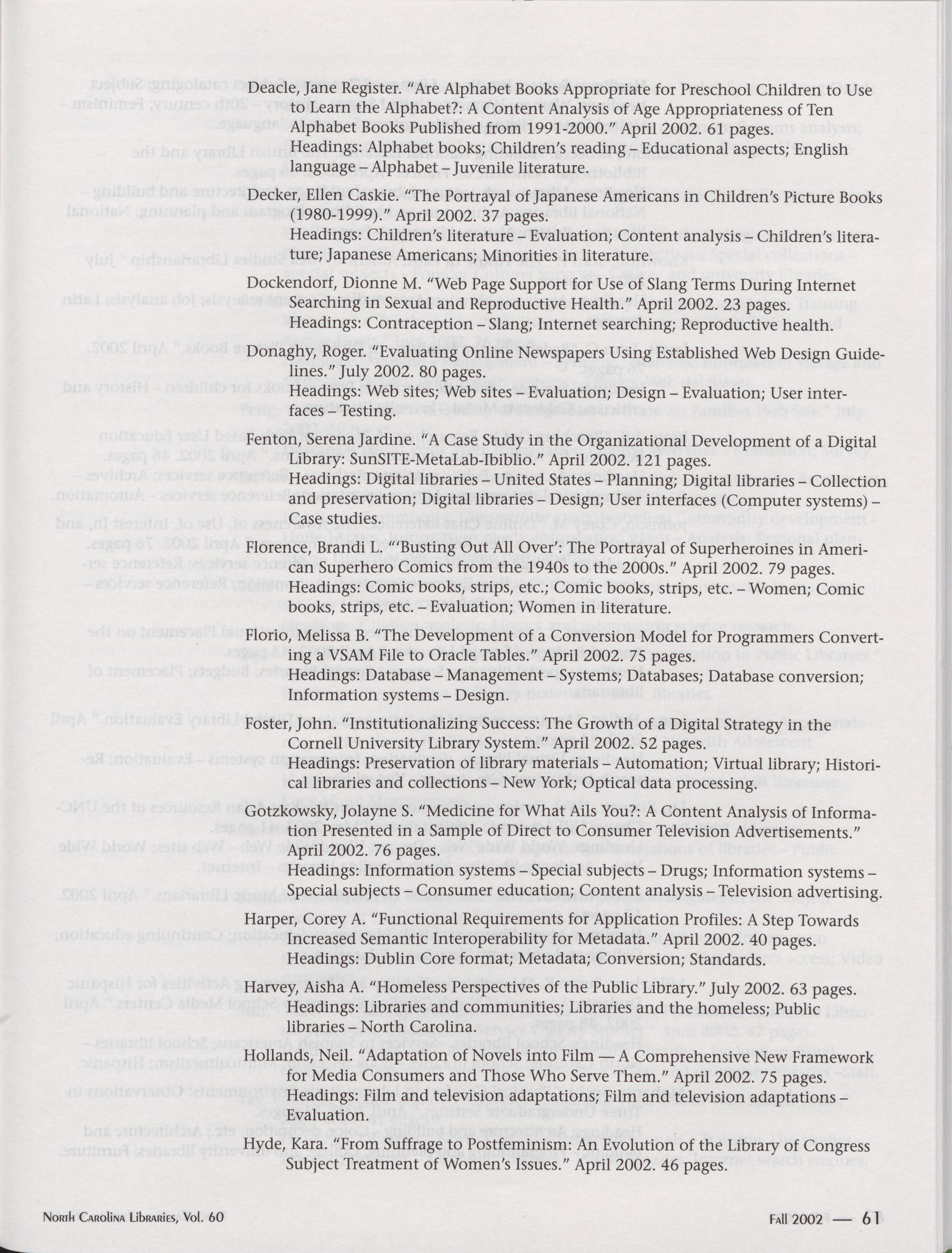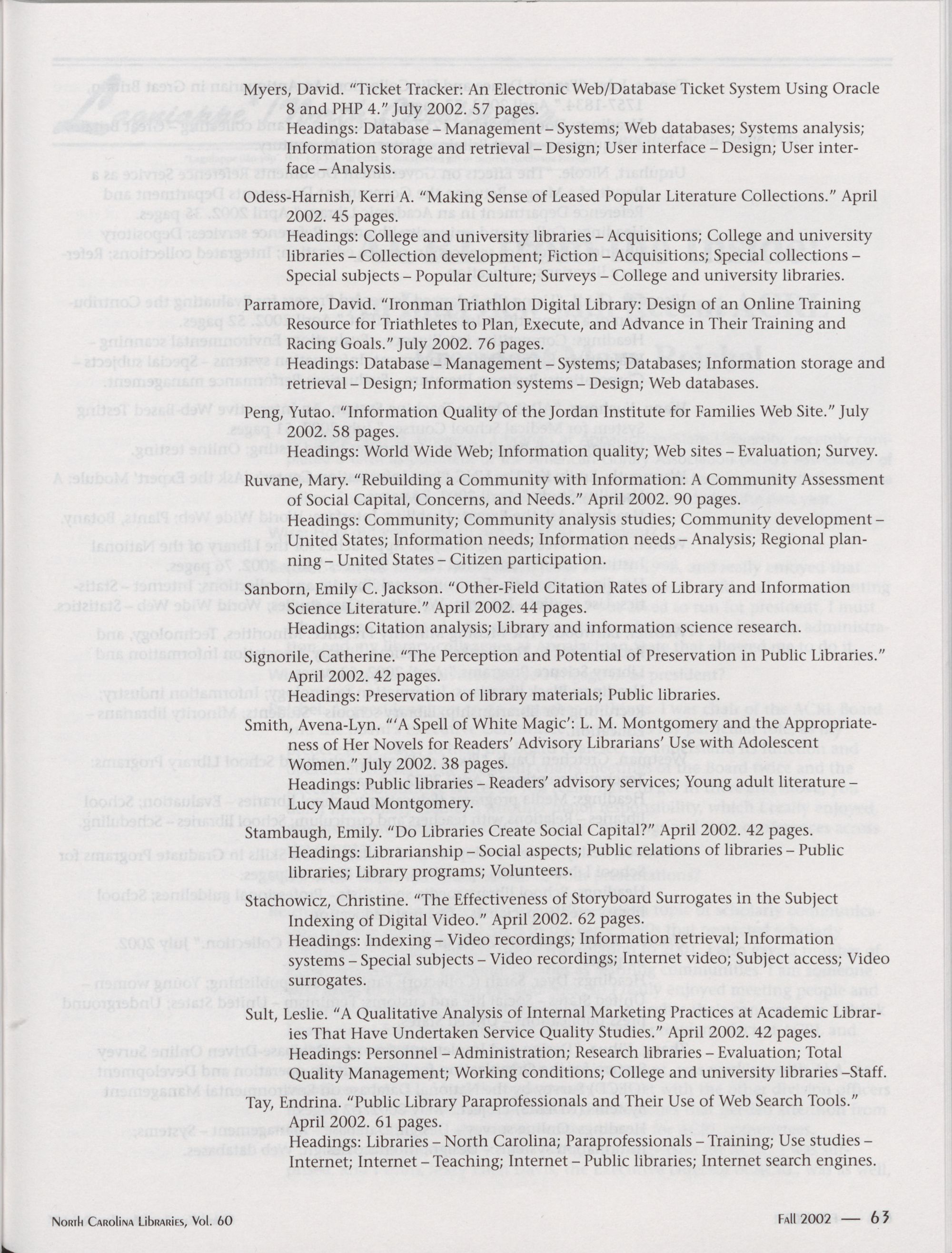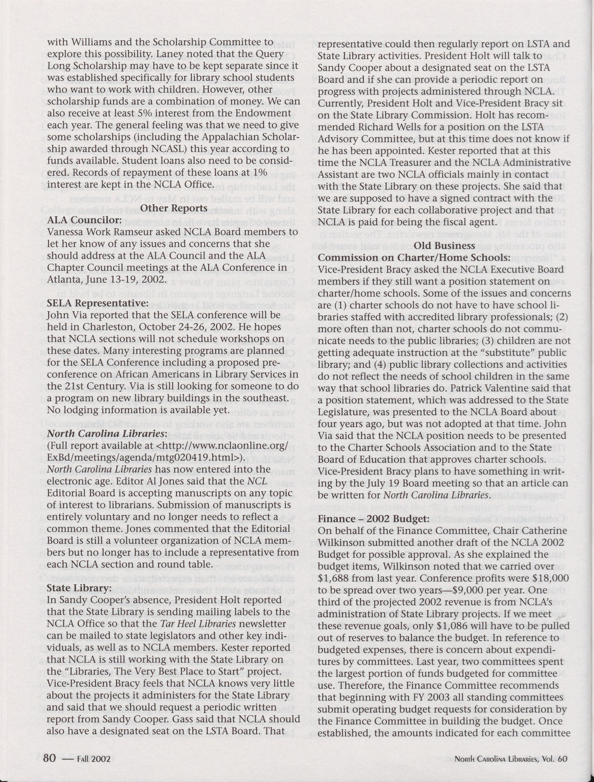 North Carolina Libraries publishes article of interest to librarians in North Carolina and around the world. It is the official publication of the North Carolina Library Association and as such publishes the Official Minutes of the Executive Board and conference proceedings.