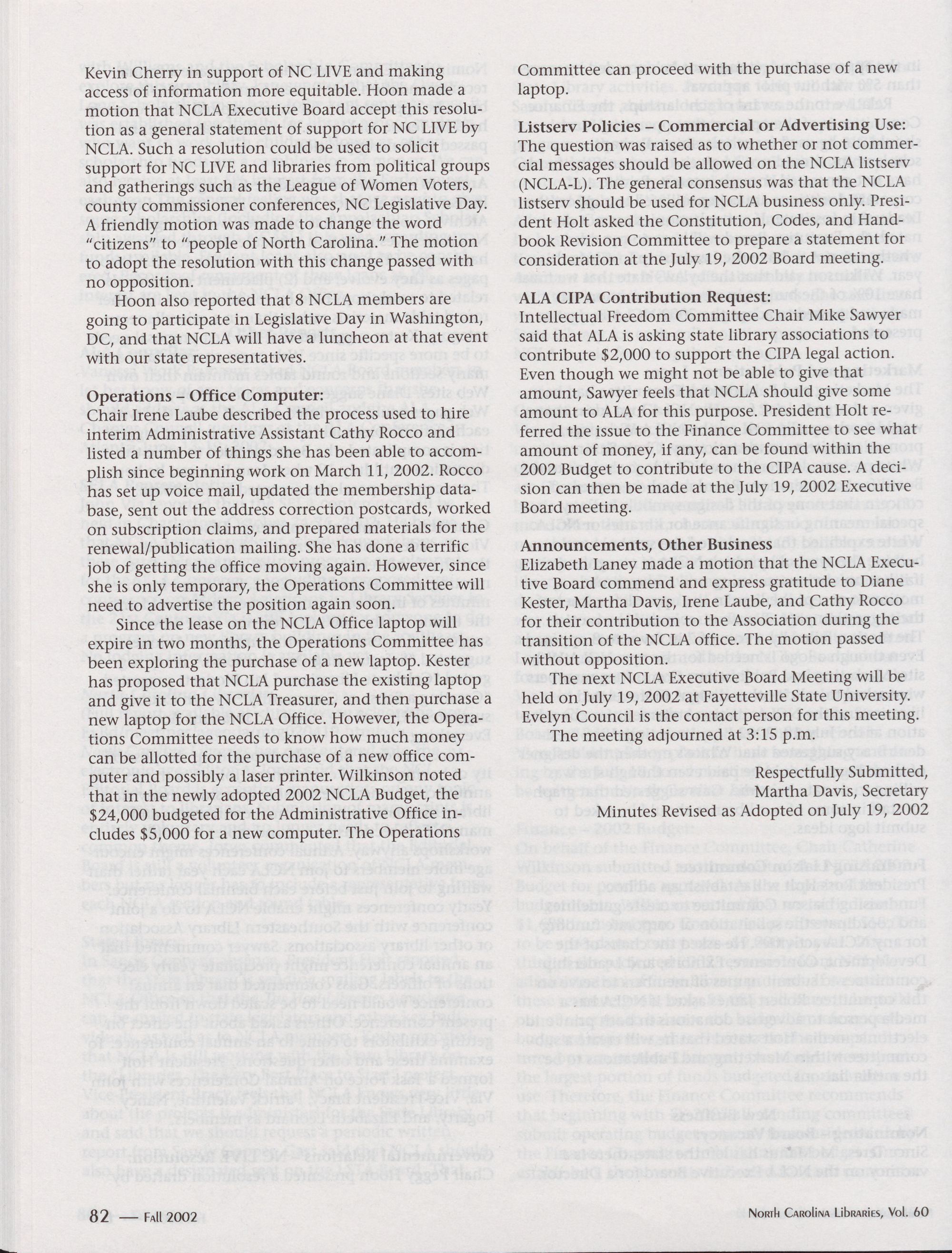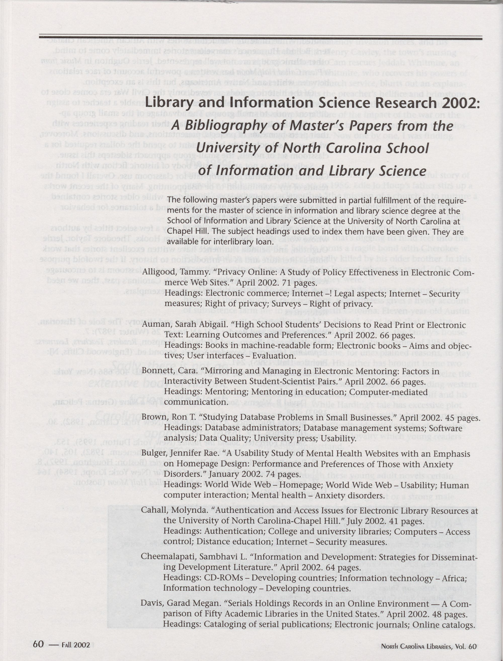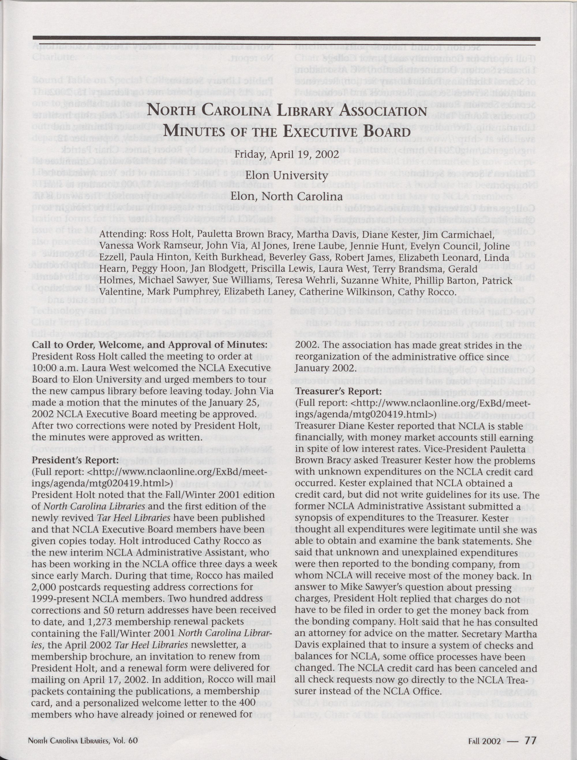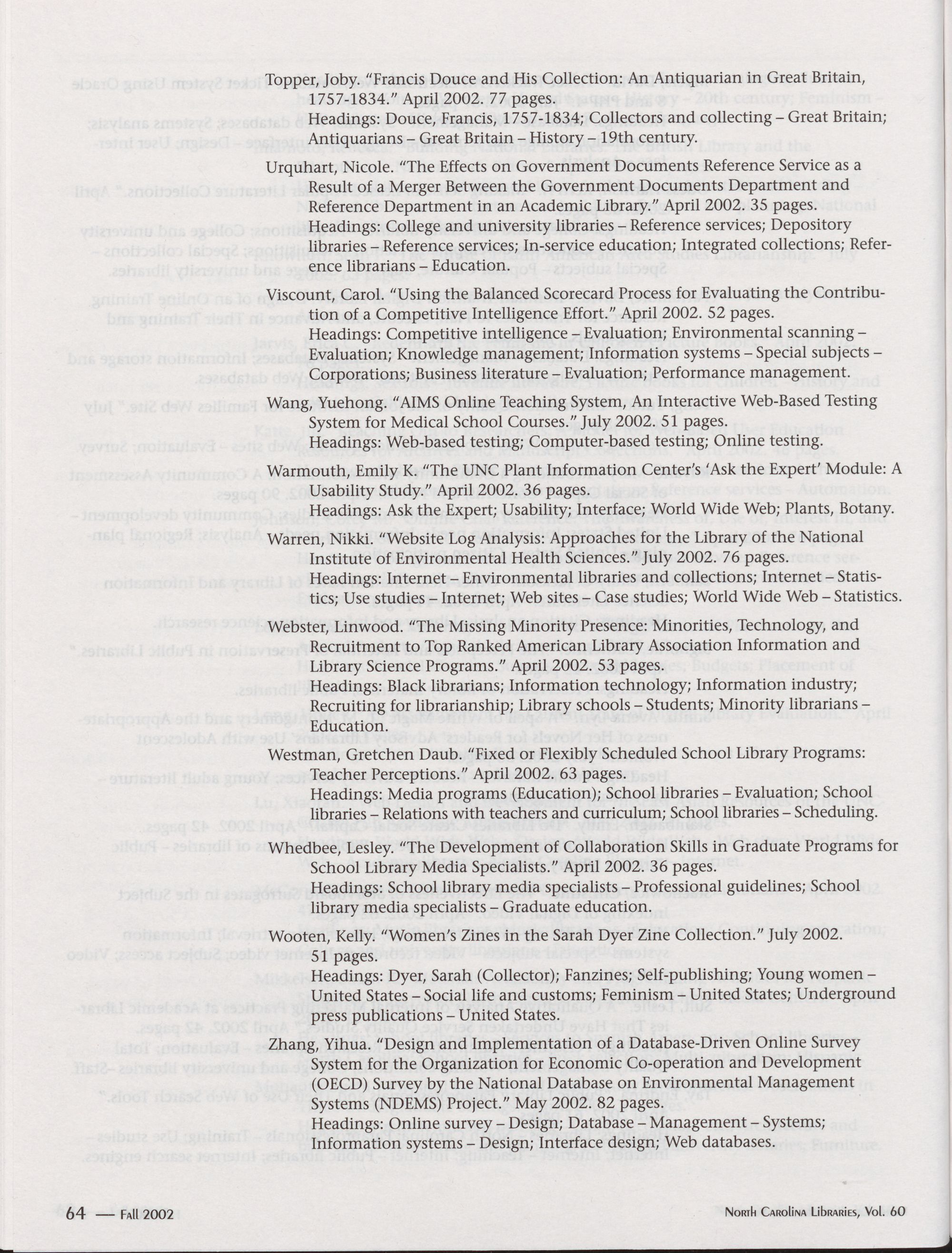 North Carolina Libraries publishes article of interest to librarians in North Carolina and around the world. It is the official publication of the North Carolina Library Association and as such publishes the Official Minutes of the Executive Board and conference proceedings.