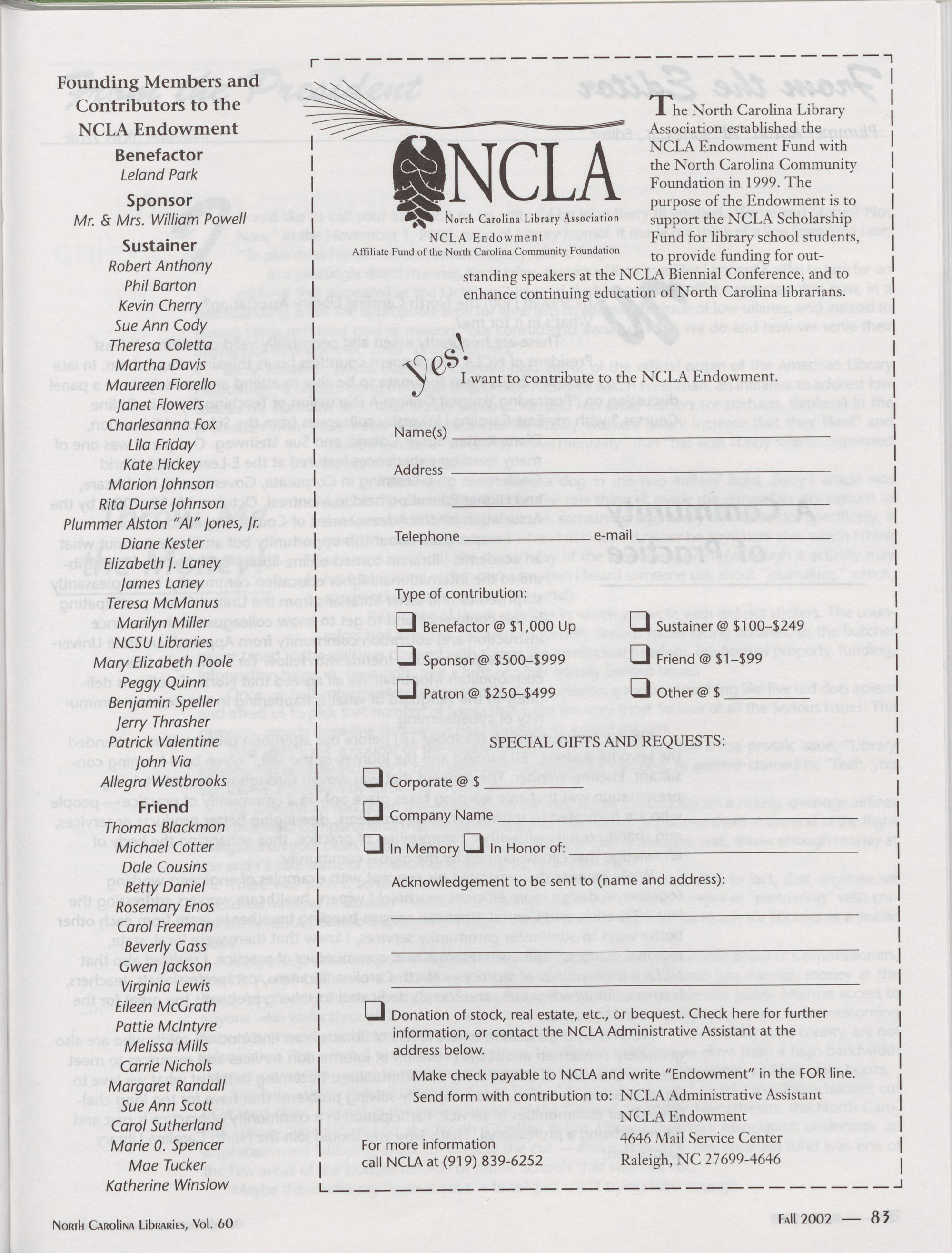Sue Ann Scott Send form with contribution to: NCLA Administrative Assistant