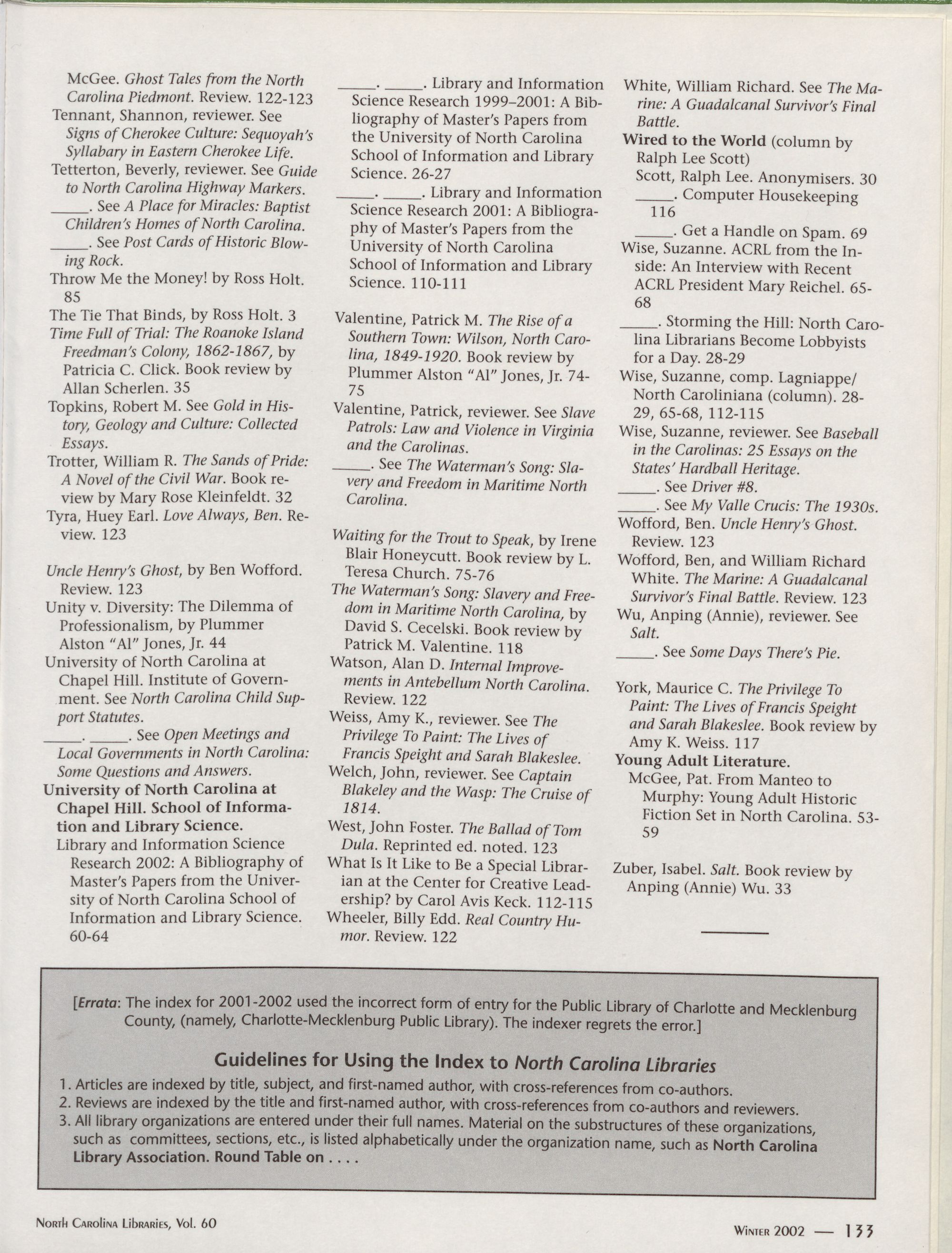 [Errata: The index for 2001-2002 used the incorrect form of entry for the Public Library of Charlotte and Mecklenburg