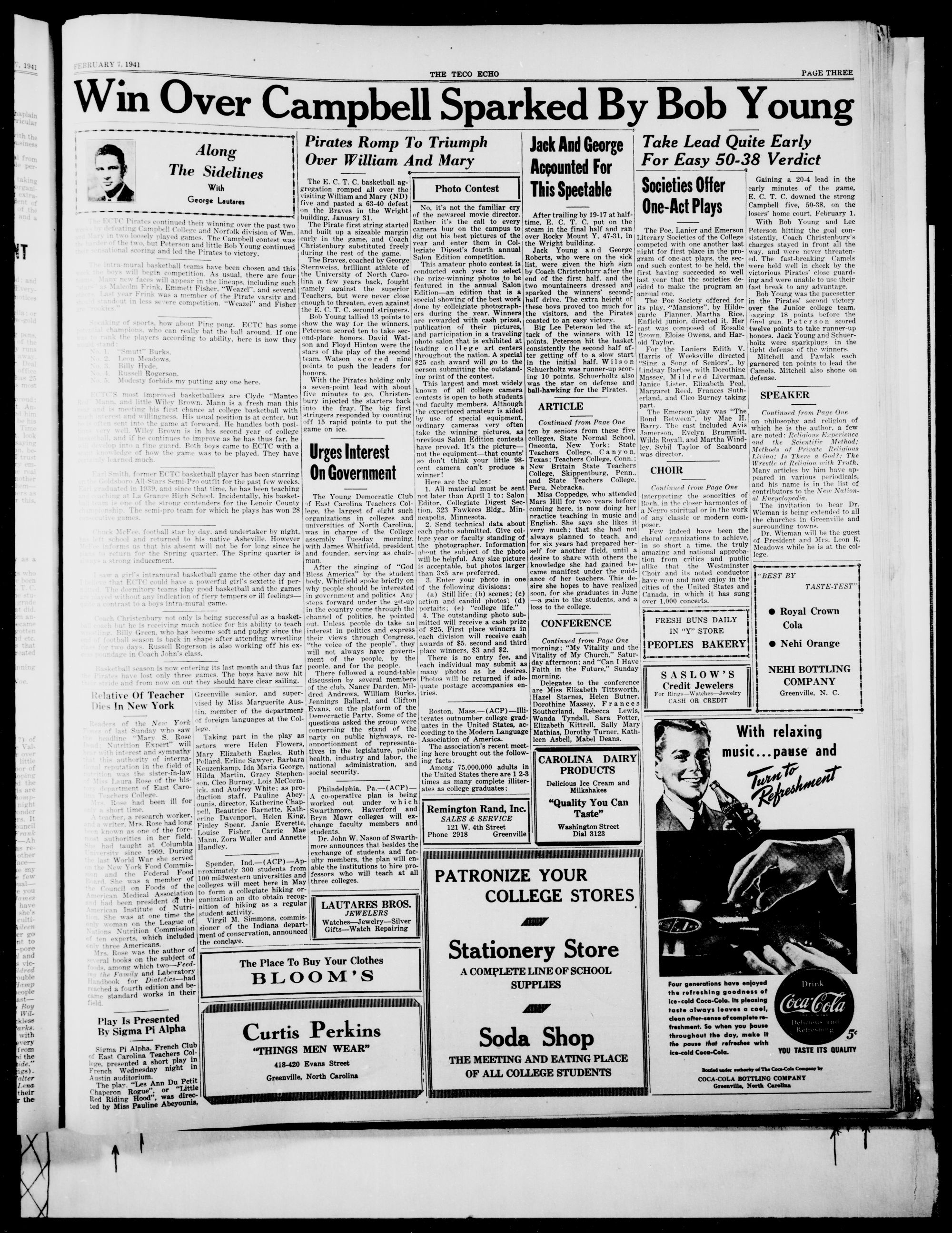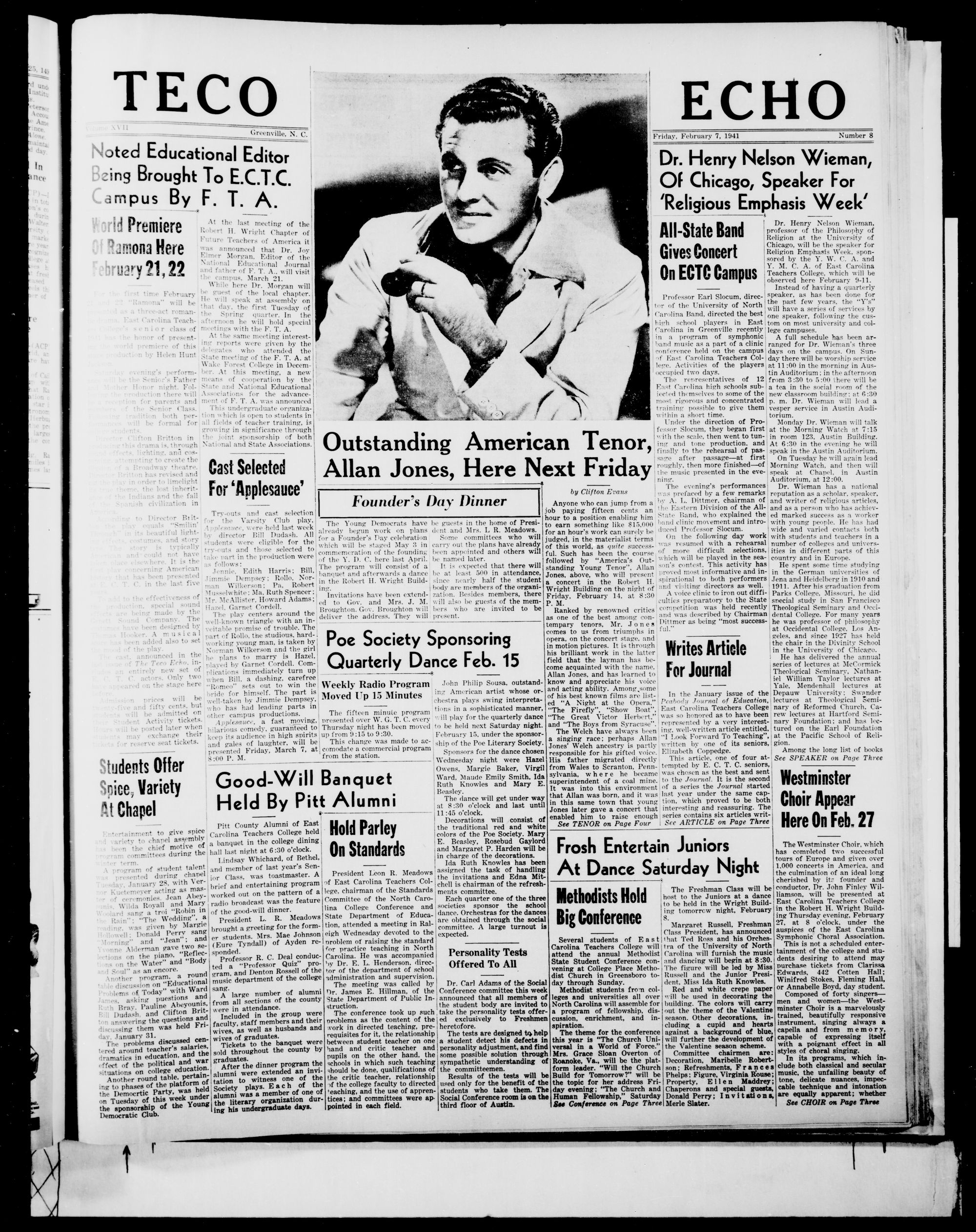 East Carolina's student-run campus newspaper was first published in 1923 as the East Carolina Teachers College News (1923-1925). It has been re-named as The Teco Echo (1925, 1926-1952), East Carolinian (1952-1969), Fountainhead (1969-1979), and The East Carolinian (1969, 1979-present). It includes local, state, national, and international stories with a focus on campus events.