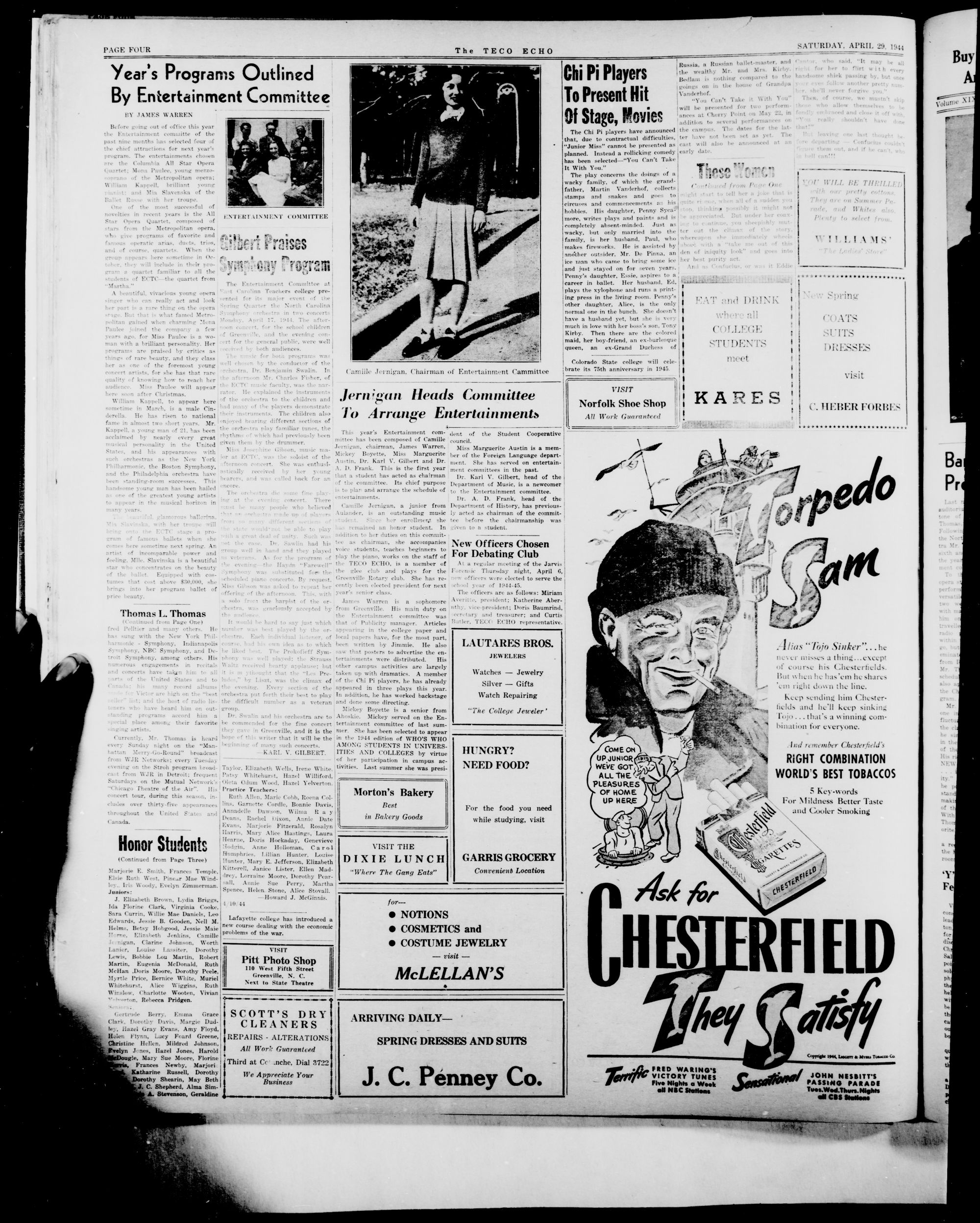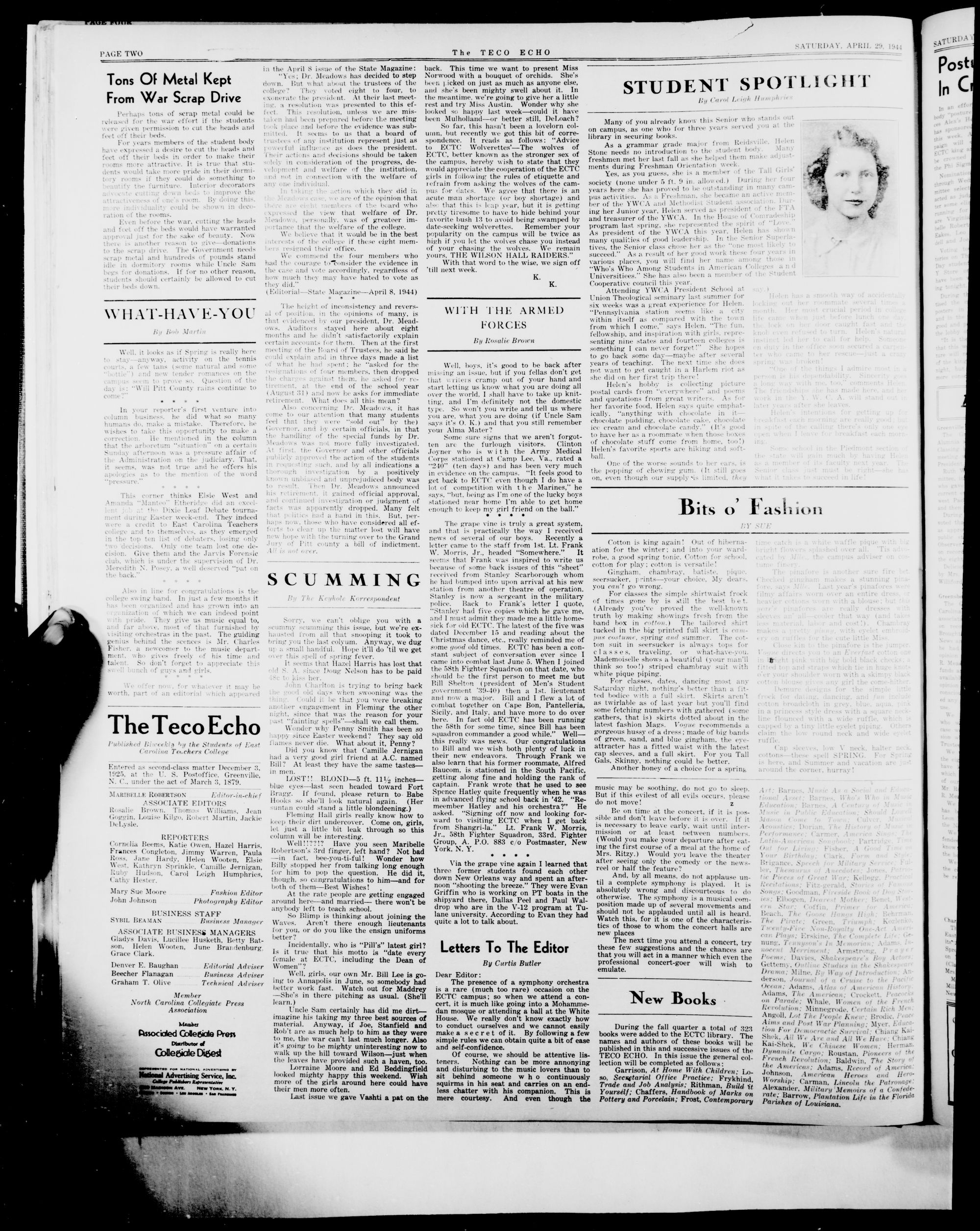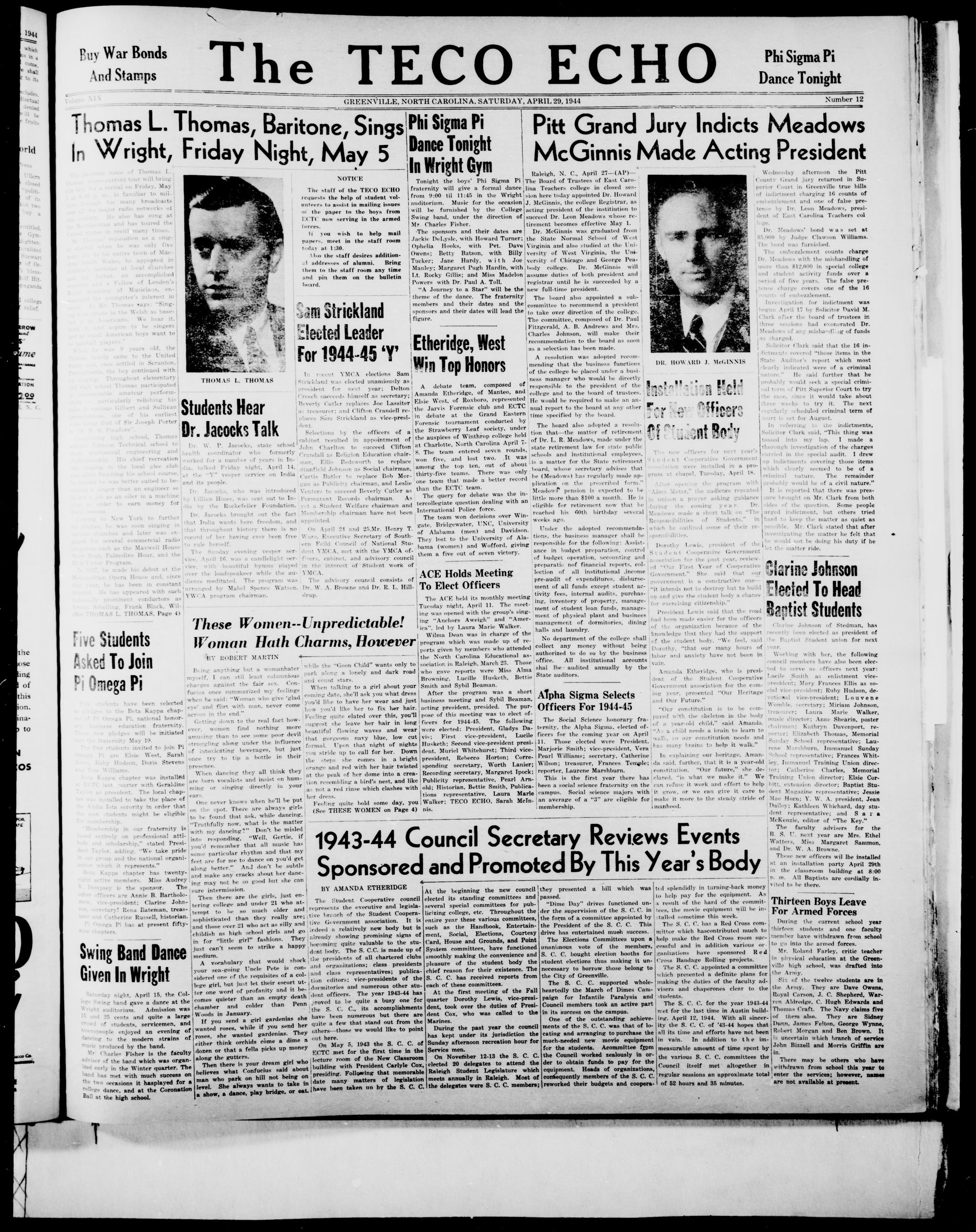 East Carolina's student-run campus newspaper was first published in 1923 as the East Carolina Teachers College News (1923-1925). It has been re-named as The Teco Echo (1925, 1926-1952), East Carolinian (1952-1969), Fountainhead (1969-1979), and The East Carolinian (1969, 1979-present). It includes local, state, national, and international stories with a focus on campus events.