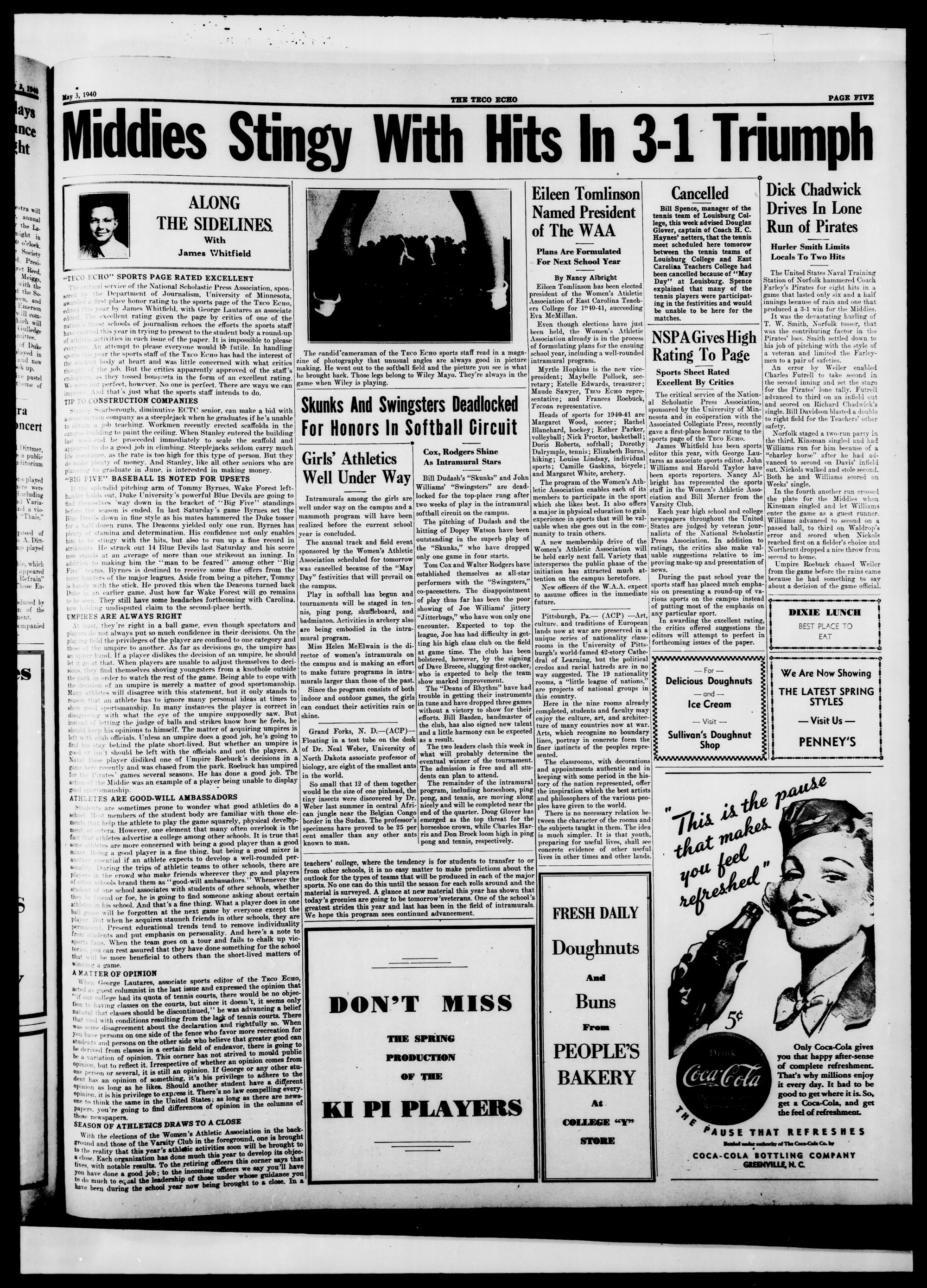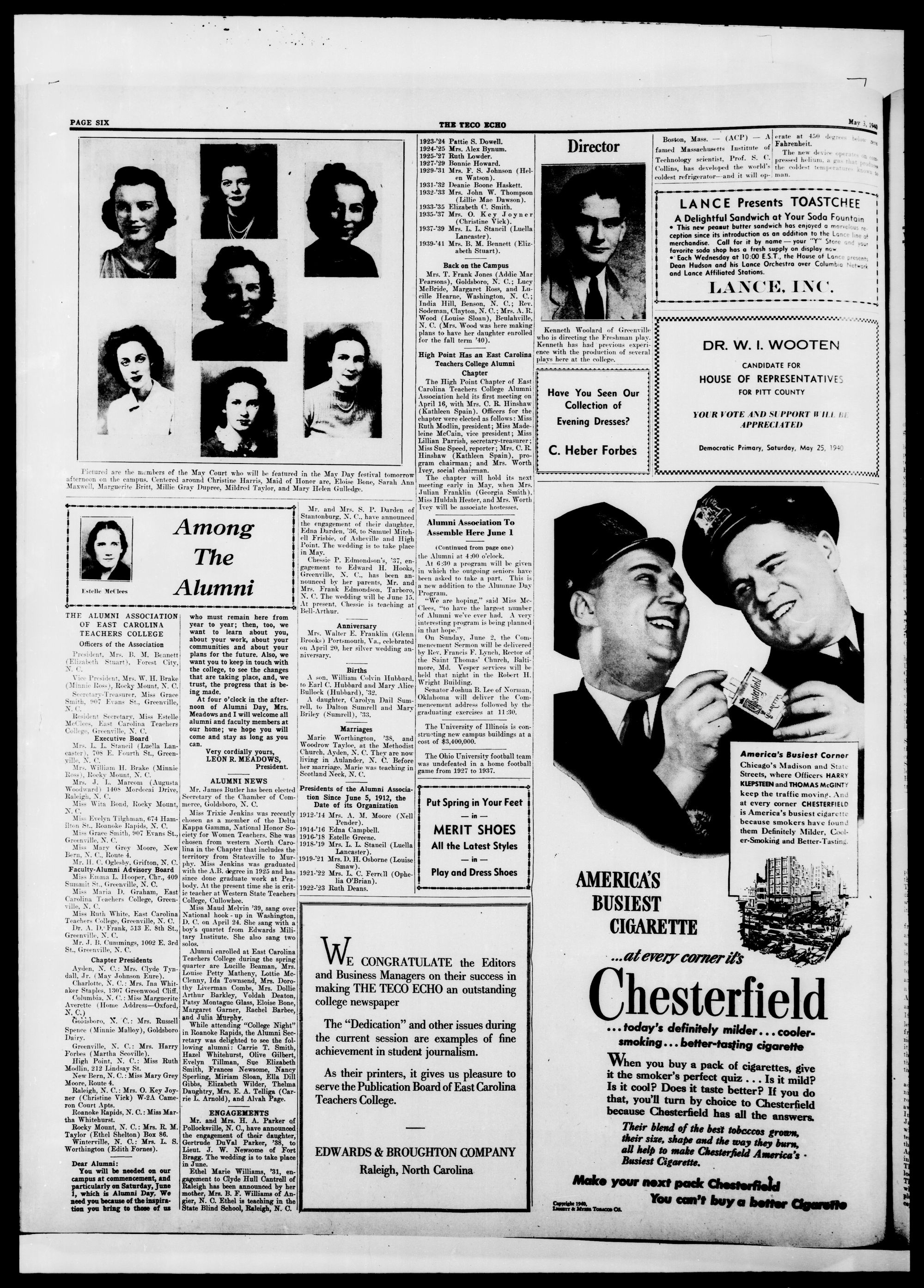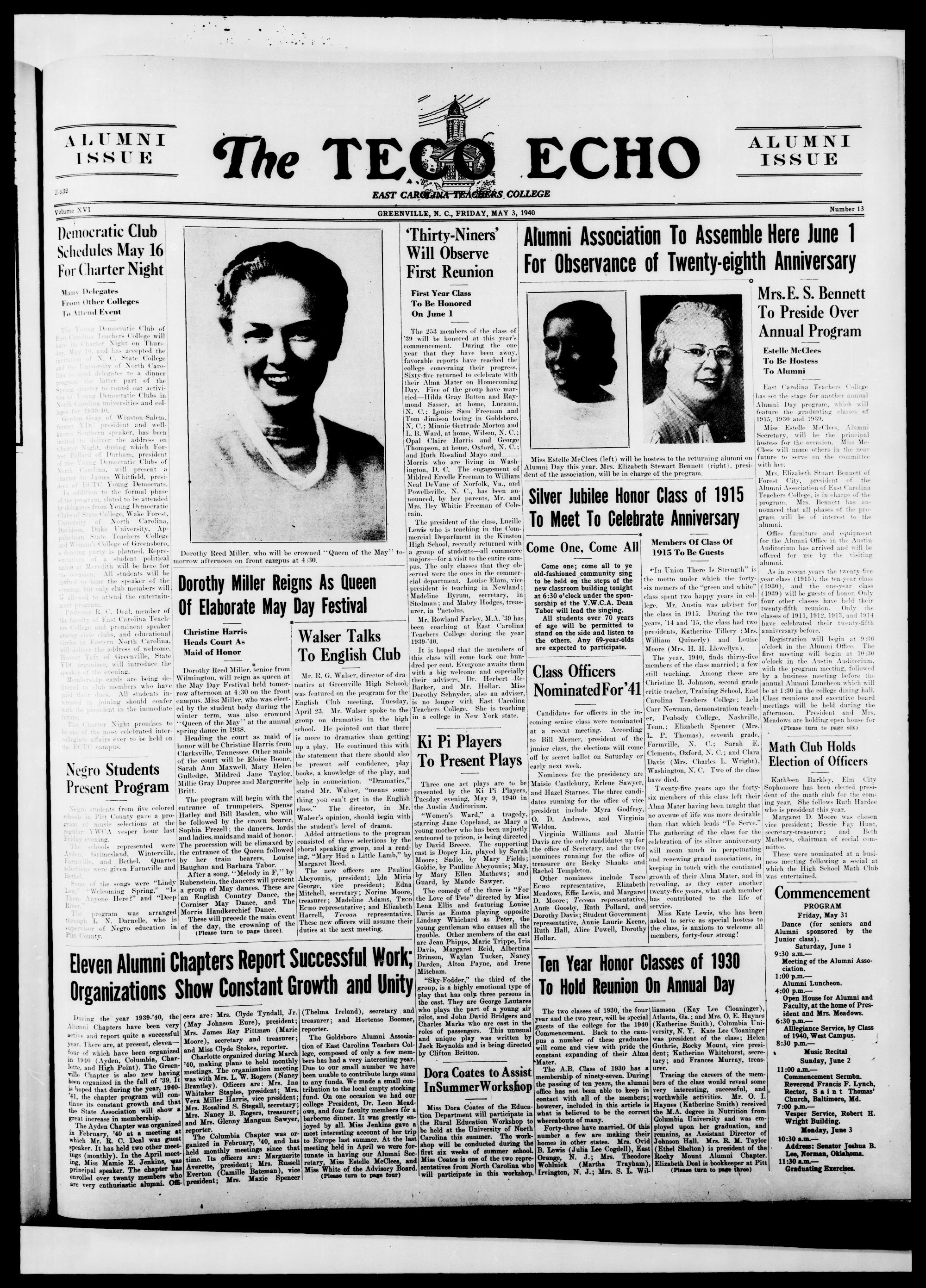 East Carolina's student-run campus newspaper was first published in 1923 as the East Carolina Teachers College News (1923-1925). It has been re-named as The Teco Echo (1925, 1926-1952), East Carolinian (1952-1969), Fountainhead (1969-1979), and The East Carolinian (1969, 1979-present). It includes local, state, national, and international stories with a focus on campus events.