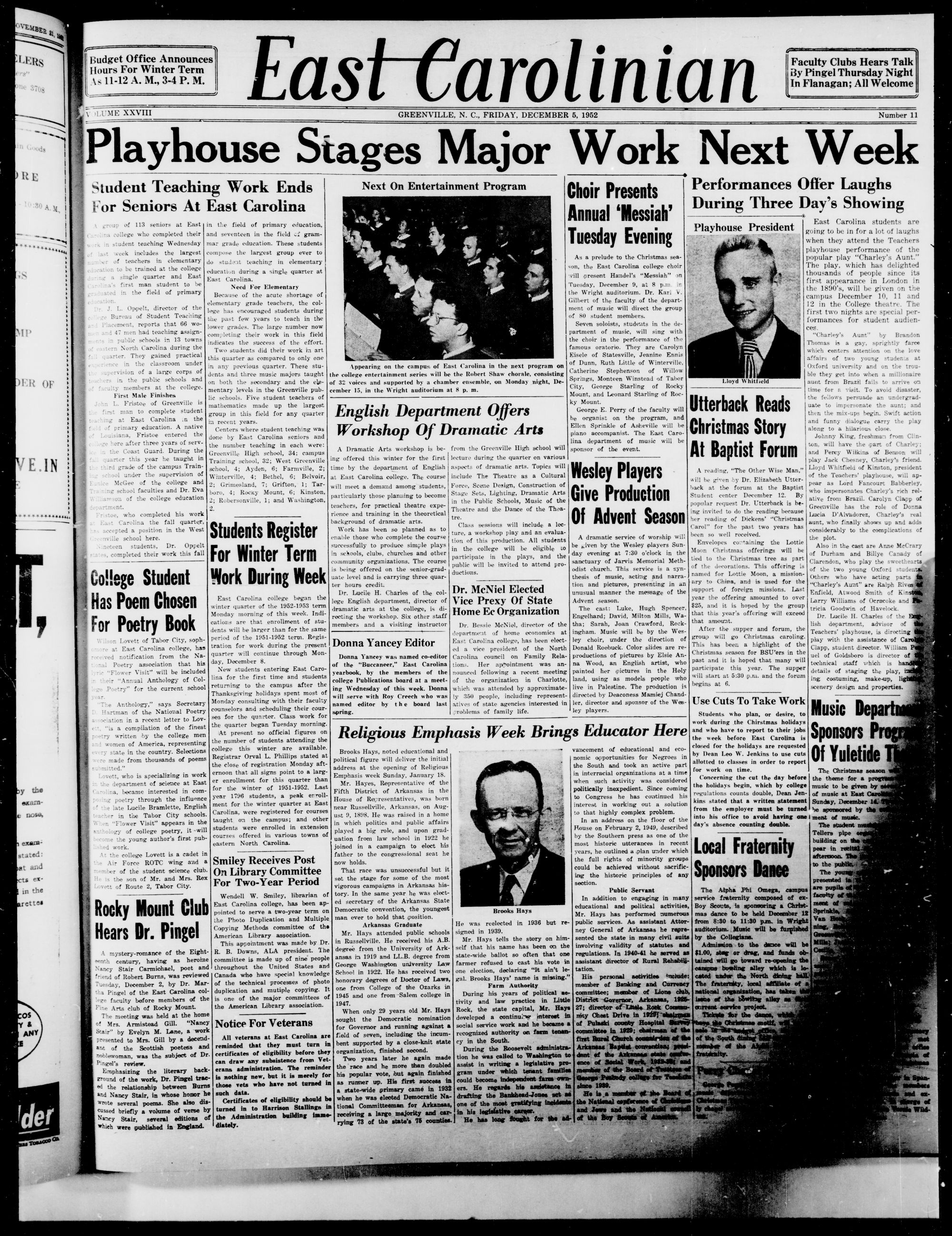 East Carolina's student-run campus newspaper was first published in 1923 as the East Carolina Teachers College News (1923-1925). It has been re-named as The Teco Echo (1925, 1926-1952), East Carolinian (1952-1969), Fountainhead (1969-1979), and The East Carolinian (1969, 1979-present). It includes local, state, national, and international stories with a focus on campus events.