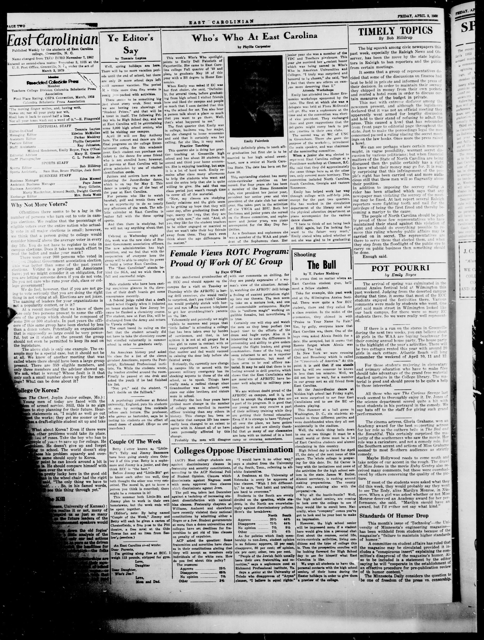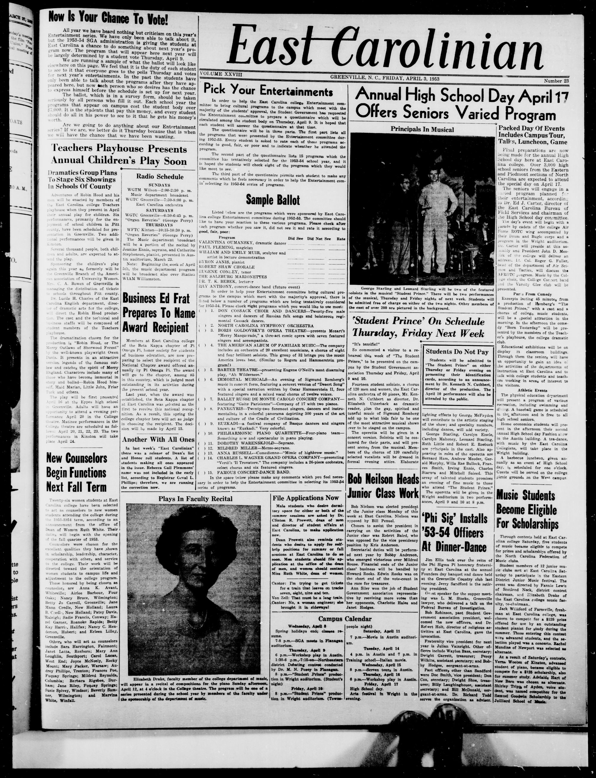 East Carolina's student-run campus newspaper was first published in 1923 as the East Carolina Teachers College News (1923-1925). It has been re-named as The Teco Echo (1925, 1926-1952), East Carolinian (1952-1969), Fountainhead (1969-1979), and The East Carolinian (1969, 1979-present). It includes local, state, national, and international stories with a focus on campus events.