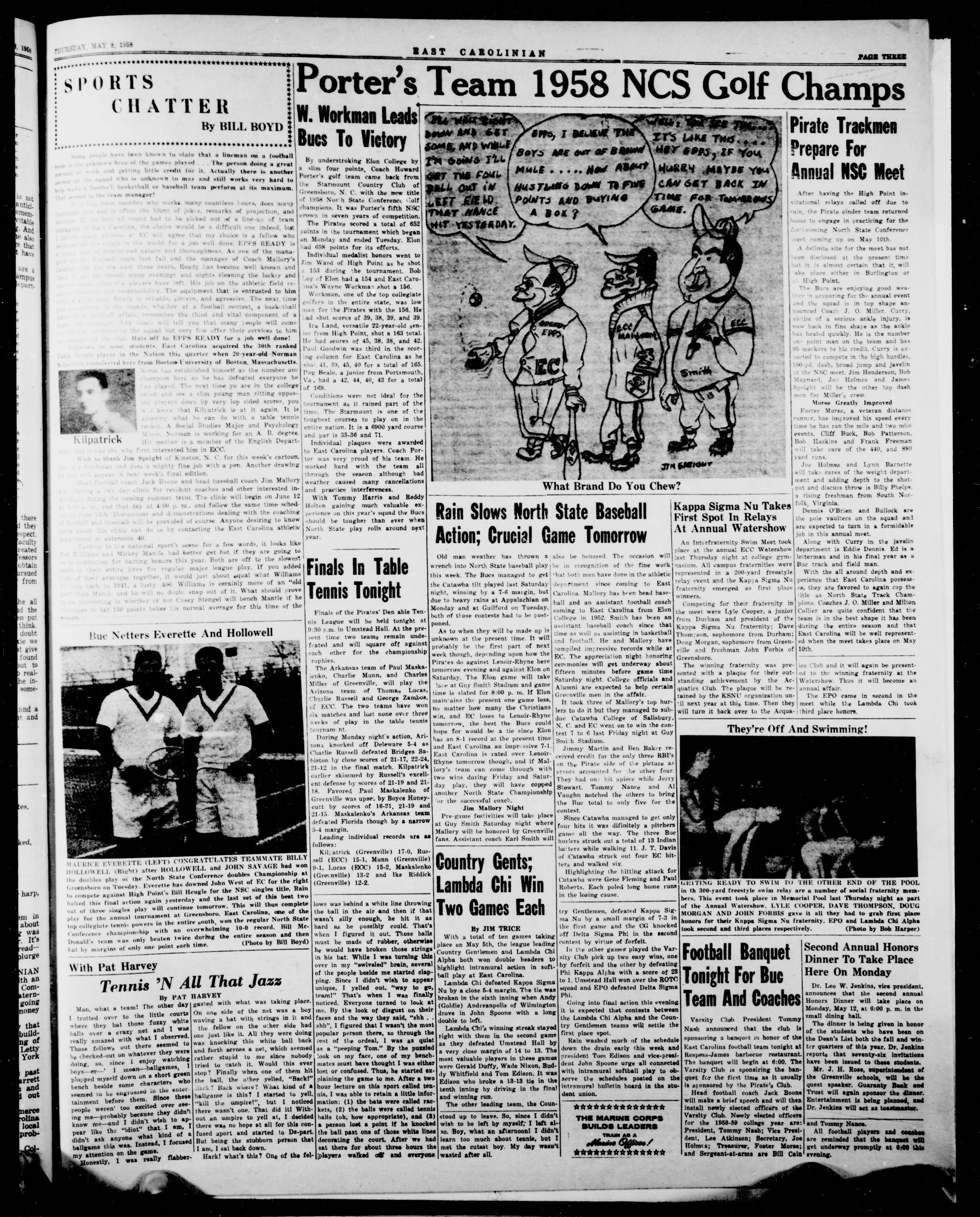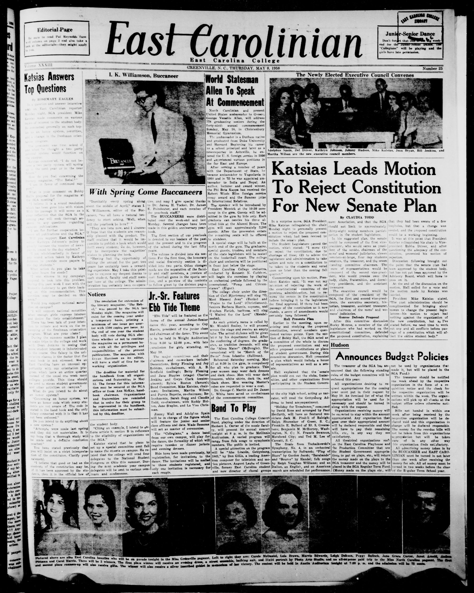 East Carolina's student-run campus newspaper was first published in 1923 as the East Carolina Teachers College News (1923-1925). It has been re-named as The Teco Echo (1925, 1926-1952), East Carolinian (1952-1969), Fountainhead (1969-1979), and The East Carolinian (1969, 1979-present). It includes local, state, national, and international stories with a focus on campus events.