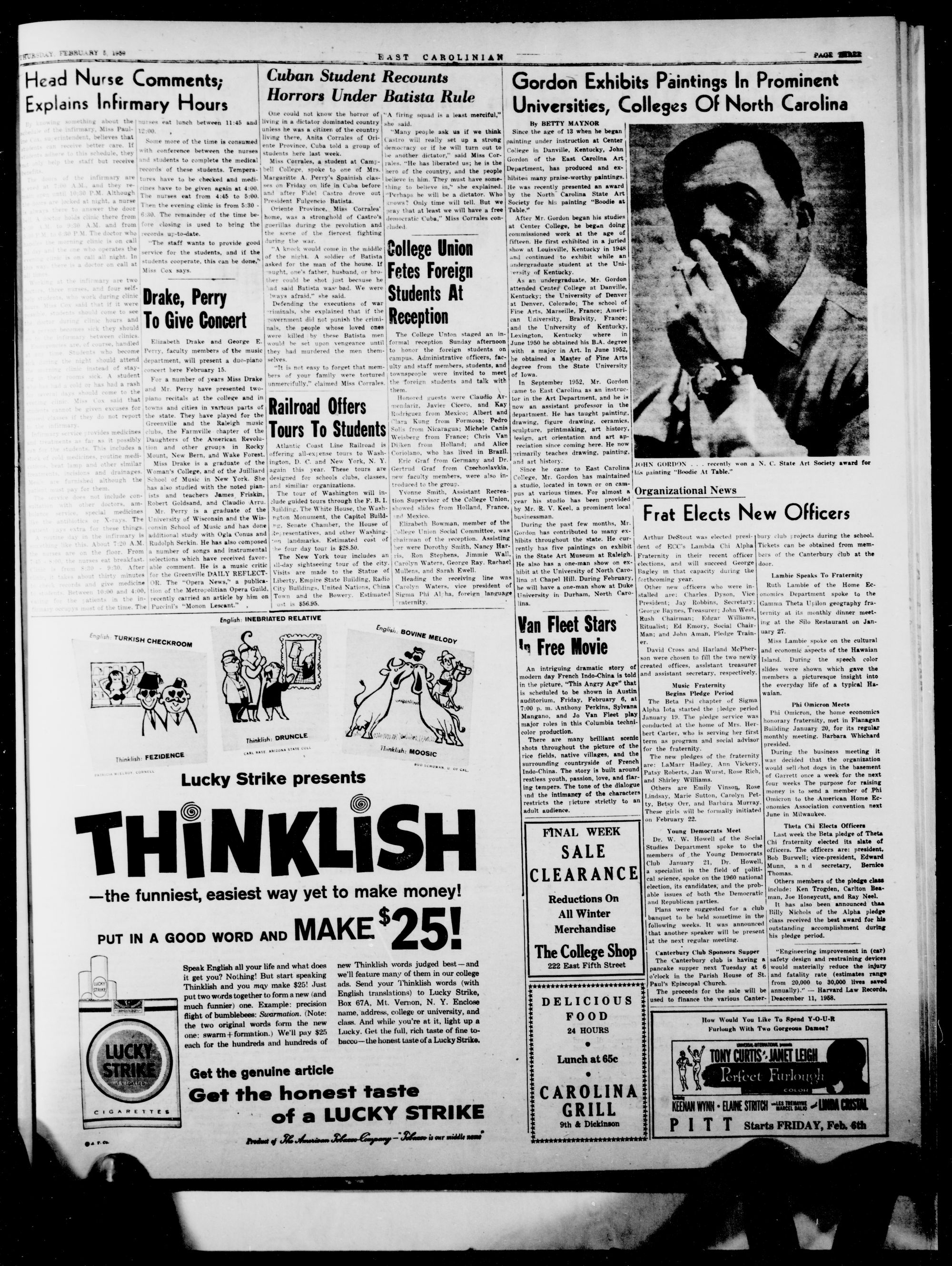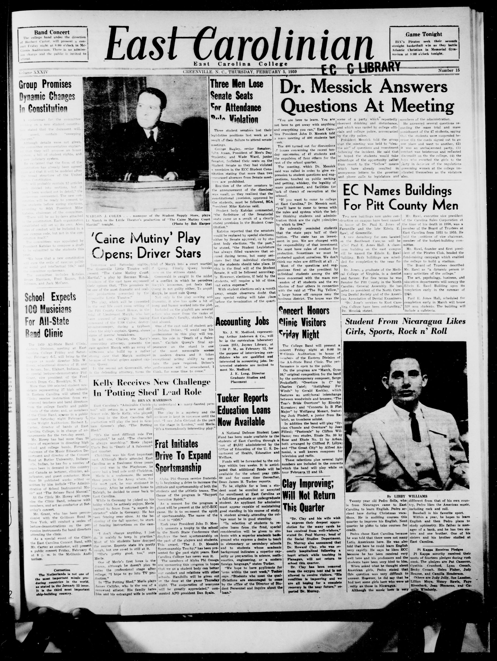 East Carolina's student-run campus newspaper was first published in 1923 as the East Carolina Teachers College News (1923-1925). It has been re-named as The Teco Echo (1925, 1926-1952), East Carolinian (1952-1969), Fountainhead (1969-1979), and The East Carolinian (1969, 1979-present). It includes local, state, national, and international stories with a focus on campus events.