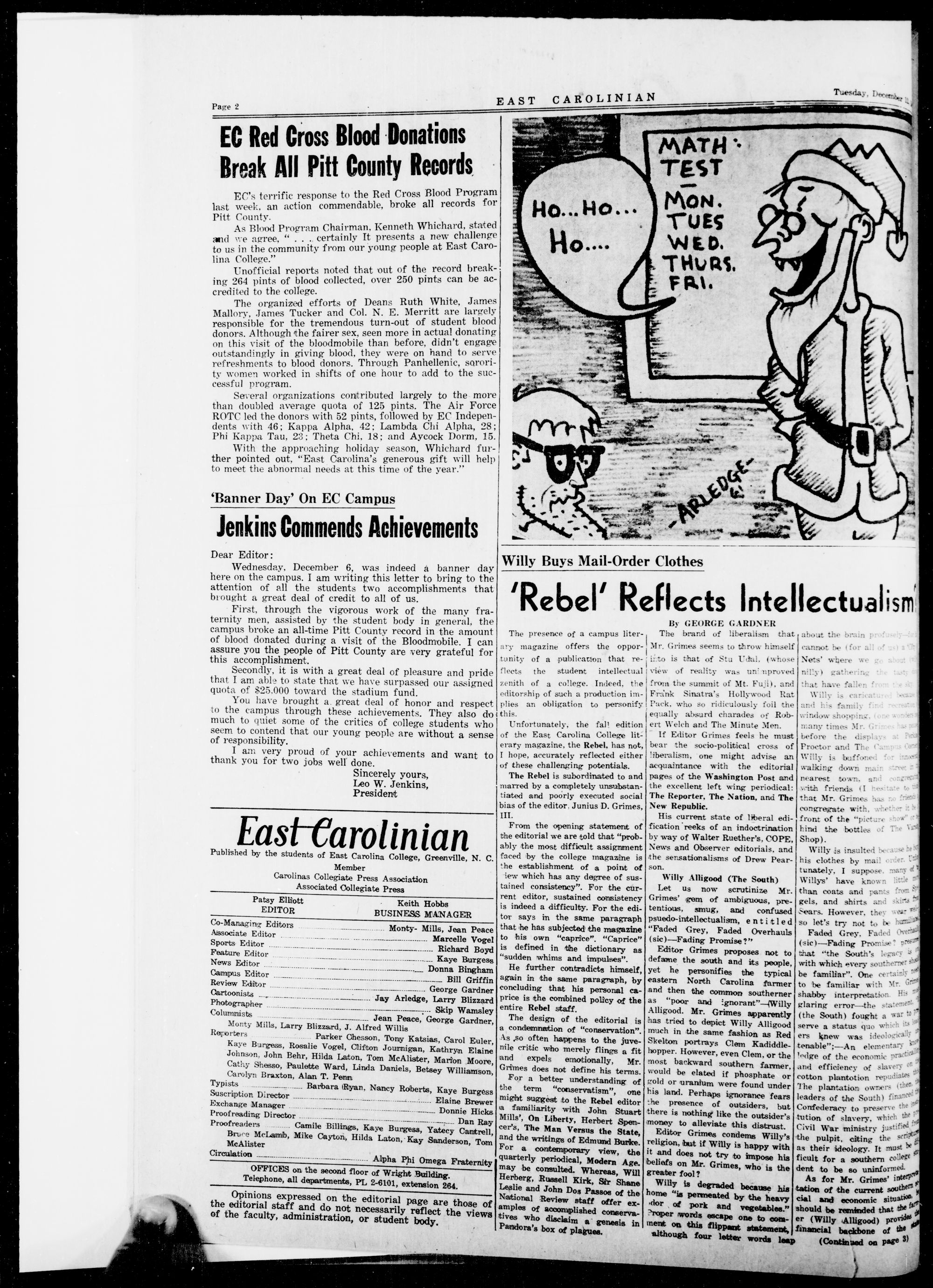 East Carolina's student-run campus newspaper was first published in 1923 as the East Carolina Teachers College News (1923-1925). It has been re-named as The Teco Echo (1925, 1926-1952), East Carolinian (1952-1969), Fountainhead (1969-1979), and The East Carolinian (1969, 1979-present). It includes local, state, national, and international stories with a focus on campus events.