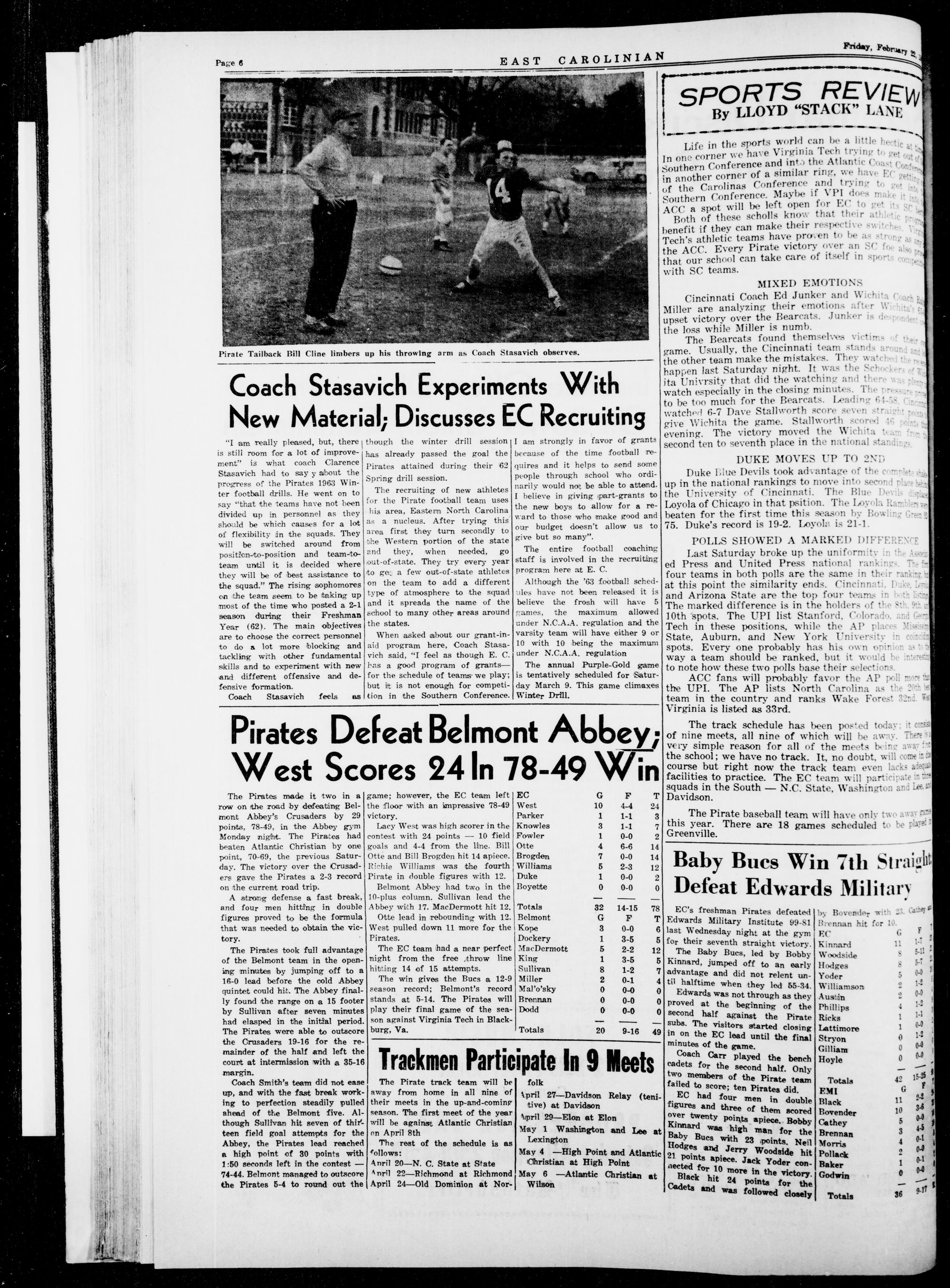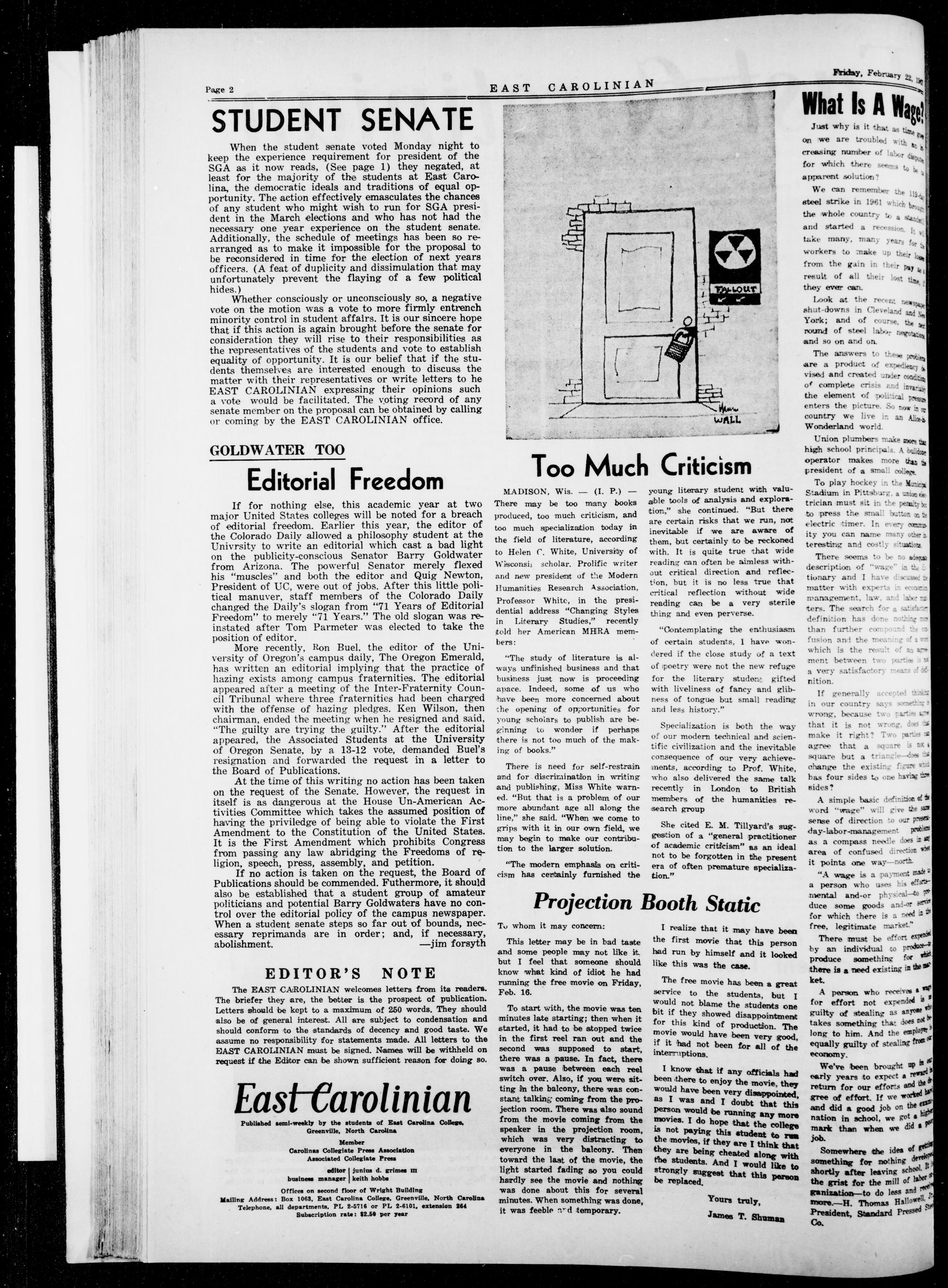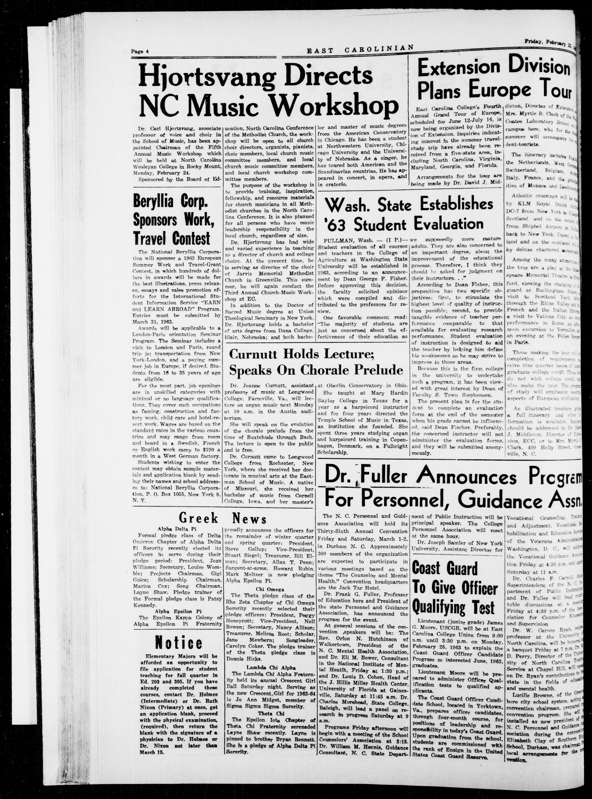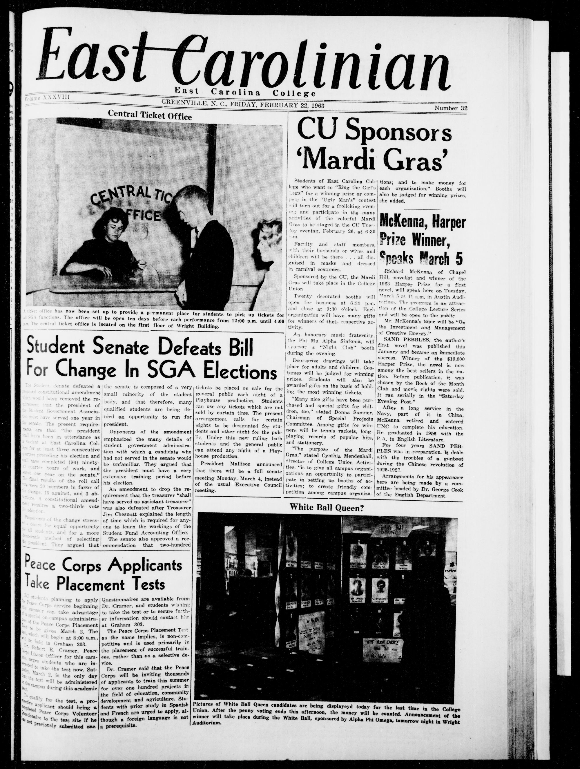 East Carolina's student-run campus newspaper was first published in 1923 as the East Carolina Teachers College News (1923-1925). It has been re-named as The Teco Echo (1925, 1926-1952), East Carolinian (1952-1969), Fountainhead (1969-1979), and The East Carolinian (1969, 1979-present). It includes local, state, national, and international stories with a focus on campus events.