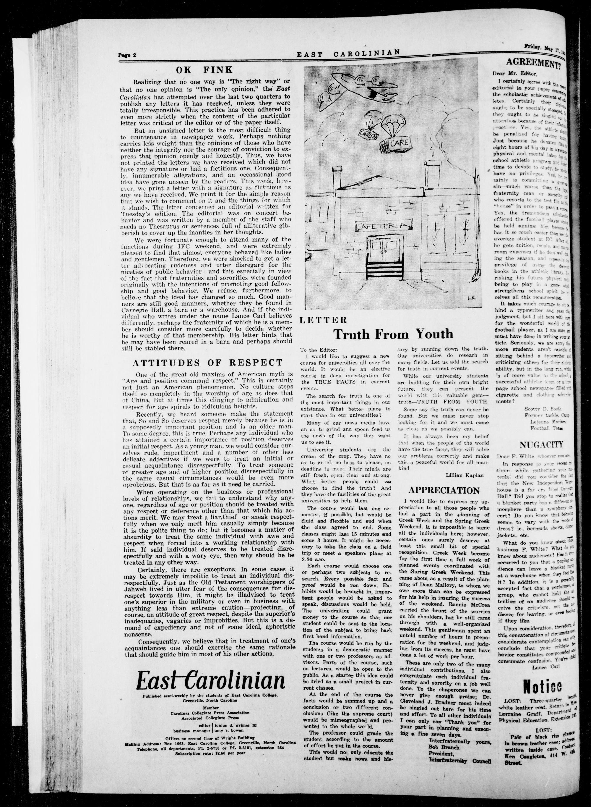 East Carolina's student-run campus newspaper was first published in 1923 as the East Carolina Teachers College News (1923-1925). It has been re-named as The Teco Echo (1925, 1926-1952), East Carolinian (1952-1969), Fountainhead (1969-1979), and The East Carolinian (1969, 1979-present). It includes local, state, national, and international stories with a focus on campus events.