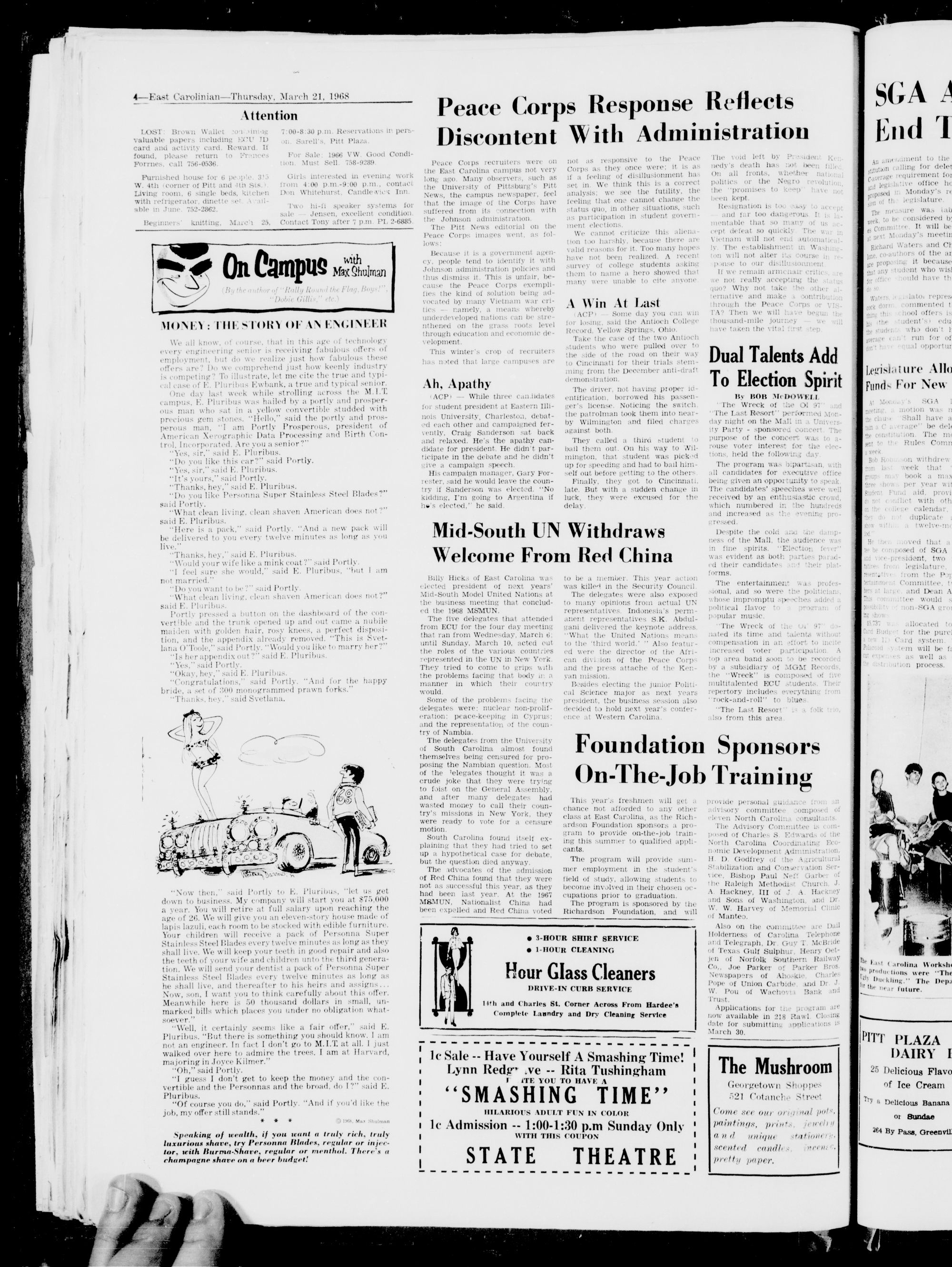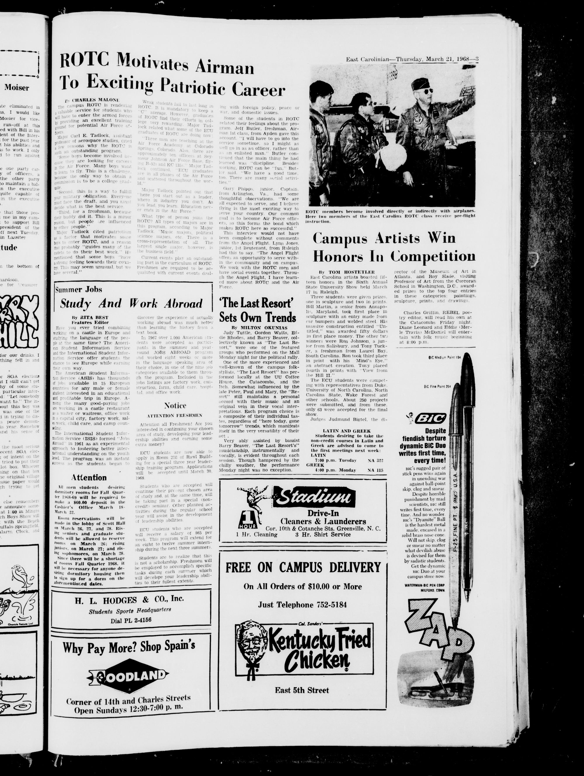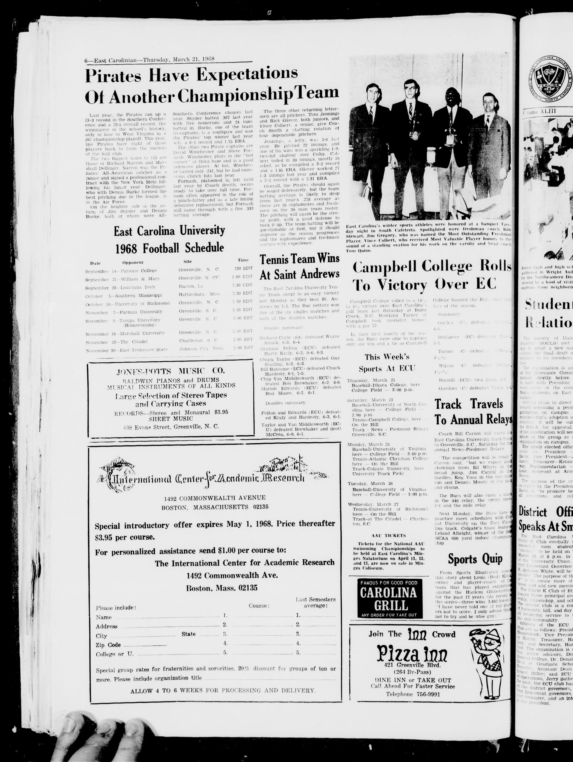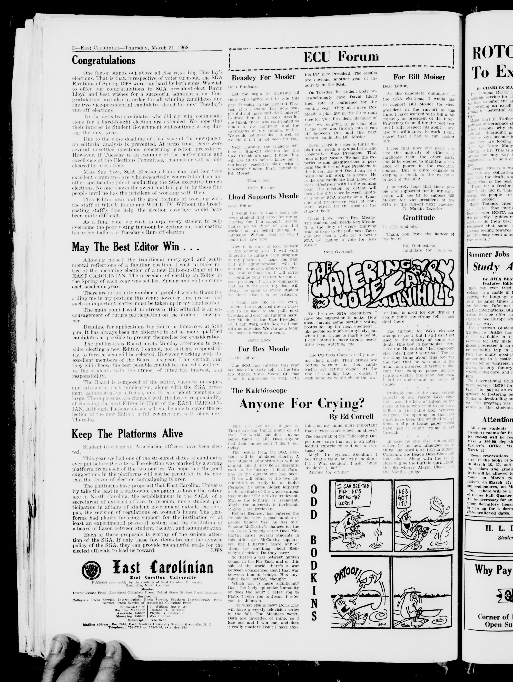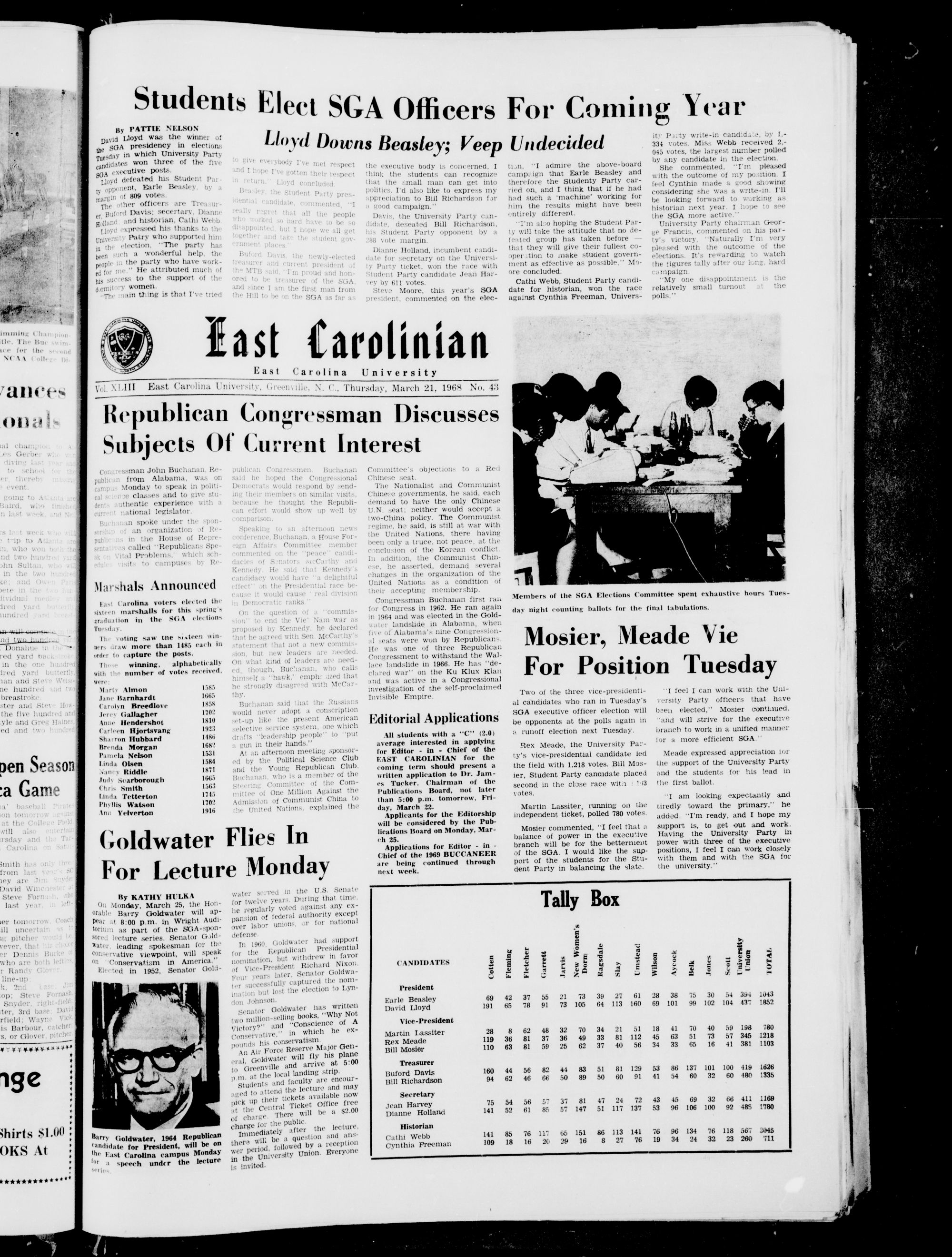 East Carolina's student-run campus newspaper was first published in 1923 as the East Carolina Teachers College News (1923-1925). It has been re-named as The Teco Echo (1925, 1926-1952), East Carolinian (1952-1969), Fountainhead (1969-1979), and The East Carolinian (1969, 1979-present). It includes local, state, national, and international stories with a focus on campus events.