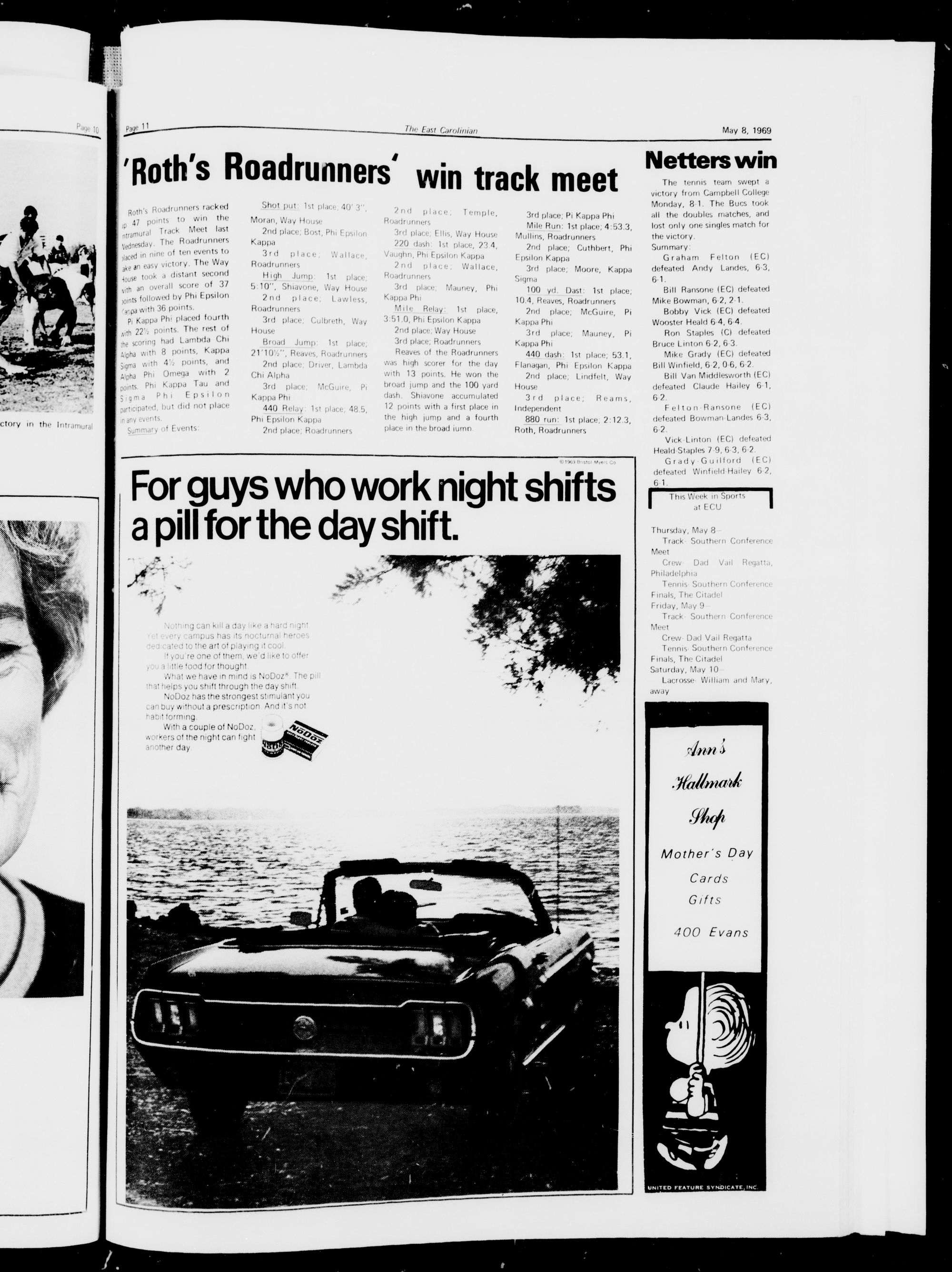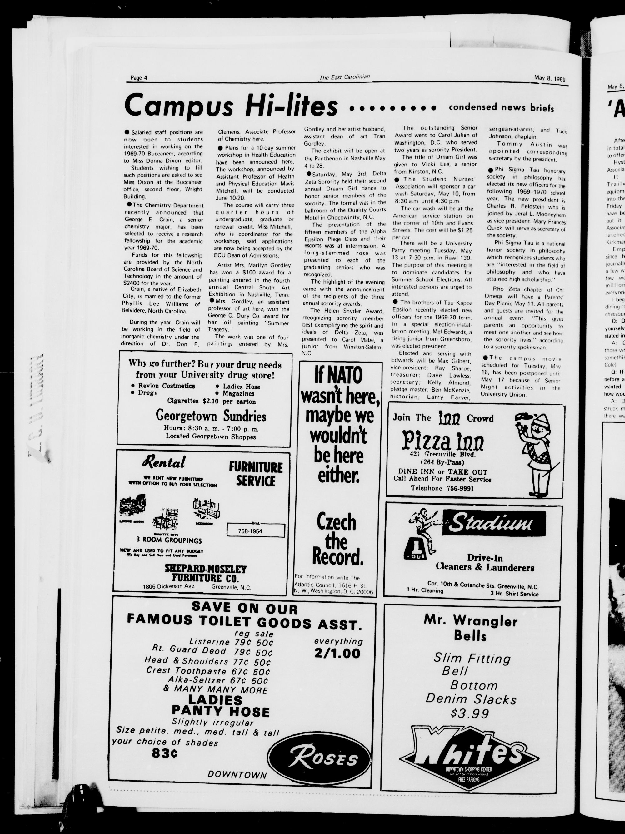 East Carolina's student-run campus newspaper was first published in 1923 as the East Carolina Teachers College News (1923-1925). It has been re-named as The Teco Echo (1925, 1926-1952), East Carolinian (1952-1969), Fountainhead (1969-1979), and The East Carolinian (1969, 1979-present). It includes local, state, national, and international stories with a focus on campus events.