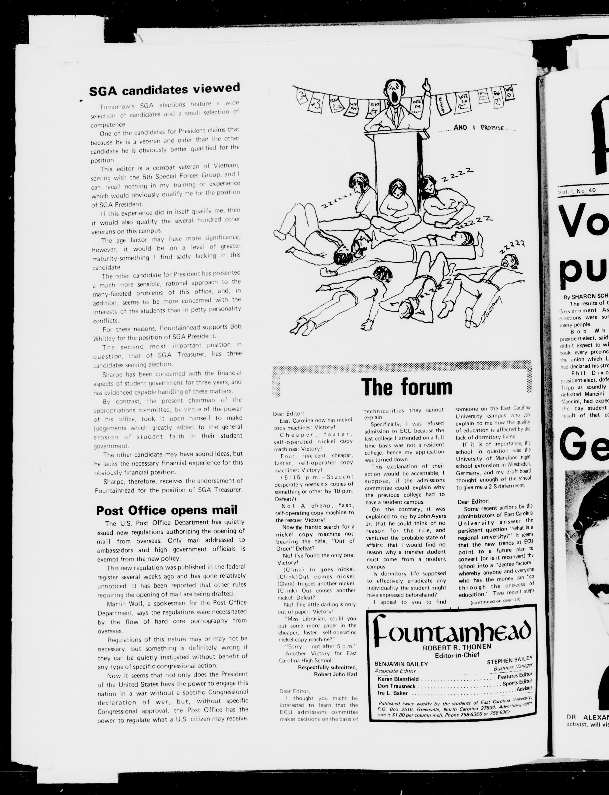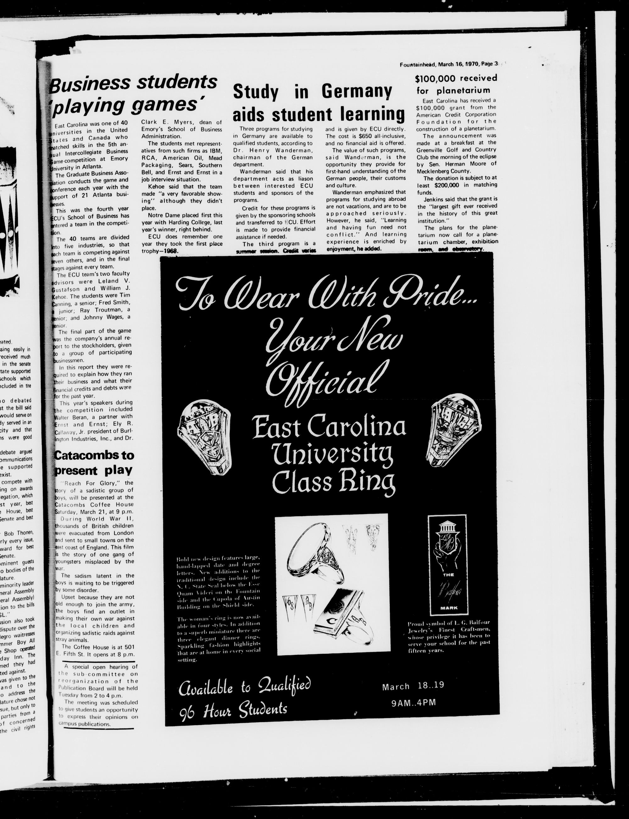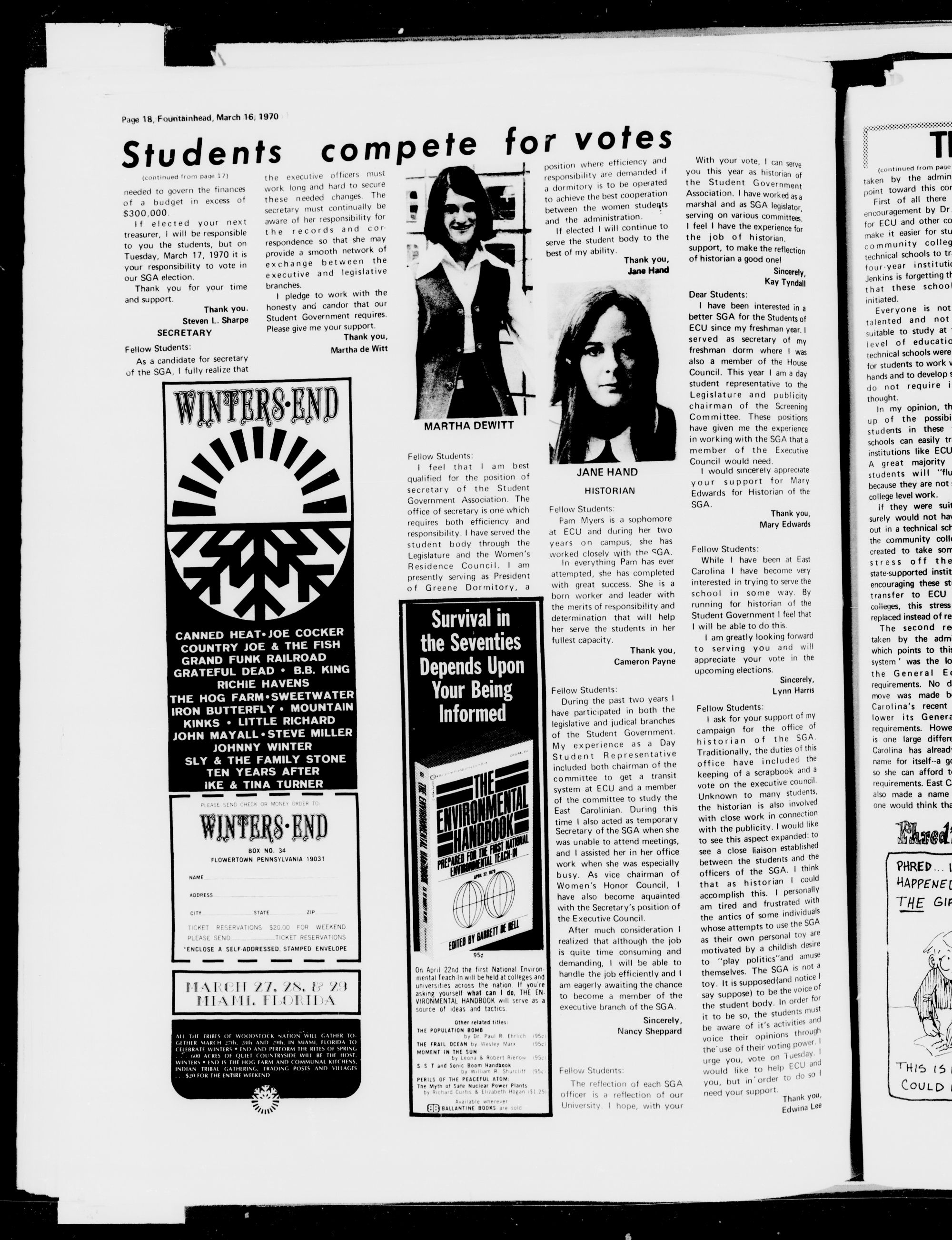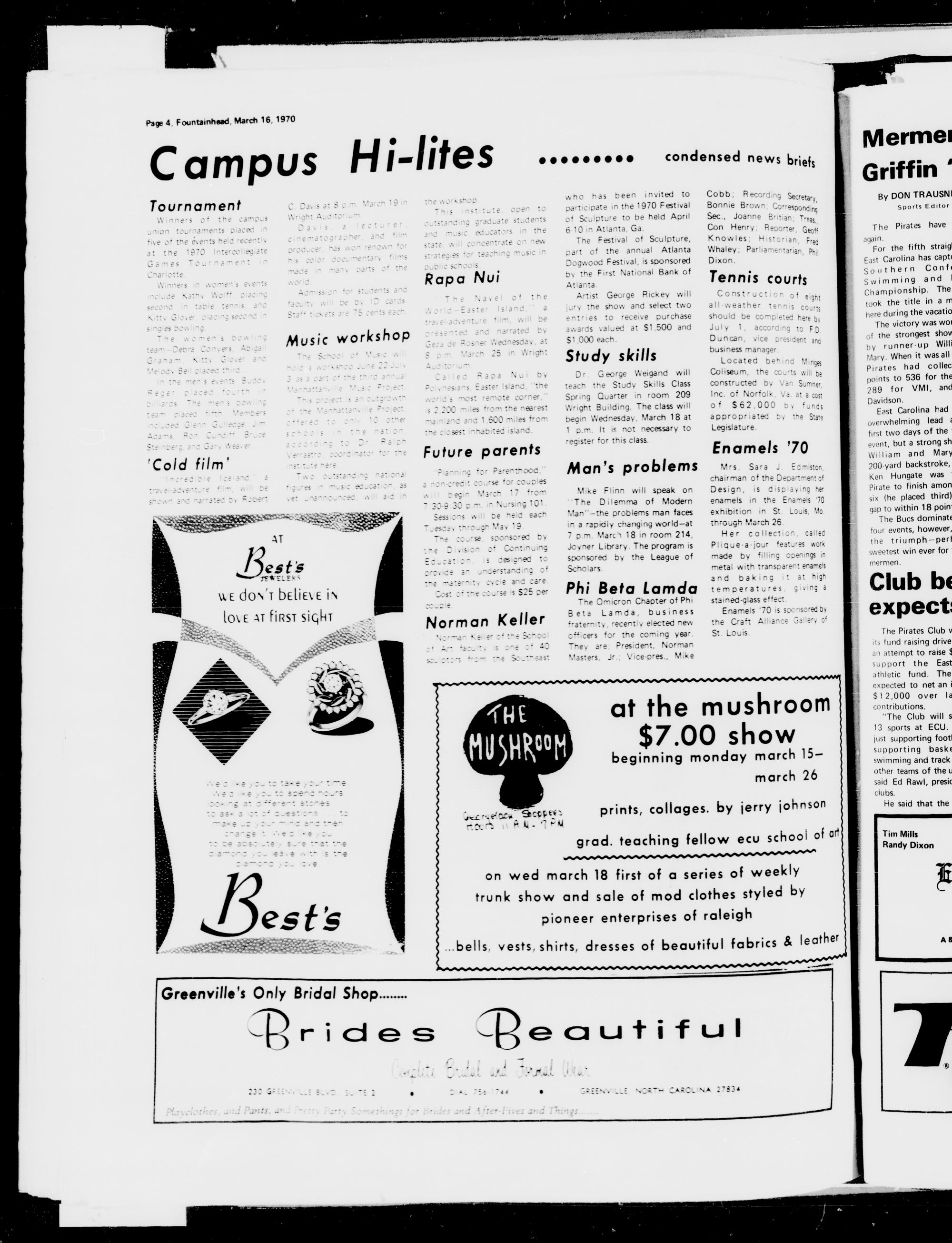 East Carolina's student-run campus newspaper was first published in 1923 as the East Carolina Teachers College News (1923-1925). It has been re-named as The Teco Echo (1925, 1926-1952), East Carolinian (1952-1969), Fountainhead (1969-1979), and The East Carolinian (1969, 1979-present). It includes local, state, national, and international stories with a focus on campus events.