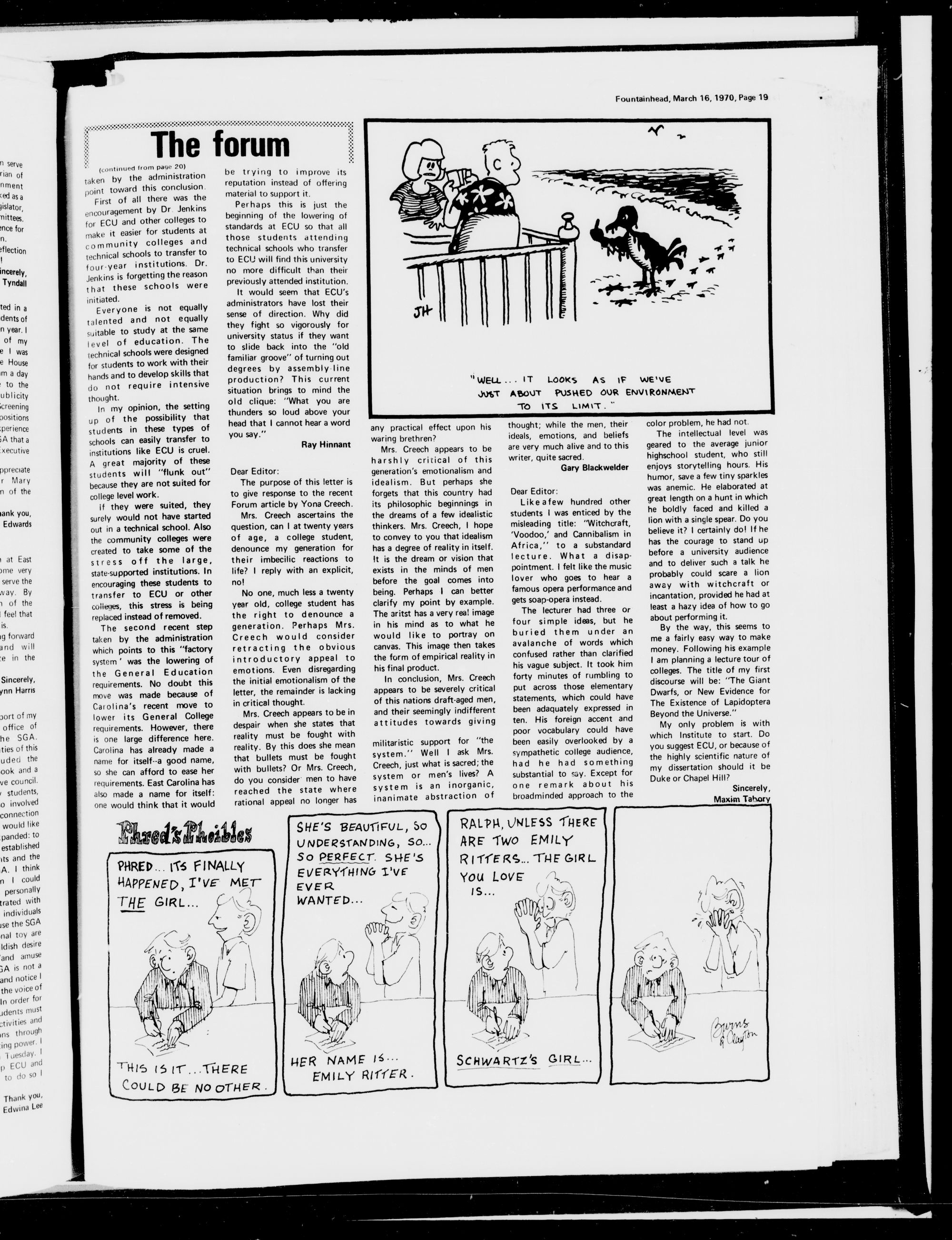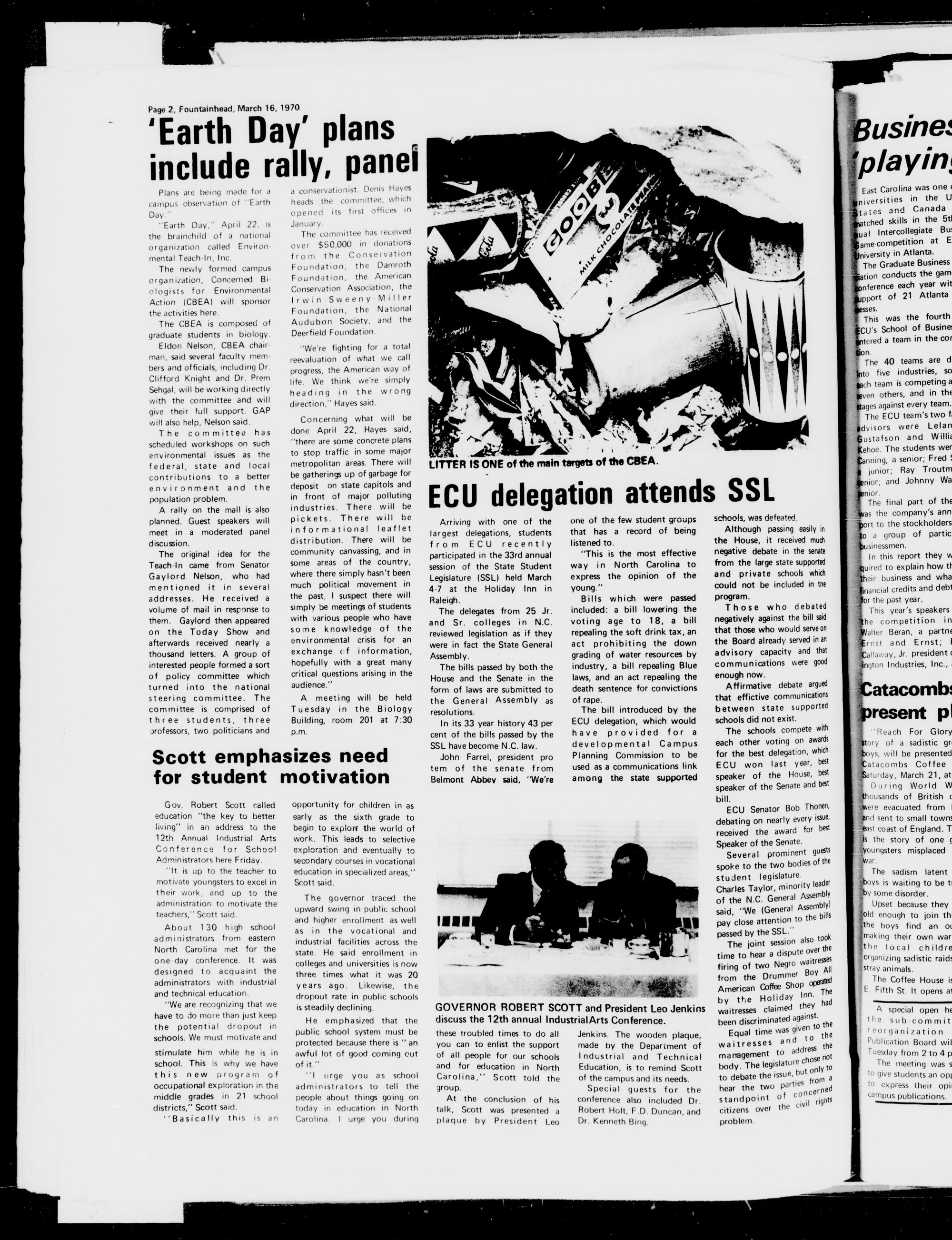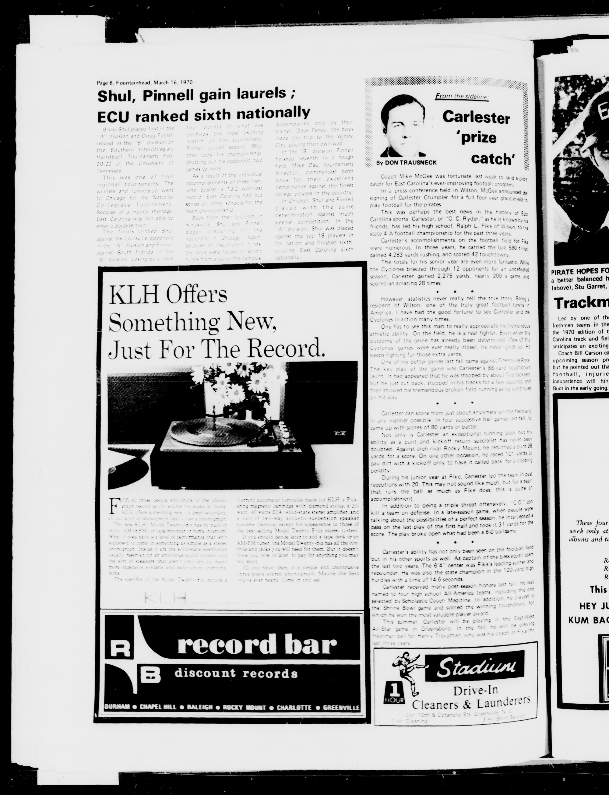 East Carolina's student-run campus newspaper was first published in 1923 as the East Carolina Teachers College News (1923-1925). It has been re-named as The Teco Echo (1925, 1926-1952), East Carolinian (1952-1969), Fountainhead (1969-1979), and The East Carolinian (1969, 1979-present). It includes local, state, national, and international stories with a focus on campus events.