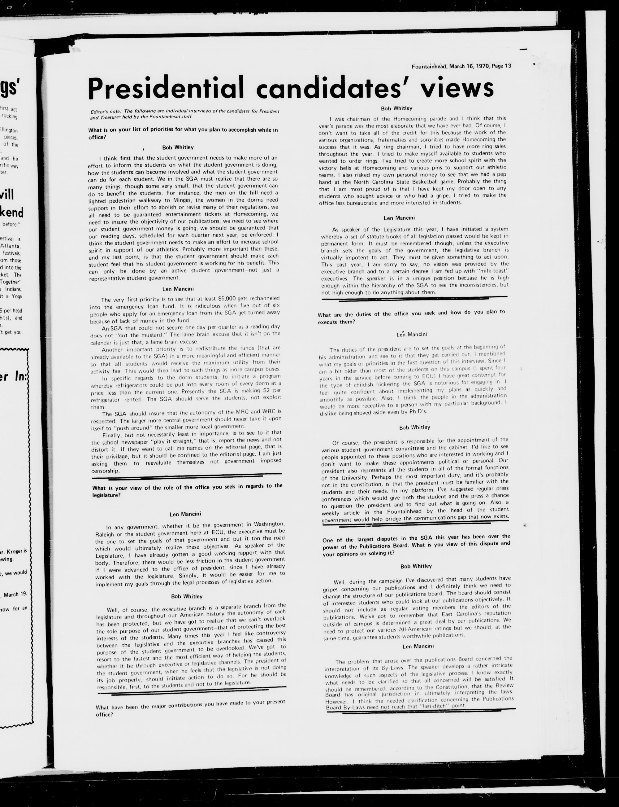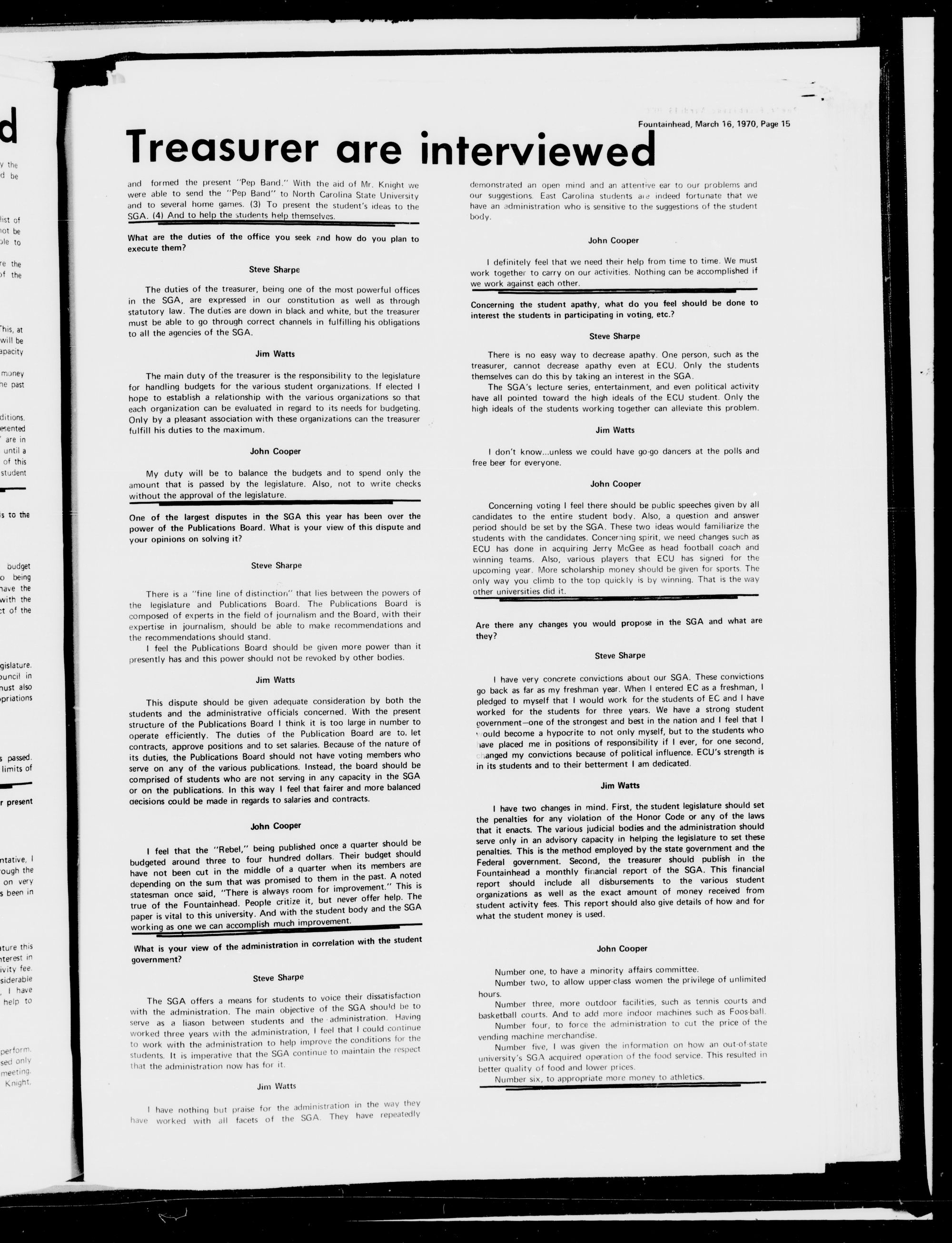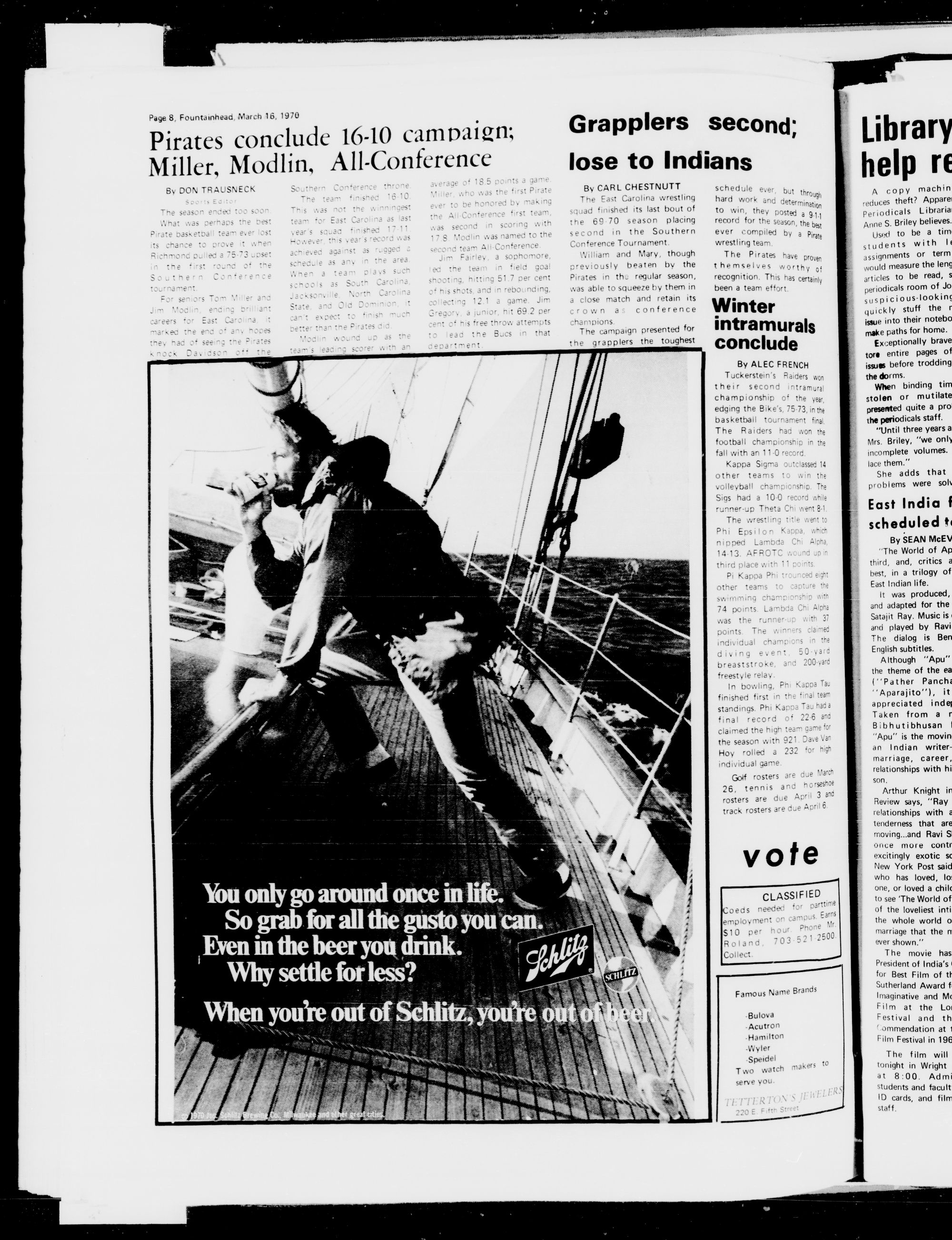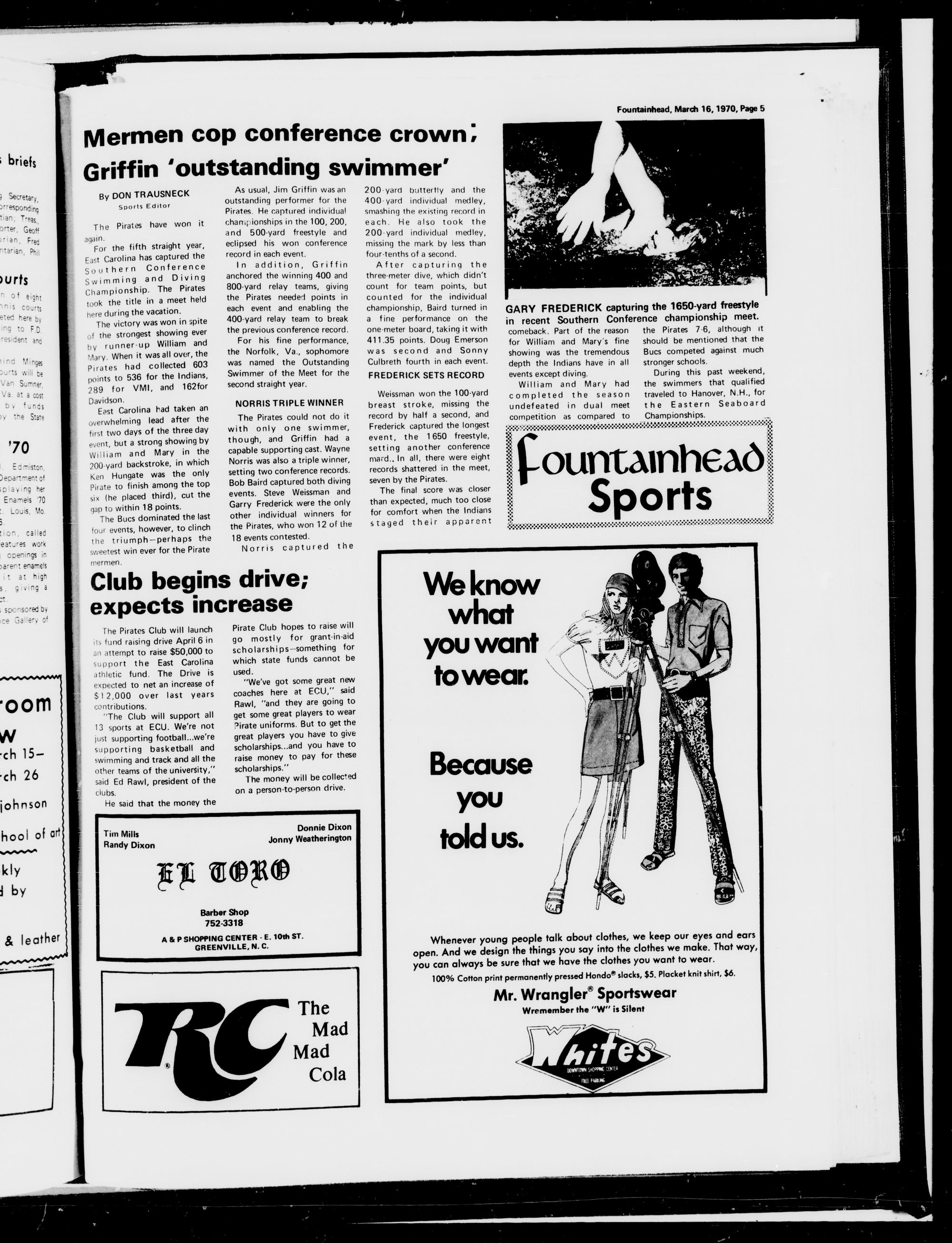 East Carolina's student-run campus newspaper was first published in 1923 as the East Carolina Teachers College News (1923-1925). It has been re-named as The Teco Echo (1925, 1926-1952), East Carolinian (1952-1969), Fountainhead (1969-1979), and The East Carolinian (1969, 1979-present). It includes local, state, national, and international stories with a focus on campus events.