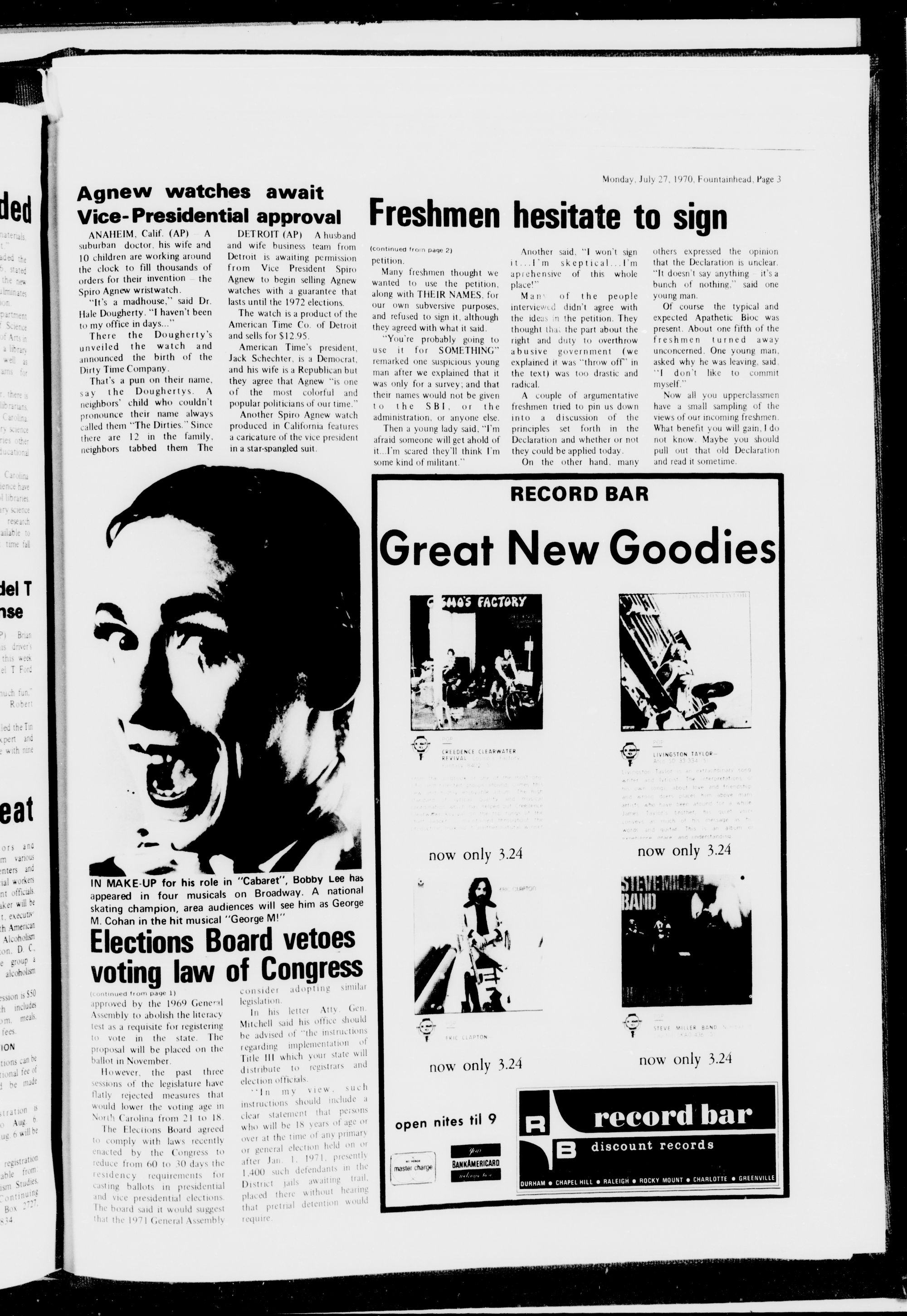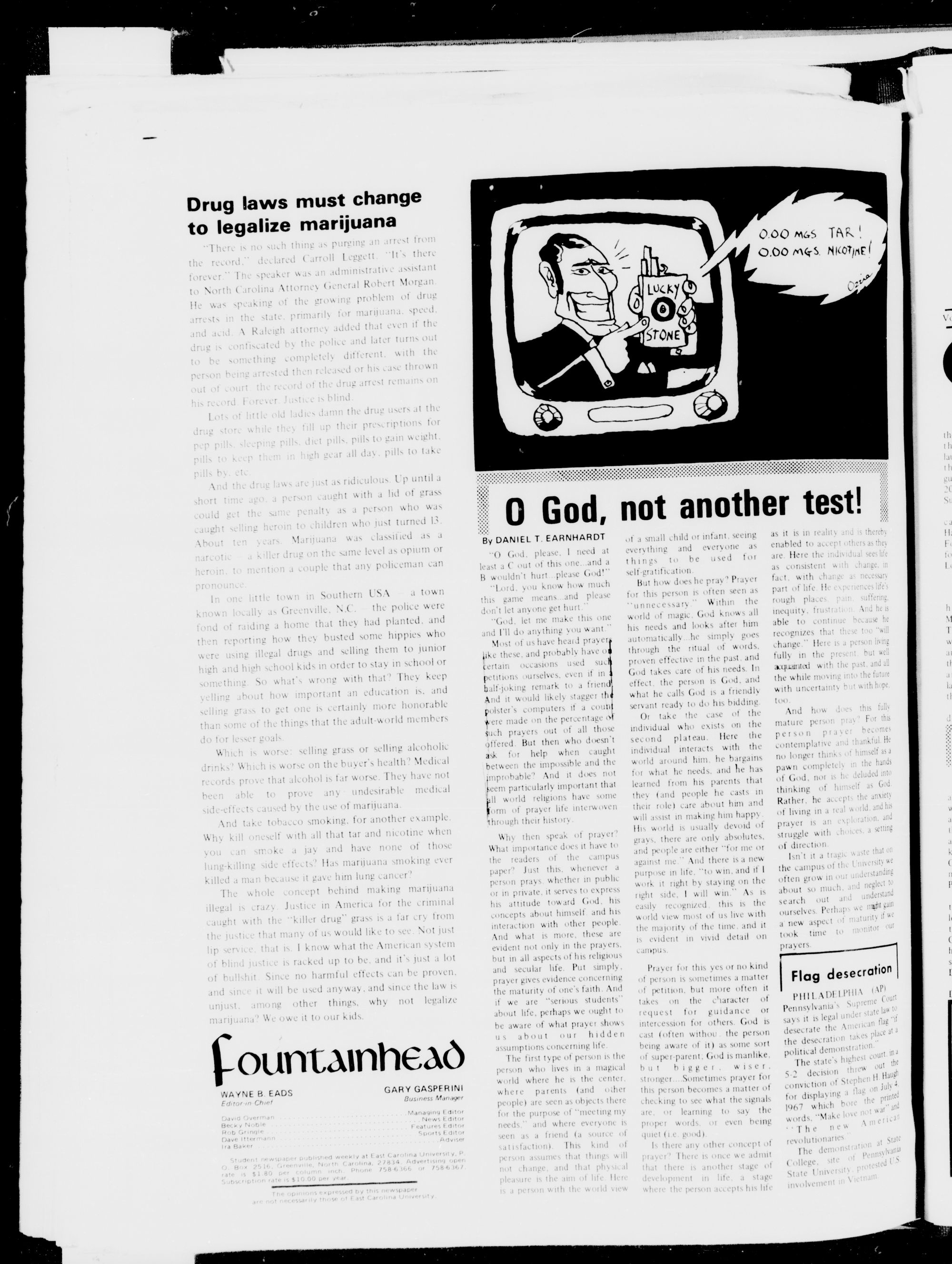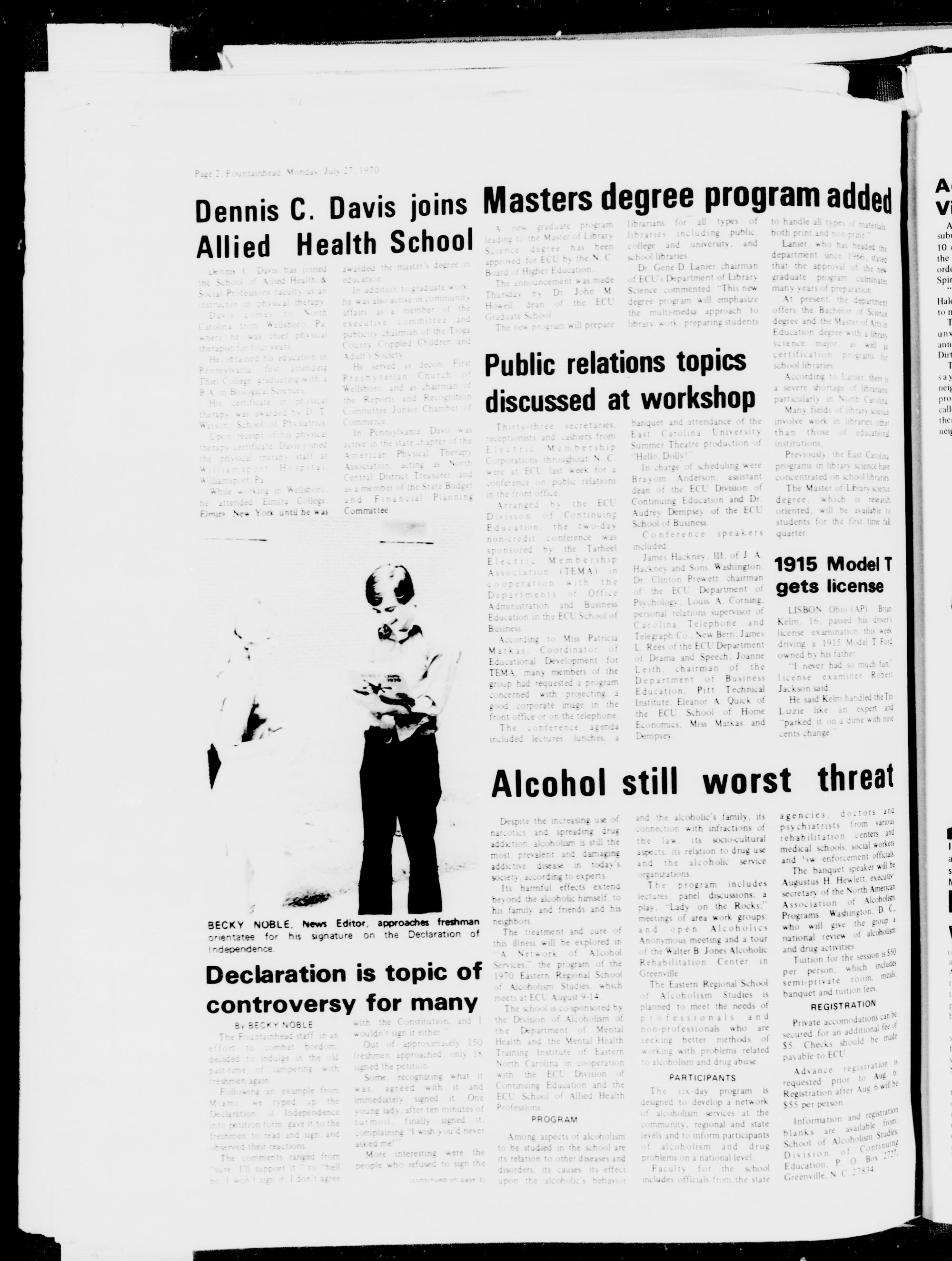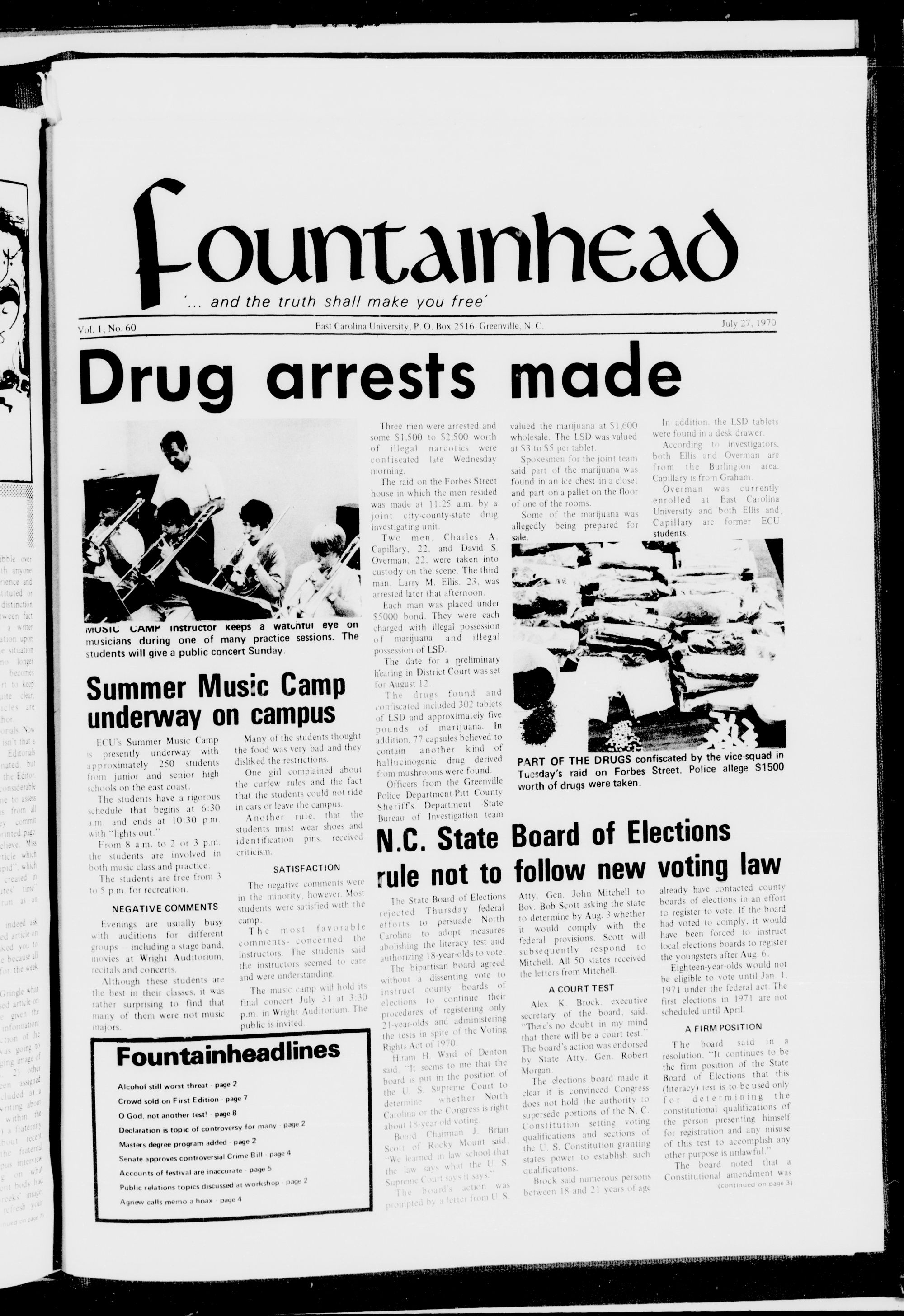 East Carolina's student-run campus newspaper was first published in 1923 as the East Carolina Teachers College News (1923-1925). It has been re-named as The Teco Echo (1925, 1926-1952), East Carolinian (1952-1969), Fountainhead (1969-1979), and The East Carolinian (1969, 1979-present). It includes local, state, national, and international stories with a focus on campus events.