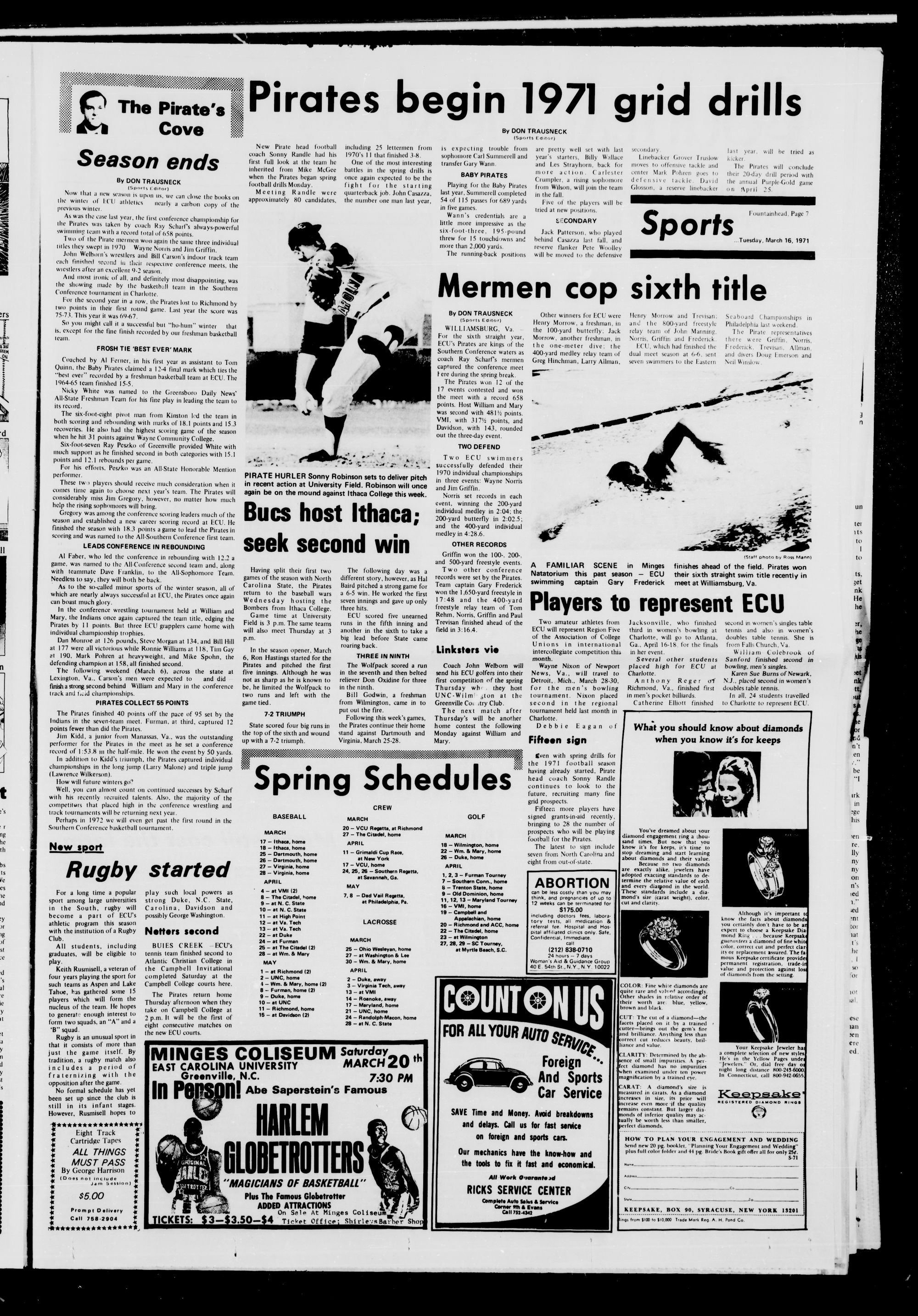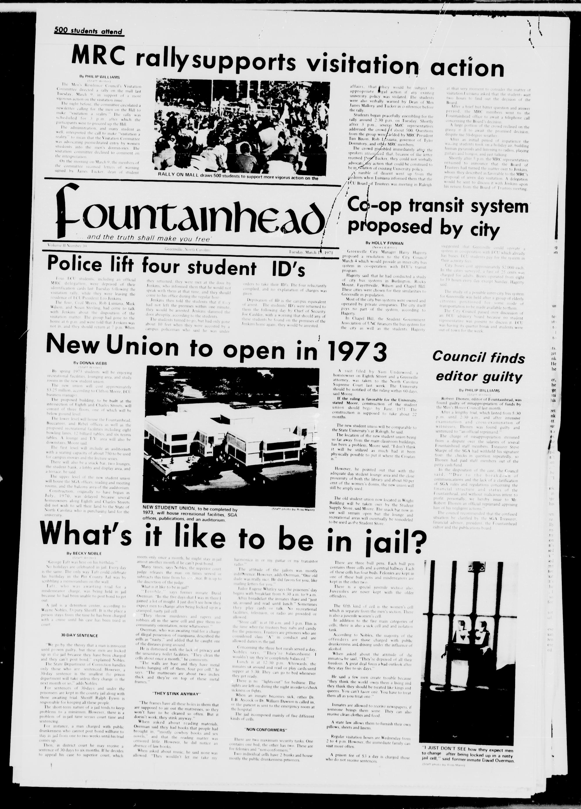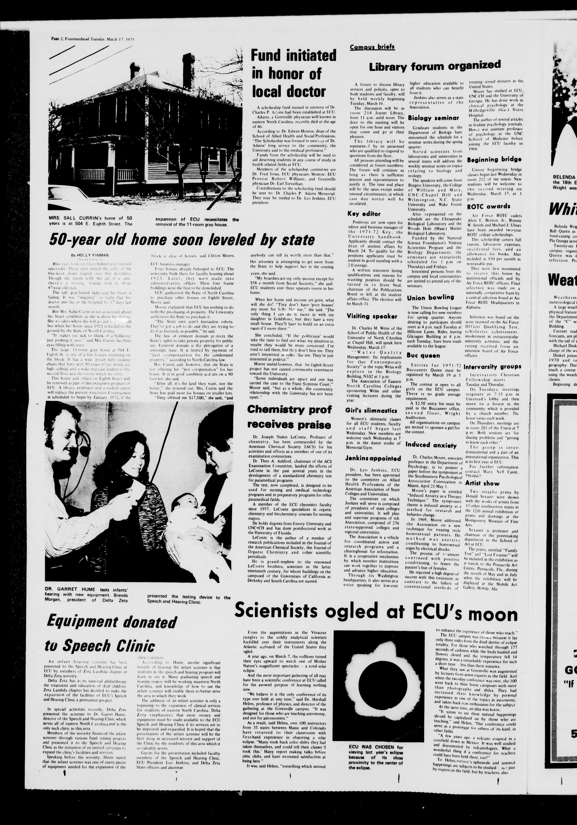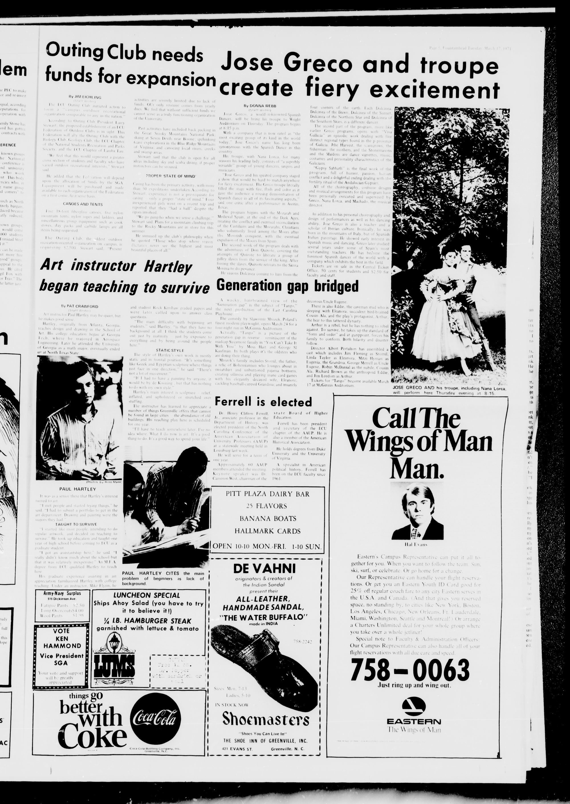 East Carolina's student-run campus newspaper was first published in 1923 as the East Carolina Teachers College News (1923-1925). It has been re-named as The Teco Echo (1925, 1926-1952), East Carolinian (1952-1969), Fountainhead (1969-1979), and The East Carolinian (1969, 1979-present). It includes local, state, national, and international stories with a focus on campus events.