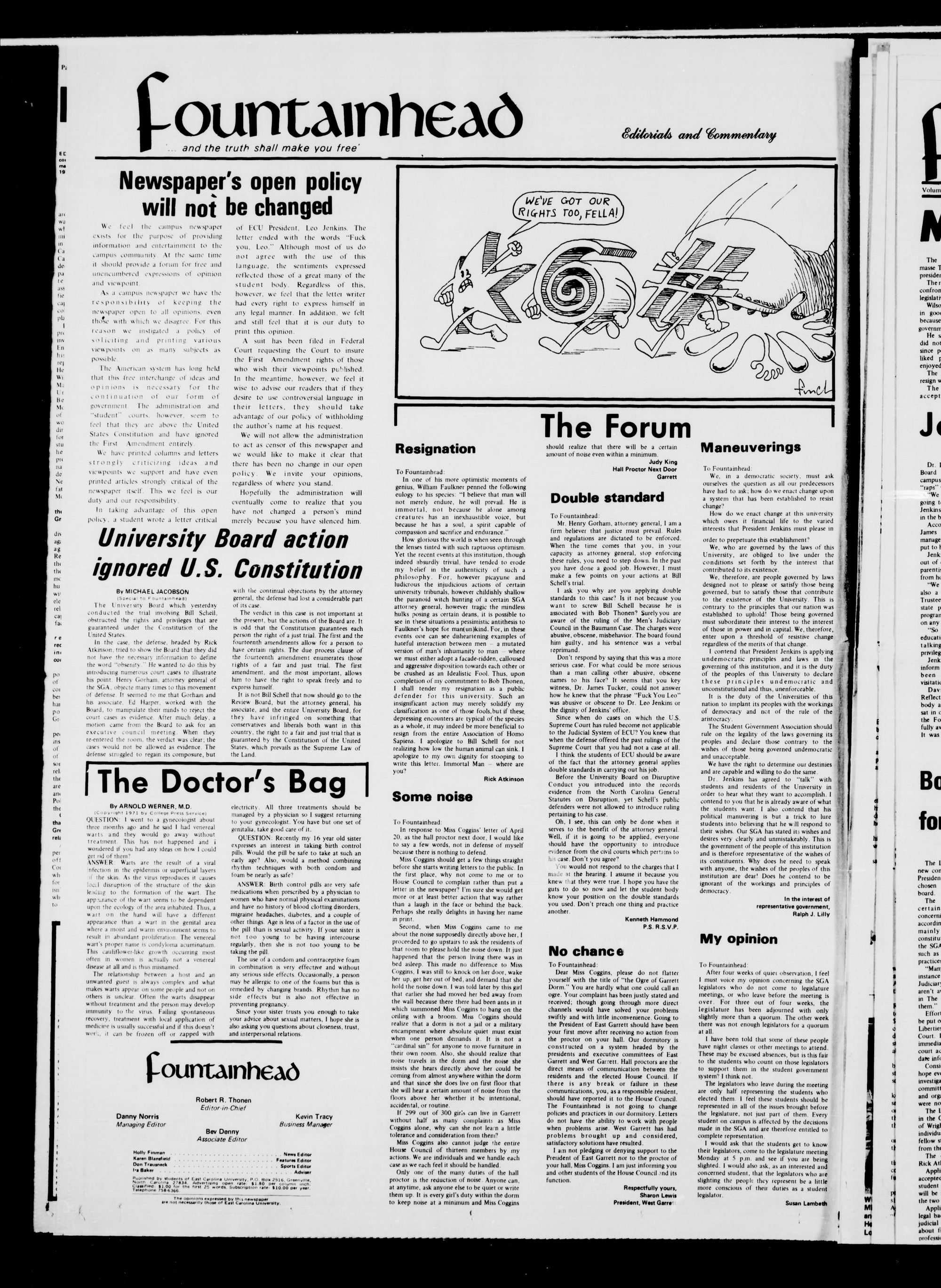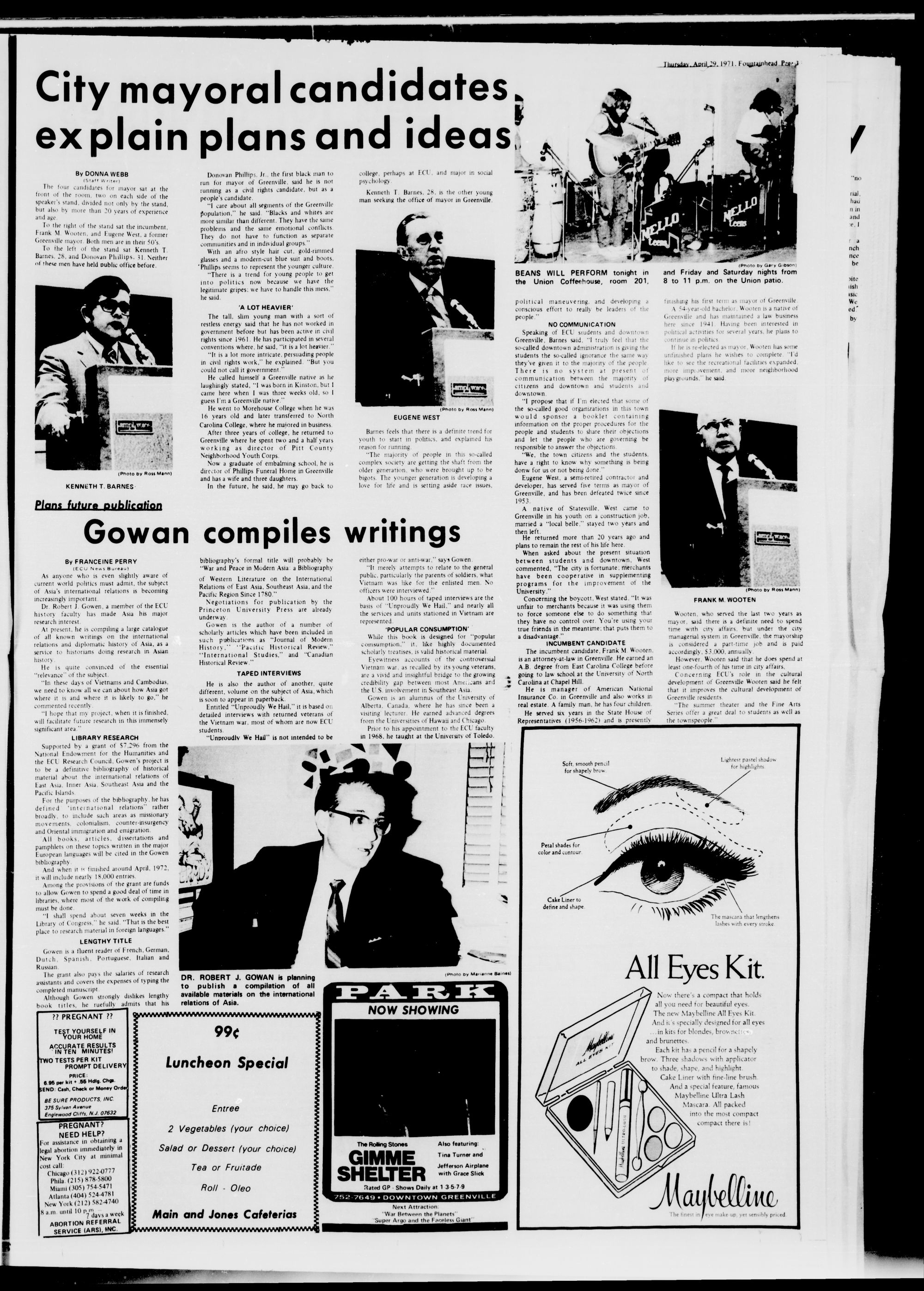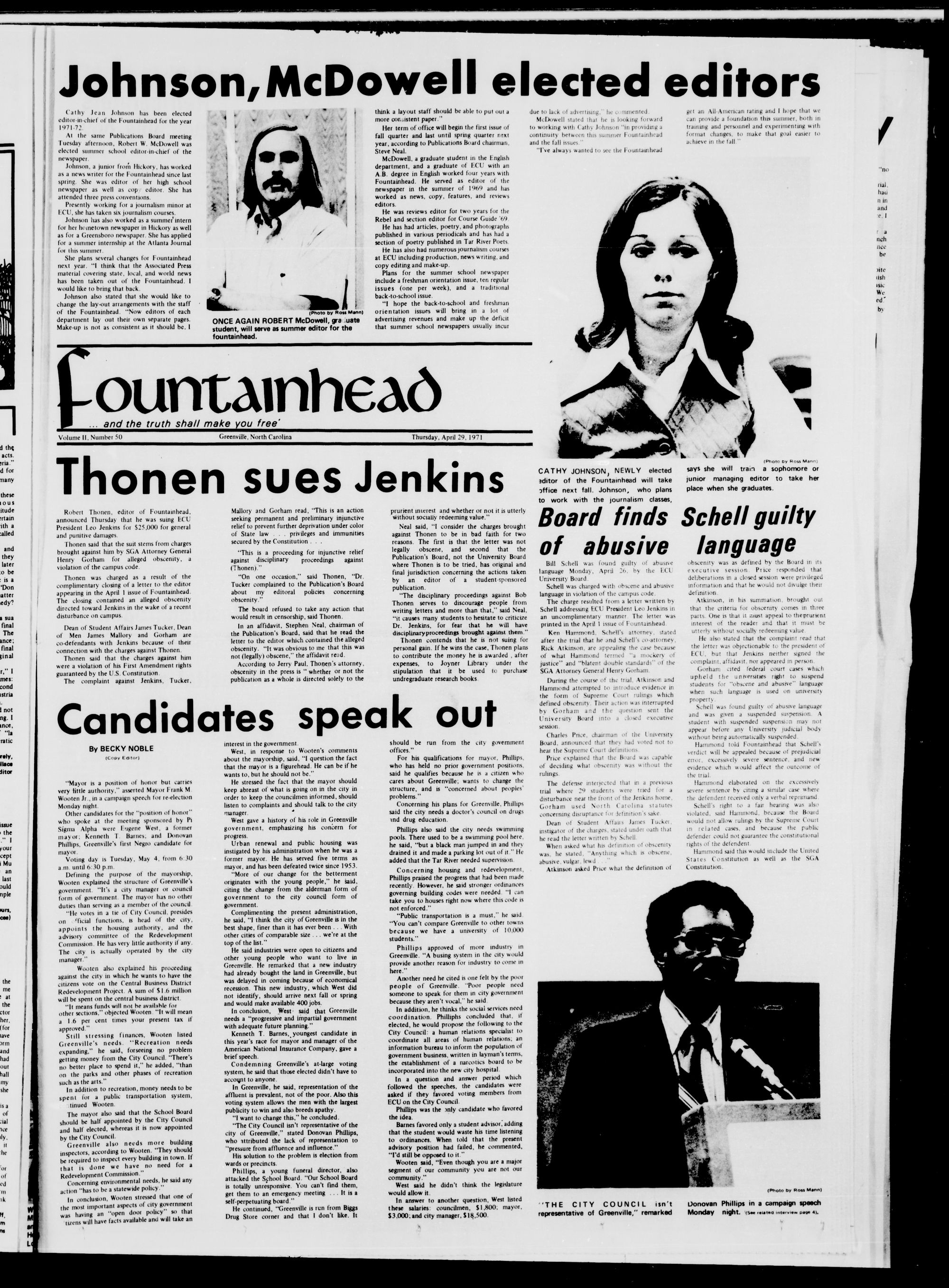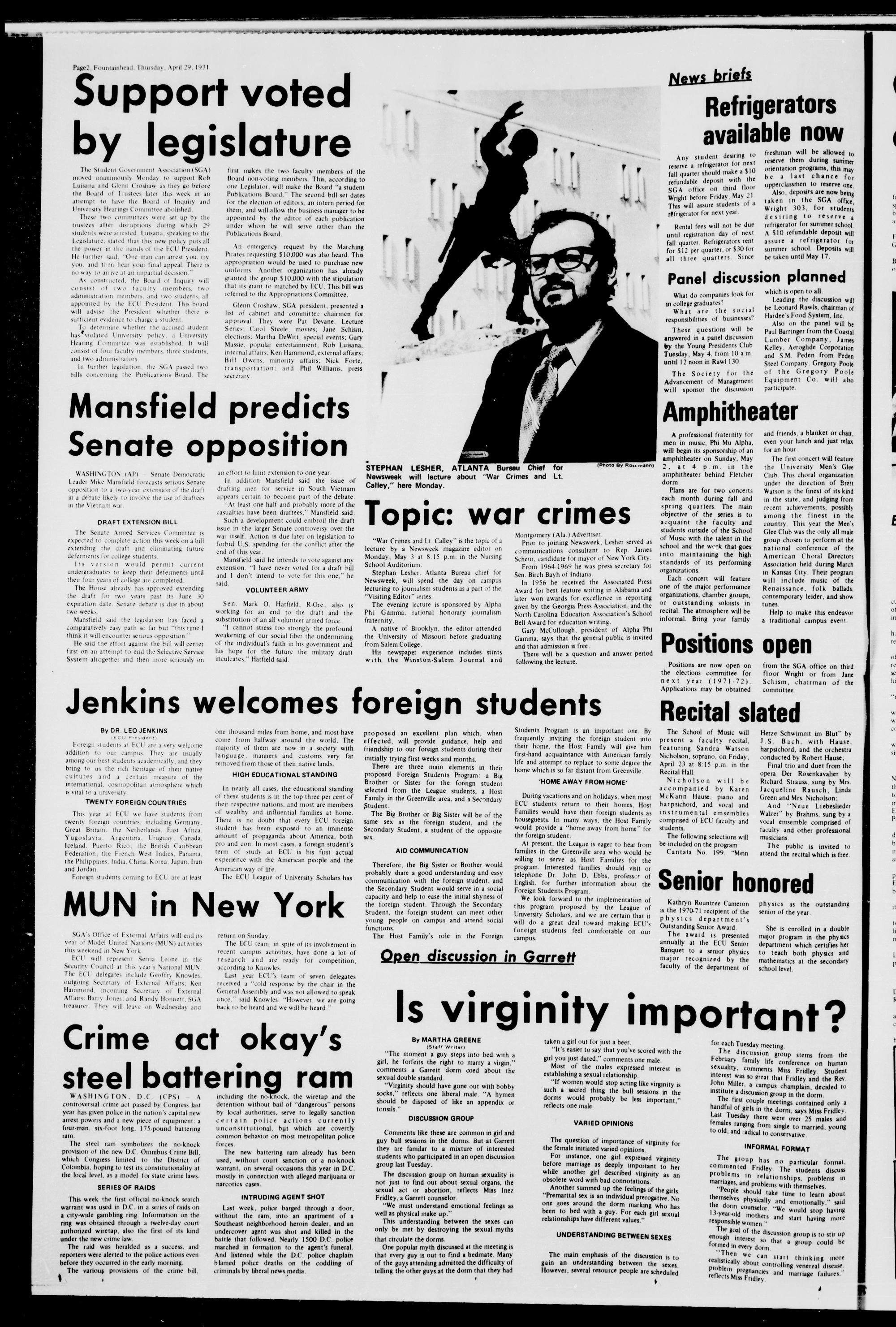 East Carolina's student-run campus newspaper was first published in 1923 as the East Carolina Teachers College News (1923-1925). It has been re-named as The Teco Echo (1925, 1926-1952), East Carolinian (1952-1969), Fountainhead (1969-1979), and The East Carolinian (1969, 1979-present). It includes local, state, national, and international stories with a focus on campus events.